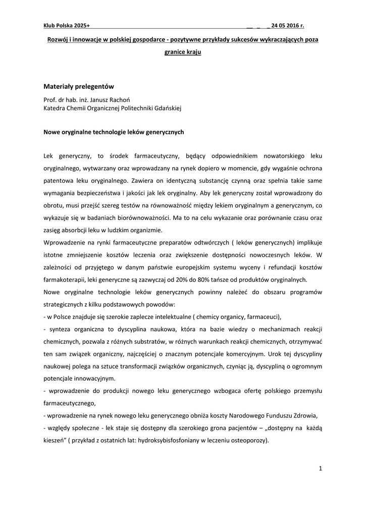 Klub Polska 2025+ __ _ _ 24 05 2016 r. Rozwój i innowacje w polskiej gospodarce - pozytywne przykłady sukcesów wykraczających poza granice kraju Materiały prelegentów Prof. dr hab. inż. Janusz Rachoń Katedra Chemii Organicznej Politechniki Gdańskiej Nowe oryginalne technologie leków generycznych Lek generyczny, to środek farmaceutyczny, będący odpowiednikiem nowatorskiego leku oryginalnego, wytwarzany oraz wprowadzany na rynek dopiero w momencie, gdy wygaśnie ochrona patentowa leku oryginalnego. Zawiera on identyczną substancję czynną oraz spełnia takie same wymagania bezpieczeństwa i jakości jak lek oryginalny. Aby lek generyczny został wprowadzony do obrotu, musi przejść szereg testów na równoważność między lekiem oryginalnym a generycznym, co wykazuje się w badaniach biorównoważności. Ma to na celu wykazanie oraz porównanie czasu oraz zasięg absorbcji leku w ludzkim organizmie. Wprowadzenie na rynki farmaceutyczne preparatów odtwórczych ( leków generycznych) implikuje istotne zmniejszenie kosztów leczenia oraz zwiększenie dostępności nowoczesnych leków. W zależności od przyjętego w danym państwie europejskim systemu wyceny i refundacji kosztów farmakoterapii, leki generyczne są zazwyczaj od 20% do 80% tańsze od produktów oryginalnych. Nowe oryginalne technologie leków generycznych powinny należeć do obszaru programów strategicznych z kilku podstawowych powodów: - w Polsce znajduje się szerokie zaplecze intelektualne ( chemicy organicy, farmaceuci), - synteza organiczna to dyscyplina naukowa, która na bazie wiedzy o mechanizmach reakcji chemicznych, pozwala z różnych substratów, w różnych warunkach reakcji chemicznych, otrzymywać ten sam związek organiczny, najczęściej o znacznym potencjale komercyjnym. Urok tej dyscypliny naukowej polega na sztuce transformacji związków organicznych, czyniąc ją, dyscypliną o ogromnym potencjale innowacyjnym. - wprowadzenie do produkcji nowego leku generycznego wzbogaca ofertę polskiego przemysłu farmaceutycznego, - wprowadzenie na rynek nowego leku generycznego obniża koszty Narodowego Funduszu Zdrowia, - względy społeczne - lek staje się dostępny dla szerokiego grona pacjentów – „dostępny na każdą kieszeń” ( przykład z ostatnich lat: hydroksybisfosfoniany w leczeniu osteoporozy). 1 Klub Polska 2025+ __ _ _ 24 05 2016 r. Rozwój i innowacje w polskiej gospodarce - pozytywne przykłady sukcesów wykraczających poza granice kraju Dr inż. Adam Piotrowski, prezes VIGO System S.A. Od pomysłu do biznesu – jak sprzedawać produkty wysokiej technologii za granicą? VIGO System S.A. jest technologiczną spółką produkcyjną, kładącą bardzo duży nacisk na działalność badawczo rozwojową, dzięki czemu spółka od wielu lat wytwarza i oferuje na rynku globalnym najbardziej zaawansowane technologicznie detektory podczerwieni. Spółka zajmuje czołową pozycję na światowym rynku niechłodzonych detektorów podczerwieni produkowanych od podstaw czyli budowaniu idealnie uporządkowanych atomów w strukturze kryształu a następnie wykonywanie z nich przyrządu, który generuje sygnał elektryczny zależny od padającego promieniowania. Zaawansowane produkty oferowane przez VIGO System S.A. dzięki unikalnym cechom pozwalającym na wygodną, bezobsługową prace znajdują zastosowanie w wielu zaawansowanych dziedzinach gospodarki. Detektory można znaleźć m.in. w takich aplikacjach jak: bezpieczeństwo w transporcie (wykrywanie stanów awaryjnych taboru kolejowego dużych prędkości podczas jazdy), ochrona środowiska (monitorowanie zanieczyszczeń atmosfery), energetyka (weryfikacja stanu infrastruktury przesyłowej energii elektrycznej), technika wojskowa (systemy obserwacyjno-celownicze na bezzałogowych obiektach latających, amunicja inteligentna i samonaprowadzająca), medycyna (wykrywanie na wczesnym etapie markerów chorób nowotworowych, zmian onkologicznych w tkankach miękkich lub zaburzeń w systemie krążenia krwi), motoryzacja (analiza składu spalin) oraz przemysł (monitorowanie i kontrola procesów chemicznych). Dodatkowo produkty VIGO System wykorzystywane są w badaniach naukowych w dziedzinie spektroskopii, techniki laserowej i kontrolowanej syntezy termojądrowej oraz aparaturze kosmicznej (precyzyjne analizatory atmosfery i gruntu na Marsie). Początki badań nad niechłodzonymi detektorami podczerwieni sięgają lat 70 XX wieku, kiedy to późniejsi założyciele Spółki opracowali nowatorską na skalę światową technologię produkcji fotonowych detektorów podczerwieni opartą o technologię epitaksji z fazy gazowej (VPE), z wykorzystaniem tellurku kadmowo-rtęciowego (MCT), które mogą pracować w temperaturze otoczenia, w odróżnieniu od produkowanych wcześniej na świecie detektorów wymagających chłodzenia ciekłym azotem. Opracowana technologia zrewolucjonizowała podejście do budowy detektorów podczerwieni, otworzyła nowe pola ich zastosowań i jednocześnie była fundamentem do powstania w późniejszym czasie Spółki. W tym czasie realizowane było wiele projektów badawczych na uczelniach ale nie było publicznego wsparcia na komercjalizacje tych badań. Badania mogły być finansowane jedynie z własnych środków a firma przez wiele lat balansowała na granicy płynności finansowej. W roku 2002 zespół badawczy opracował i wdrożył kolejny, doskonalszy rodzaj technologii produkcji detektorów oparty o metodę MOCVD. Decyzja o inwestycji w najnowocześniejszą aparaturę była najbardziej punktem zwrotnym dla rozwoju spółki. Na tym etapie inwestycje w specjalistyczną aparaturę technologiczną były niemożliwe do skredytowania przez banki. Luźne ale wieloletnie relacje z Wojskową Akademią Techniczną, wspólne ambicje intelektualne i niekonkurencyjne cele pozwoliły podjąć decyzję o wspólnym 2 Klub Polska 2025+ __ _ _ 24 05 2016 r. Rozwój i innowacje w polskiej gospodarce - pozytywne przykłady s