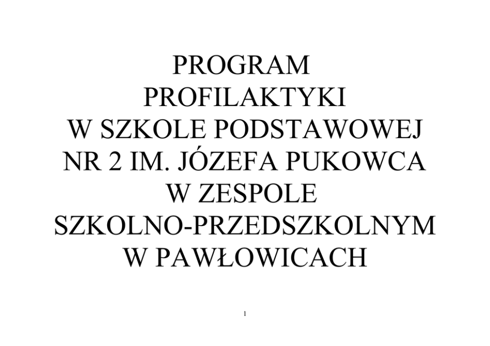 PROGRAM PROFILAKTYKI W SZKOLE PODSTAWOWEJ NR 2 IM. JÓZEFA PUKOWCA W ZESPOLE SZKOLNO-PRZEDSZKOLNYM W PAWŁOWICACH 1 Podstawa prawna: Ustawa z dnia 26 października 1982 r. o wychowaniu w trzeźwości i przeciwdziałaniu alkoholizmowi (Dz. U. z 2002r. Nr 147, poz. 1231 z póź. zm.) Ustawa z dnia 9 listopada 1995r. o ochronie zdrowia przed następstwami używania tytoniu i wyrobów tytoniowych (Dz. U. z 1996 r. Nr 10, poz. 55 z póź. zm.) Ustawa z dnia 29 lipca 2005 r. o przeciwdziałaniu narkomanii (Dz. U. z 2012 r., poz. 124) Rozporządzenie Rady Ministrów z dnia 22 marca 2011 r. w sprawie Krajowego programu Przeciwdziałania Narkomanii na lata 2011 – 2016 (Dz. U. z 2011 r. Nr 78, poz. 428) Rozporządzenie MENiS z dnia 31 stycznia 2002 r. zmieniające rozporządzenie w sprawie ramowych statutów publicznego przedszkola oraz publicznych szkół (Dz. U. z 2002 r. Nr 10, poz.96) Rozporządzenie MENiS z dnia 31 stycznia 2003 r. w sprawie szczegółowych form działalności wychowawczej i zapobiegawczej wśród dzieci i młodzieży zagrożonych uzależnieniem (Dz. U. Nr 26, poz.226) Rozporządzenie MEN z dnia 27 sierpnia 2012r. w sprawie podstawy programowej wychowania przedszkolnego oraz kształcenia ogólnego w poszczególnych typach szkół (Dz. U. z 2012 r. poz 977) Rozporządzenie MEN z dnia 30 kwietnia 2013 r. w sprawie zasad udzielania i organizacji pomocy psychologiczno-pedagogicznej w publicznych przedszkolach, szkołach i placówkach (Dz. U. z 2013 r. poz. 532) Rozporządzenie MEN z dnia 18 sierpnia 2015 r. (Dz. U. z 2015 r. poz. 1249) Szkolny Program Profilaktyki jest integralną częścią Programu Wychowawczego i jest realizowany w ramach każdej jednostki lekcyjnej oraz poza lekcjami. Jest zgodny z Rządowym programem wspomagania w latach 2015 – 2018 organów prowadzących szkoły w zapewnieniu bezpiecznych warunków nauki, wychowania i opieki w szkołach – „Bezpieczna +" oraz Gminnym Programem Przeciwdziałania Przemocy w Rodzinie oraz Ofiar Przemocy w Rodzinie na lata 2014-2020. Profilaktyka szkolna to działania mające na celu zapobieganie niepożądanym zjawiskom w rozwoju i zachowaniu się uczniów, ustalanie hierarchii wartości kształtującej relacje z innymi ludźmi, wspomaganie wychowawczej roli rodziny, dbający o prawidłowy rozwój uczniów oraz wskazujący sytuacje podejmowania działań interwencyjnych w sytuacji zdiagnozowanych zagrożeń. Najważniejsze zadania: 1. Promowanie zdrowego stylu życia i zdrowego odżywiania. 2. Informowanie o skutkach ryzykownych zachowań. 2 3. Wspieranie rozwoju zaspokajania własnych potrzeb. 4. Nawiązywanie prawidłowych relacji z rówieśnikami i dorosłymi. 5. Zdobywanie umiejętności radzenia sobie ze stresem i rozwiązywanie konfliktów. Szkoła prowadzi zajęcia profilaktyczne w ramach: 1. edukacji prozdrowotnej 2. edukacji psychospołecznej 3. edukacji do wartości 4. profilaktyki uzależnień CEL GŁÓWNY Zwiększenie skuteczności działań wychowawczych, edukacyjnych, informacyjnych i profilaktycznych wśród uczniów, ich rodziców (opiekunów) oraz nauczycieli i pracowników szkoły na rzecz bezpieczeństwa i tworzenia przyjaznego środowiska w szkole. CELE SZCZEGÓŁOWE 1. Kreowanie zdrowego, bezpiecznego i przyjaznego środowiska szkoły. 2. Zapobieganie problemom i sytuacjom problemowym uczniów. 3. Promowanie zdrowego stylu życia. 4. Mobilizowanie uczniów do systematycznego uczęszczania na zajęcia lekcyjne. 5. Kształtowanie hierarchii systemu wartości, w którym docenia się znaczenie zdrowia oraz poczucia sensu istnienia. SPODZIEWANE EFEKTY 1. Podwyższanie wyników w nauce i wzrost frekwencji na zajęciach szkolnych. 2. Umiejętność dokonywania właściwych wyborów w trudnych sytuacjach. 3. Świadomy udział uczniów w różnych formach spędzania czasu wolnego. 4. Uczniowie rozwijają swoje pasje i zainteresowania, potrafią współpracować w zespole, są wrażliwi na potrzeby innych. 5. Wzrost bezpieczeństwa na terenie szkoły. 6. Zapewnienie różnorodnej pomocy potrzebującym. 7. Lepsze relacje między uczniami – nauczycielami - rodzicami. 8. Większa świadomość zagrożeń wynikających z uzależnienia od papierosów, alkoholu, narkotyków, dopalaczy oraz zachowań behawioralnych. 9. Wykształcenie umiejętności wśród uczniów radzenia sobie z uzależnieniami i skutecznego szukania pomocy. 3 10. Zwrócenie uwagi uczniów na dbałość o swoje zdrowie i podejmowanie środków zaradczych w sytuacjach zagrożenia. 11. Kierowanie się w życiu ponadczasowymi wartościami etycznymi. 12. Wypracowanie zdrowych nawyków żywieniowych. W ramach programu profilaktyki szkolnej realizowane są zadania w oparciu o programy: - program MEN „Wyprawka szkolna” - program „Owoce i warzywa w szkole” - program „Mleko w szkole” - rządowy program „Pomoc państwa w zakresie dożywiania” - program przeciwdziałający uzależnieniom „Nie pal przy mnie proszę” dla klas I-III - program „Spójrz inaczej” dla klas IV-VI - program nauki pierwszej pomocy „Ratujemy i uczymy ratować” - program edukacji prozdrowotnej „Trzymaj formę” EDUKACJA PROZDROWOTNA Uczeń zna, rozumie: pojęcia: zdrowie, zdrowa dieta, hartowanie ciała i ducha, higiena BHP, czynny odpoczynek, choroba, niepełnosprawność zasady zdrowego odżywiania zasady bezpiecznego kontaktu ze zwierzętami inne niebezpieczeństwa istniejące w środowisku dziecka i sposoby ich unikania znaczenie sportu dla zdrowia człowieka Uczeń potrafi: dbać o własne zdrowie przewidywać skutki swoich zachowań unikać niebezpieczeństw korzystać z pomocy różnych instytucji (pogotowie, straż pożarna, policja) udzielać prostej pomocy przedmedycznej wykorzystać ruch w celu rozładowania napięcia psychicznego i odzyskania dobrego nastroju. 4 TREŚCI EDUKACJI PROZDROWOTNEJ TREŚCI ZDROWIE JAKO WARTOŚĆ ZDROWY STYL ŻYCIA HIGIENA OSOBISTA I HIGIENA ŚRODOWISKA BEZPIECZEŃSTW O W ŻYCIU CODZIENNYM RUCH TO ZDROWIE ZADANIA 1