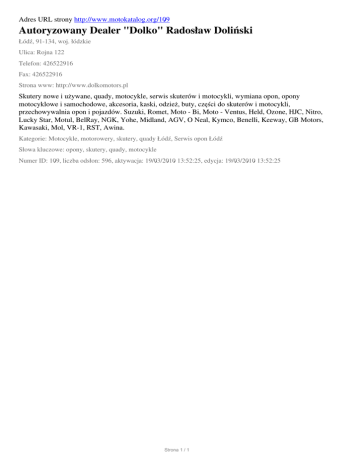 Adres URL strony http://www.motokatalog.org/109 Autoryzowany Dealer "Dolko" Radosław Doliński Łódź, 91-134, woj. łódzkie Ulica: Rojna 122 Telefon: 426522916 Fax: 426522916 Strona www: http://www.dolkomotors.pl Skutery nowe i używane, quady, motocykle, serwis skuterów i motocykli, wymiana opon, opony motocyklowe i samochodowe, akcesoria, kaski, odzież, buty, części do skuterów i motocykli, przechowywalnia opon i pojazdów. Suzuki, Romet, Moto - Bi, Moto - Ventus, Held, Ozone, HJC, Nitro, Lucky Star, Motul, BelRay, NGK, Yohe, Midland, AGV, O Neal, Kymco, Benelli, Keeway, GB Motors, Kawasaki, Mol, VR-1, RST, Awina. Kategorie: Motocykle, motorowery, skutery, quady Łódź, Serwis opon Łódź Słowa kluczowe: opony, skutery, quady, motocykle Numer ID: 109, liczba odsłon: 596, aktywacja: 19/03/2010 13:52:25, edycja: 19/03/2010 13:52:25 Strona 1 / 1