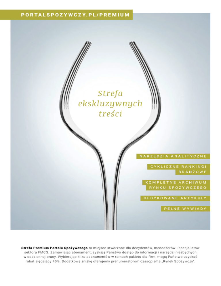 p o r t a l s p o z y w c z y. p l / p r e m i u m Strefa ekskluzywnych treści n a r z ę d z i a a n a l i t y c z n e c y k l i c z n e r a n k i n g i b r a n ż o w e k o m p l e t n e a r c h i w u m r y n k u s p o ż y w c z e g o d e d y k o w a n e a r t y k u ł y p e ł n e w y w i a d y Strefa Premium Portalu Spoży wczego to miejsce stworzone dla decydentów, menedżerów i specjalistów sek tora FMCG. Zamawiając abonament, zyskają Państwo dostęp do informacji i narzędzi niezbędnych w codziennej pracy. Wybierając kilka abonamentów w ramach pakietu dla firm, mogą Państwo uzyskać rabat sięgający 4 0%. Dodatkową zniżkę oferujemy prenumeratorom czasopisma „Rynek Spoż y wczy ”. +4 8 32 209 13 03 por talspozy wczy.pl/premium kontak t@por talspozy wczy.pl c e n n i k p o d s taw o w y Cena dostę pu dla jednego uż y tkownika jest uzależniona od liczby zamawianych abonamentów S tref y Premium. Im wię cej abonamentów w jednym zamówieniu, t ym wię ksz y rabat na każdy z nich – możesz z yskać nawet 4 0% . 1 abonament od 2 do 5 abonamentów 6 i więcej abonamentów 12 miesięcy 3 000 zł 2 400 zł 1 800 zł 6 miesięcy 2 300 zł 1 800 zł 1 300 zł 3 miesiące 1 600 zł 1 200 zł 1 000 zł 1 miesiąc 1 000 zł 800 zł 600 zł zamów Chcesz skor z ystać z ofer t y specjalnej? Napisz do nas: kontak t@por talspoz y wcz y.pl c e n n i k d l a p r e n u m e r at o r ó w cz asopism a ry n e k spoż y wcz y Cennik specjalny jest skierowany do osób, k tóre posiadają lub jednocześnie w ykupią prenumeratę czasopisma „ R ynek Spoż y wcz y ”. Jedna p ł atna prenumerata czasopisma to rabat dla jednego uż y tkownika na dostę p do S tref y Premium. Ofer ta dot ycz y jedynie prenumerat w ykupionych w w ydawnictwie. Cena dostę pu dla jednego uż y tkownika jest uzależniona od liczby posiadanych lub zamawianych prenumerat czasopisma oraz liczby zamawianych abonamentów S tref y Premium. Im wię cej abonamentów w jednym zamówieniu, t ym wię ksz y rabat na każdy z nich – możesz z yskać nawet 5 0% . najlepszy wybór 1 abonament od 2 do 5 abonamentów 6 i więcej abonamentów 12 miesięcy 2 700 zł 2 200 zł 1 500 zł 6 miesięcy 2 000 zł 1 600 zł 1 200 zł 3 miesiące 1 250 zł 1 000 zł 850 zł 1 miesiąc 900 zł 650 zł 550 zł Chcesz skorzystać z ofer ty dla prenumeratorów? Napisz do nas: kontak t@por talspoz y wcz y.pl Jeżeli chcą Państwo skorzystać z ofer ty specjalnej dla prenumeratorów czasopisma „Rynek Spożywczy” lub zamówić pakiet kilku abonamentów, prosimy o kontakt telefoniczny lub mailowy. Nasza infolinia jest czynna od poniedziałku do piątku w godzinach 9:00 -16:00. +4 8 32 209 13 03 por talspozy wczy.pl/premium kontak t@por talspozy wczy.pl s t r e fa p r e m i u m – w y b i e r z n a j l e p s z y pa k i e t Tylko roczny abonament S tref y Premium gwarantuje nieograniczony dostę p do wsz ystkich analiz, zestawień i rankingów. Dostę p do ak tualnych i archiwalnych rankingów branżow ych Dostę p do pe ł nej treści tekstów analit ycznych i cyklicznych rapor tów Super premium Premium Standard 12 miesię cy 1, 3, 6 miesię cy (brak pakietu S tref y Premium) Nieograniczony Brak dostę pu każdy ranking można kupić osobno Brak dostę pu każdy ranking można kupić osobno Nieograniczony Brak dostę pu analizę/rapor t można kupić osobno Brak dostę pu analizę/rapor t można kupić osobno Dostę p do pe ł nej treści autorskich wiadomości ser wisu por talspoz y wcz y.pl Nieograniczony Nieograniczony Ograniczony maksymalnie 20% zawar tości Dostę p do archiwum czasopisma R ynek Spoż y wcz y Nieograniczony Nieograniczony Brak dostę pu Dostę p do pr zedruków z bież ącego w ydania czasopisma R ynek Spoż y wcz y Nieograniczony Nieograniczony Brak dostę pu Dostę p do sekcji ceny ż y wności – r ynek hur tow y Nieograniczony Nieograniczony Brak dostę pu do notowań archiwalnych Dostę p do sekcji ceny ż y wności – r ynek detaliczny (kosz yk cenow y) Nieograniczony Nieograniczony Brak dostę pu do notowań archiwalnych Bez limitów Brak możliwości pobrania i zapisania jakichkolwiek danych Bez limitów Bez limitów Maksymalnie 10 aler tów w ramach konta zamów zamów Nar zę dzia pozwalające pobrać samodzielnie zdefiniowany pakiet danych z sekcji: ceny ż y wności – r ynek hur tow y, ceny ż y wności – r ynek detaliczny (kosz yk cenow y), w formacie xls, pdf lub html Możliwoś ć zamówienia dodatkow ych aler tów ser wisu por talspoz y wcz y.pl Bez limitów +4 8 32 209 13 03 kontak t@por talspozy wczy.pl por talspozy wczy.pl/premium jak uz ysk ać dostęp do stref y premium? Zarejestruj konto w por talu lub zaloguj się, korzystając z dotychczasowego konta uż y tkownika. Wybierz jeden z dostępnych wariantów i kliknij „ Zamów”. W zależności od w ybranej metody p łatności: dokonaj wp łaty e-przelewem lub kartą za pomocą ser wisu przelew y 24.pl lub w ykonaj tradycyjny przelew na rachunek wskazany na fak turze. 01 02 Po zalogowaniu przejdź do zakładki „Nasze produk ty” i znajdź usługę, k tórą zamierzasz kupić. Rozwiń listę „Pokaż wszystkie opcje”. 04 Wybierz metodę płatności i uzupełnij niezbędne dane (np. do fak tur y). 06 Po dokonaniu p łatności otrzymasz potwierdzenie ak ty wacji dostępu do w ybranej usługi. Zaloguj się i korzystaj z op łaconych zasobów. 03 05 m a s z p y ta n i a? z a d z w o ń l u b n a p i s z Nasza infolinia jest czynna od poniedziałku do piątku w godzinach 9:00 -16:00. + 4 8 3 2 2 0 9 13 0 3 k o n t a k t @ p o r t a l s p o z y w c z y. p l