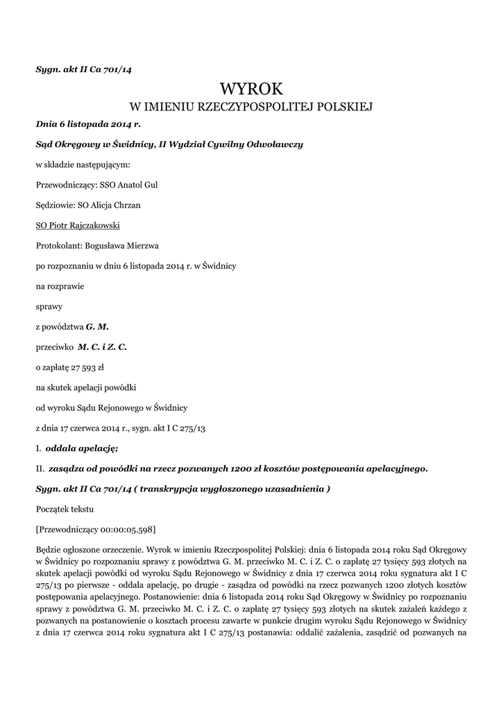 Sygn. akt II Ca 701/14 WYROK W IMIENIU RZECZYPOSPOLITEJ POLSKIEJ Dnia 6 listopada 2014 r. Sąd Okręgowy w Świdnicy, II Wydział Cywilny Odwoławczy w składzie następującym: Przewodniczący: SSO Anatol Gul Sędziowie: SO Alicja Chrzan SO Piotr Rajczakowski Protokolant: Bogusława Mierzwa po rozpoznaniu w dniu 6 listopada 2014 r. w Świdnicy na rozprawie sprawy z powództwa G. M. przeciwko M. C. i Z. C. o zapłatę 27 593 zł na skutek apelacji powódki od wyroku Sądu Rejonowego w Świdnicy z dnia 17 czerwca 2014 r., sygn. akt I C 275/13 I. oddala apelację; II. zasądza od powódki na rzecz pozwanych 1200 zł kosztów postępowania apelacyjnego. Sygn. akt II Ca 701/14 ( transkrypcja wygłoszonego uzasadnienia ) Początek tekstu [Przewodniczący 00:00:05.598] Będzie ogłoszone orzeczenie. Wyrok w imieniu Rzeczpospolitej Polskiej: dnia 6 listopada 2014 roku Sąd Okręgowy w Świdnicy po rozpoznaniu sprawy z powództwa G. M. przeciwko M. C. i Z. C. o zapłatę 27 tysięcy 593 złotych na skutek apelacji powódki od wyroku Sądu Rejonowego w Świdnicy z dnia 17 czerwca 2014 roku sygnatura akt I C 275/13 po pierwsze - oddala apelację, po drugie - zasądza od powódki na rzecz pozwanych 1200 złotych kosztów postępowania apelacyjnego. Postanowienie: dnia 6 listopada 2014 roku Sąd Okręgowy w Świdnicy po rozpoznaniu sprawy z powództwa G. M. przeciwko M. C. i Z. C. o zapłatę 27 tysięcy 593 złotych na skutek zażaleń każdego z pozwanych na postanowienie o kosztach procesu zawarte w punkcie drugim wyroku Sądu Rejonowego w Świdnicy z dnia 17 czerwca 2014 roku sygnatura akt I C 275/13 postanawia: oddalić zażalenia, zasądzić od pozwanych na rzecz powódki 150 złotych kosztów postępowania zażaleniowego. Proszę usiąść. Uprzedzam, że będzie wygłoszone uzasadnienie w sprawie II Ca 701/14. Proszę. [Sędzia sprawozdawca 00:01:40.348] Sąd Okręgowy podziela ustalenia faktyczne jak i stanowisko sądu I instancji co do braku podstaw do uwzględniania, do uwzględnienia żądania powódki w niniejszej sprawie a skarżącej stanowisko Sądu Rejonowego w żaden skuteczny sposób nie podważa. Sąd Okręgowy w całości podziela argumentację uzasadnienia zaskarżonego wyroku co do przyjęcia, że sprzedaż samochodu przez pozwanych nie nastąpiła w ramach prowadzonej przez nich działalności gospodarczych, a apelacja powtarzając stanowisko, jego motywy prezentowane w postępowaniu pierwszo - instancyjnym stanowi jedynie nieuzasadnioną polemikę z przekonywującym uzasadnieniem Sądu Rejonowego. W szczególności przekonują takie okoliczności jak: wystawienie samochodu do sprzedaży w komisie u osoby trzeciej, wcześniejsze osobiste używanie auta przez M. C., niewykazanie, co również wynika ze zgromadzonego w sprawie materiału, dochodu ze sprzedaży auta w ramach prowadzonej działalności czy wreszcie brak zarejestrowania pozwanych jako podatników VAT co by musiało mieć miejsce w sytuacji prowadzenia przez nich sprzedaży samochodu w ramach prowadzonej przez nich działalności, stąd też pierwszy z zarzutów apelacji należało uznać za... należało uznać za całkowicie pozbawiony podstaw. Również drugi zarzut apelacji co do naruszenia artykułu 563 paragraf 1 i 3 kodeksu cywilnego nie był uzasadniony a po części jest on wynikiem, jak się wydaje, niezrozumienia uzasadnienia Sądu Rejonowego. Sąd Rejonowy przyjął bowiem, bowiem, że powódka wprawdzie zgłaszała w rozmowach telefonicznych pozwanemu M. C. wskazywane przez nią wady pojazdu jednak okaliczność ta, okoliczność ta o tyle w niniejszej sprawie była pozbawiona znaczenia, że jak prawidłowo przyjął Sąd Rejonowy, samo wykonanie przez skarżącą uprawnień z rękojmi - i to jest odstąpienie od umowy - miało miejsce po upływie terminu rocznego przewidzianego w artykule 568 paragraf 1 kc. Ta zaś okoliczność wynikała jednoznacznie z treści złożonych przez samą powódkę oświadczeń o odstąpieniu i dowodów ich doręczenia, a zebrany w sprawie materiał nie dawał żadnych podstaw do przyjęcia wcześniejszego złożenia przez nią jednoznacznego i kategorycznego oświadczenia o tym, o tymże odstąpieniu. Zgodnie zaś z artykułem 568 paragraf 3 kc zarzut z tytułu rękojmi może być podniesiony także po upływie powyższych terminów, zatem terminu rocznego w odniesieniu do samochodu, jeżeli przed ich upływem kupujący zawiadomi sprzedawcę o wadzie. Przepis artykułu 568 paragraf 3 kc zezwala zatem na podniesienie zarzutu z tytułu rękojmi po upływie terminów, w ciągu których mogą być wykonywane uprawnienia z tytułu rękojmi, jeżeli przed ich upływem kupujący zawiadomi sprzedawcę o wadzie. Według powszechnie przyjętego rozumienia tego przepisu odnosi się on do sytuacji gdy sprzedawca dochodzi od kupującego przysługujących mu roszczeń, na przykład, o zapłatę. Przepis ten nie ma zaś zastosowania do wykonywania przez kupującego względem sprzedawcy uprawnień z tytułu rękojmi. Zawiadomienie zatem sprzedawcy o wadliwości przedmiotu sprzedaży przed upływem terminu zawitego z artykułu 568 paragraf 1 kc otwiera jedynie kupującemu możliwość podniesienia zarzutu z rękojmi przed roszczeniami sprzedawcy z samej umowy sprzedaży i to jest artykuł 568 paragraf 3 kc, nie otwiera mu natomiast, co najistotniejsze, drogi do dochodzenia na tej podstawie roszczenia. Takie też stanowisko jest powszechnie akceptowane w orzecznictwie jak i w piśmiennictwie prawniczym i wyrażone, między innymi, w orzeczeniach Sądu Najwyższego z 15 kwietnia 2003 roku V CKN 100/01, wyroku Sądu Apelacyjnego w Warszawie z 30 listopada 2006 roku, sygnatura I ACa 705/06, w wyroku Sądu Najwyższego z 14 stycznia 2014 roku, sygnatura I CK 42/03. Nie są również uzasadnione zarzuty apelacji dotyczące naruszenia prze... naruszenia przepisu artykułu 568 paragraf 1 i 2 kc. W pierwszej kolejności należy zauważyć, że z zebranych w sprawie dowodów wynika, iż powódka 