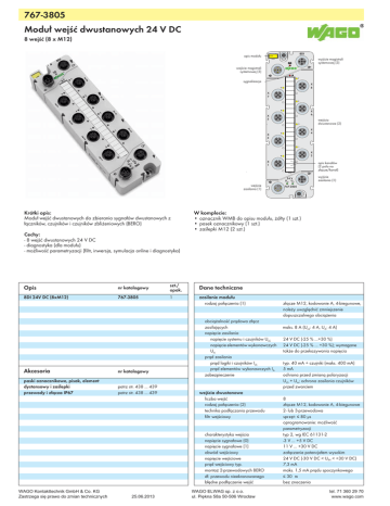 767-3805 2 388 Moduł wejść dwustanowych 24 V DC 8 wejść (8 x M12) 8DI opis modułu wyjście magistrali systemowej (3) wejście magistrali systemowej (3) 7 sygnalizacja X 8 6 X 7 5 4 X 6 X 5 wejścia dwustanowe (2) 3 X 3 X 4 2 1 X 2 0 X 1 opis kanałów (2 pola na złącze/kanał) 24 V ULS UA wejście zasilania (1) Krótki opis: Moduł wejść dwustanowych do zbierania sygnałów dwustanowych z łączników, czujników i czujników zbliżeniowych (BERO) wyjście zasilania (1) 767-3805 W komplecie: • oznacznik WMB do opisu modułu, żółty (1 szt.) • pasek oznacznikowy (1 szt.) • zaślepki M12 (2 szt.) Cechy: - 8 wejść dwustanowych 24 V DC - diagnostyka (dla modułu) - możliwość parametryzacji (filtr, inwersja, symulacja online i diagnostyka) Opis nr katalogowy szt./ opak. Dane techniczne 8DI 24V DC (8xM12) 767-3805 1 zasilanie modułu rodzaj połączenia (1) Akcesoria nr katalogowy paski oznacznikowe, pisak, element dystansowy i zaślepki przewody i złącza IP67 patrz str. 438 ... 439 patrz str. 438 ... 439 obciążalność prądowa złącz zasilających napięcie zasilania napięcie systemu i czujników ULS napięcie elementów wykonawczych UA prąd zasilania prąd logiki i czujników ILS prąd elementów wykonawczych IA zabezpieczenie wejścia dwustanowe liczba wejść rodzaj połączenia (2) technika podłączania przewodu filtr wejściowy charakterystyka wejścia napięcie sygnałowe (0) napięcie sygnałowe (1) obwód wejściowy napięcie wejściowe prąd wejściowy typ. montaż 2-przewodowych BERO dł. przewodu nieekranowanego błędne podłączenie wejść :$*2.RQWDNWWHFKQLN*PE+&R.* :$*2(/:$*VS]RR =DVWU]HJDVLĊSUDZRGR]PLDQWHFKQLF]Q\FK XO3LĊNQDD:URFáDZ złącze M12, kodowanie A, 4-biegunowe, należy uwzględnić zmniejszenie dopuszczalnego obciążenia maks. 8 A (ULS: 4 A, UA: 4 A) 24 V DC (-25 % ...+30 %) 24 V DC (-25 % ... +30 %); wymagane także do przekazywania napięcia typ. 40 mA + czujniki (maks. 400 mA) 5 mA ochrona przed zmianą polaryzacji ULS + UA; ochrona zasilania czujników przed zwarciem 8 złącze M12, kodowanie A, 4-biegunowe 2- lub 3-przewodowa sprzęt: ≤ 80 μs oprogramowanie: możliwość parametryzacji typ 2, wg IEC 61131-2 -3 V ... +5 V DC 11 V ... +30 V DC załączanie potencjałem wysokim 24 V DC (-30 V DC < UIN < +30 V DC) 7,3 mA maks. 1,5 mA prądu spoczynkowego ≤ 30 m bez znaczenia WHO ZZZZDJRFRP 2 389 magistrala systemowa wejście wyjście M12, kodowanie B 1: RD+/TD+ 2: RD--/TD-3: TD--/RD-4: TD+/RD+ 5: GND Housing: Shield Schemat blokowy wejścia wejścia dwustanowe X1 ... X8 zasilanie M12 diagnostyka wejścia dwustanowe X1 ... X8 M12, kodowanie A zasilanie wejście wyjście 1: 24 V 3: 0 V ULS M12 logika wejście 0 ... 7 4: Input 2: n.c. błąd F 1: 24 V ULS 2: 24 V UA 3: 0 V ULS 4: 0 V UA mocowanie modułu M12, kodowanie A Dane techniczne charakterystyka wejścia napięcie wejściowe -30 V DC < Uin < 0 V DC 5V 11 V 24 V 30 V magistrala systemowa rodzaj połączenia (3) normy i aprobaty r UL 508 znak zgodności Dane techniczne typowy prąd wejściowy 0 2,4 mA 6,4 mA 7,3 mA 7,4 mA złącze M12, kodowanie B, 5-biegunowe, ekranowane 1 izolacja kanał - kanał ULS, UA, magistrala systemowa funkcje parametryzowalne filtr wejściowy (dla kanału) inwersja (dla kanału) symulacja online (dla kanału) symulacja online (dla modułu) diagnostyka I/O diagnostyka I/O (dla modułu) obraz procesu reprezentacja w obrazie procesu sygnalizacja SB : status magistrali systemowej F : status błędu 0 ... 7 : status sygnału na wejściach ULS + UA : status zasilania sygnalizacja brak po 500 V DC 0,1/ 0,5/ 3 /15 /20 ms/ filtr wyłączony zał./wył. blokada/udostępnienie; wartość symulacji: 0/1 diagnostyka zwarcie przewodu zasilającego czujnik spadek napięcia poniżej zakresu (ULS + UA) 1 bajt dane + status LED (zielona / czerwona / pomarańczowa) LED (czerwona) LED (żółta) LED (zielona) bez podtrzymania Dane ogólne wymiary (mm) S x H x G ciężar 50 x 35,7 x 170 na zapytanie 2