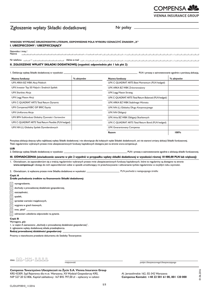 Zg∏oszenie wp∏aty Sk∏adki dodatkowej Zg∏oszenie wp∏aty Sk∏adki dodatkowej Nr polisy Nr polisy WYPE¸NIĆ DRUKOWANYMI D¸UGOPISEM, DRUKOWANYMI LITERAMI, ODPOWIEDNIE WYBORU OZNACZYĆ WNIOSEK WYPEŁNIĆ LITERAMI, ODPOWIEDNIE POLA WYBORUPOLA OZNACZYĆ ZNAKIEM „X” ZNAKIEM „X“ I. UBEZPIECZONY / UBEZPIECZAJĄCY WNIOSEK WYPE¸NIĆ D¸UGOPISEM, DRUKOWANYMI LITERAMI, ODPOWIEDNIE POLA WYBORU OZNACZYĆ ZNAKIEM „X“ I. UBEZPIECZONY / UBEZPIECZAJĄCY Nazwisko i imię / Nazwa Nazwisko i imię / Nazwa Nr telefonu Adres e-mail II. WPŁATY SKŁADKI DODATKOWEJ Nr ZGŁOSZENIE telefonu Adres e-mail(wypełnić odpowiednio pkt 1 lub pkt 2) II. ZGŁOSZENIE WPŁATY SKŁADKI DODATKOWEJ (wypełnić odpowiednio pkt 1 lub pkt 2) 1. Deklaruję wp∏atę Sk∏adki dodatkowej w wysokości Nazwa funduszu 1.Nazwa Deklaruję wp∏atę Sk∏adki dodatkowej w wysokości funduszy FK CŻ/Afunduszu Akcji4) Nazwa UFK ARKA BZ WBK Akcji Polskich 4) 50 Małych i Średnich Spółek4) UFK Investor Top FK CŻ/A AkcjiTop UFK Investor 50 Małych i Średnich Spółek 4) UFK Investor Skarbiec Top Akcja UFK 50 Małych i Średnich Spółek4) UFK Skarbiec Akcja 4) UFK Legg Mason Akcji UFK Legg Skarbiec Akcja UFK Mason Akcji 1) UFK Legg ARTSMason Best Momentum UFK Akcji UFK C-QUADRAT ARTS Total Return Dynamic 2) 1) UFK Return Dynamic UFK ARTS ARTS Total Best Momentum UFK Compensa/HSBC GIF BRIC Equity UFK ARTS Compensa/HSBC BRIC 2)Equity UFK Total ReturnGIF Dynamic UFK UniKorona Akcje UFK UniKorona Akcje UFK Compensa/HSBC GIF BRIC Equity UFK BPH Subfundusz Globalny Żywności i Surowców 4) UFK UniKorona BPH Subfundusz UFK Akcje Globalny Żywności i Surowców UFK C-QUADRAT ARTS Total Return Flexible (PLN hedged) UFK ARTS Total Return Flexible UFK C-QUADRAT BPH Subfundusz Globalny Żywności i Surowców4) UFK NN (L) Globalny Spółek Dywidendowych UFK C-QUADRAT ARTS Total Return Flexible PLN i proszę o zainwestowanie zgodnie z poniższą alokacją. Nazwa funduszu % aktywów PLN i proszę o zainwestowanie%zgodnie z poniższą alokacją. Nazwa funduszy aktywów UFK INGfunduszu (L) Globalny Społek Dywidendowych Nazwa % aktywów UFK C-QUADRAT ARTS Best Momentum (PLN hedged) UFK CŻ/A Zrównoważony UFK ARKA ING (L) Społek Dywidendowych UFK BZGlobalny WBK Zrównoważony UFK CŻ/A Legg Mason Strateg UFK Zrównoważony UFK Legg Mason Strateg 3) UFK Total Return UFK ARTS Legg Mason StrategBalanced UFK C-QUADRAT ARTS Total Return Balanced (PLN hedged) UFK ARTS CŻ/A Stabilnego Wzrostu UFK Total Return Balanced3) UFK ARKA BZ WBK Stabilnego Wzrostu UFK ING Globalny Długu Korporacyjnego UFK CŻ/A Stabilnego Wzrostu UFK NN (L) Globalny Długu Korporacyjnego UFK ING ING Globalny Obligacji Długu Korporacyjnego UFK UFK NN Obligacji UFK Arka BZ WBK Obligacji Skarbowych UFK ING Obligacji UFK Arka BZ WBK Obligacji Skarbowych UFK Arka C-QUADRAT Total Return Bond UFK BZ WBK ARTS Obligacji Skarbowych UFK C-QUADRAT ARTS Total Return Bond (PLN hedged) UFK Gwarantowany Compensa UFK C-QUADRAT ARTS Total Return Bond UFK Gwarantowany Compensa Razem 100% UFK Gwarantowany Compensa Razem 100% Powyższa alokacja dotyczy tylko najbliższej wpłaty Składki dodatkowej i nie obowiązuje dla kolejnych wpłat Składek dodatkowych, ani nie stanowi zmiany alokacji Składki funduszowej. Razem 100% Treść regulaminów wybranych przeze mnie ubezpieczeniowych funduszy kapitałowych dostępna jest na stronie www.compensa.pl Powyższa alokacja dotyczy tylko najbliższej wpłaty Składki dodatkowej i nie obowiązuje dla kolejnych wpłat Składek dodatkowych, ani nie stanowi zmiany alokacji Składki funduszowej. LUB Treść regulaminów wybranych przeze mnie ubezpieczeniowych funduszy kapitałowych dostępna jest na stronie www.compensa.pl. 2. Deklaruję wp∏atę Sk∏adki dodatkowej w wysokości PLN i proszę o zainwestowanie zgodnie z alokacją sk∏adki funduszowej. LUB III. OŚWIADCZENIA zawarte w pkt 2 wypełnić w przypadku wpłaty składki dodatkowej w wysokości równejzgodnie 10 000,00 PLN lub większej) 2. Deklaruję wp∏atę Sk∏adki(oświadczenie dodatkowej w wysokości PLN i proszę o zainwestowanie z alokacją sk∏adki funduszowej. % aktywów % aktywów % aktywów 1. Oświadczam, że zapoznałem/am się z treścią regulaminów przeze mnie ubezpieczeniowych funduszy kapitałowych, które to regulaminy stronie III. OŚWIADCZENIA (oświadczenie zawarte w pkt wybranych 2 wypełnić w przypadku wpłaty składki dodatkowej w wysokości równej są 10dostępne 000,00na PLN lub większej) www.compensa.pl i dostęp do nich zapewniłem/am sobie w sposób umożliwiający mi przechowywanie i odtwarzanie tychże regulaminów w zwykłym toku czynności. 1. Oświadczam, że zapoznałem/am się z treścią regulaminów wybranych przeze mnie ubezpieczeniowych funduszy kapitałowych, które to regulaminy są dostępne na stronie i dostęp do nich zapewniłem/am sobie w umożliwiający mi przechowywanie i odtwarzanie tychże regulaminów źródła: w zwykłym toku czynności. 2. www.compensa.pl Oświadczam, iż wpłacona przeze mnie Składka dodatkowa w sposób wysokości PLN pochodzi z następującego Część A 2. Oświadczam, iż wpłacona przeze mnie Składka dodatkowa w wysokości Źródło pochodzenia środków na finansowanie Składki dodatkowej: Część A wynagrodzenie, Źródło pochodzenia środków na finansowanie Składki dodatkowej: PLN PLNpochodzi pochodziz znastępującego następującegoźródła: źródła: dochody z prowadzonej działalności gospodarczej, wynagrodzenie, oszczędności, dochody z prowadzonej działalności gospodarczej, spadek, oszczędności, sprzedaż wartości majątkowych, spadek, wygrana w grach losowych, sprzedaż wartości majątkowych, inne, jakie? wygrana w grach losowych, odmawiam udzielenia odpowiedzi na pytanie. inne, jakie? Część B odmawiam udzielenia odpowiedzi na pytanie. Wymagana, gdy: Część B 1. w części A zaznaczono „dochody z prowadzonej działalności gospodarczej”, Wymagana, 2. zgłoszeniegdy
