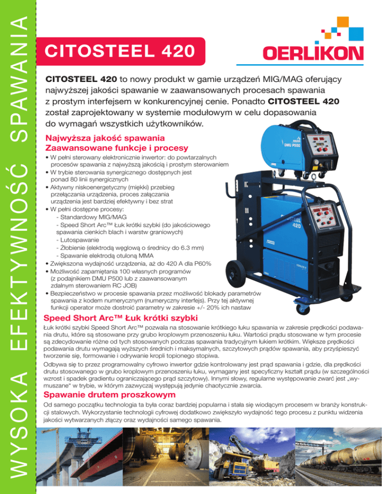 W Y S O K A E F E K T Y W N O Ś Ć S PAWA N I A CITOSTEEL 420 CITOSTEEL 420 to nowy produkt w gamie urządzeń MIG/MAG oferujący najwyższej jakości spawanie w zaawansowanych procesach spawania z prostym interfejsem w konkurencyjnej cenie. Ponadto CITOSTEEL 420 został zaprojektowany w systemie modułowym w celu dopasowania do wymagań wszystkich użytkowników. Najwyższa jakość spawania Zaawansowane funkcje i procesy • W pełni sterowany elektronicznie inwertor: do powtarzalnych procesów spawania z najwyższą jakością i prostym sterowaniem • W trybie sterowania synergicznego dostępnych jest ponad 80 linii synergicznych • Aktywny niskoenergetyczny (miękki) przebieg przełączania urządzenia, proces załączania urządzenia jest bardziej efektywny i bez strat • W pełni dostępne procesy: - Standardowy MIG/MAG - Speed Short Arc™ Łuk krótki szybki (do jakościowego spawania cienkich blach i warstw graniowych) - Lutospawanie - Żłobienie (elektrodą węglową o średnicy do 6.3 mm) - Spawanie elektrodą otuloną MMA • Zwiększona wydajność urządzenia, aż do 420 A dla P60% • Możliwość zapamiętania 100 własnych programów (z podajnikiem DMU P500 lub z zaawansowanym zdalnym sterowaniem RC JOB) • Bezpieczeństwo w procesie spawania przez możliwość blokady parametrów spawania z kodem numerycznym (numeryczny interfejs). Przy tej aktywnej funkcji operator może dostroić parametry w zakresie +/- 20% ich nastaw Speed Short Arc™ Łuk krótki szybki Łuk krótki szybki Speed Short Arc™ pozwala na stosowanie krótkiego łuku spawania w zakresie prędkości podawania drutu, które są stosowane przy grubo kroplowym przenoszeniu łuku. Wartości prądu stosowane w tym procesie są zdecydowanie różne od tych stosowanych podczas spawania tradycyjnym łukiem krótkim. Większe prędkości podawania drutu wymagają wyższych średnich i maksymalnych, szczytowych prądów spawania, aby przyśpieszyć tworzenie się, formowanie i odrywanie kropli topionego stopiwa. Odbywa się to przez programowalny cyfrowo inwertor gdzie kontrolowany jest prąd spawania i gdzie, dla prędkości drutu stosowanego w grubo kroplowym przenoszeniu łuku, wymagany jest specyficzny kształt prądu (w szczególności wzrost i spadek gradientu ograniczającego prąd szczytowy). Innymi słowy, regularne występowanie zwarć jest „wymuszane“ w trybie, w którym zazwyczaj występują jedynie chaotycznie zwarcia. Spawanie drutem proszkowym Od samego początku technologia ta była coraz bardziej popularna i stała się wiodącym procesem w branży konstrukcji stalowych. Wykorzystanie technologii cyfrowej dodatkowo zwiększyło wydajność tego procesu z punktu widzenia jakości wytwarzanych złączy oraz wydajności samego spawania. W Y S O K A E F E K T Y W N O Ś Ć S PAWA N I A CITOSTEEL 420 PROSTY INTERFEJS - ŁATWY W OBSŁUDZE PANEL PRZEDNI - MODUŁOWA BUDOWA Możliwość budowy zestawów skonfigurowanych z: • Żródła prądu • Podajnika drutu • Chłodnicy • Przewodu łączącego źródło-podajnik • Wózka dla źródła prądu i podajnika drutu • Zdalnego sterowania • Uchwytu spawalniczego (standardowego, z potencjometrem, push-pull lub do zautomatyzowanego spawania) Więcej korzyści dla użytkownika • Małe rozmiary, lepsze wykorzystanie w trudnodostępnych miejscach • Mała masa (źródło prądu waży 37kg) Chłodnica • Możliwość zasilania z agregatu prądotwórczego • Podajnik drutu z systemem czterech rolek podających COOLER II Moc 1,3 kW Maksymalne ciśnienie 4,5 bar Wymiary (l x w x h) 720 x 280 x 270 mm Masa Źródło prądu Źródło prądu - 3 fazy - 50/60 Hz CITOSTEEL 420 400 V (+ 15% / - 20%) Pobór mocy (100%) 29 A Bezpiecznik sieciowy 32 A Napięcie stanu jałowego 86 V 16 kg Do zamówienia W000273516 Akcesoria Do zamówienia Przewód łączący suchy 2m W000275894 Przewód łączący suchy 5m W000275895 Przewód łączący suchy 10m W000275896 Prąd spawania 15 A - 420 A Cykl pracy 60% / 100% 420 A / 350 A Przewód łączący suchy 15m W000275897 MIG-MAG / Speed Short ArcTM / Lutospawanie / MMA / żłobienie Przewód łączący wodny 2m W000275898 Przewód łączący wodny 5m W000275899 Urządzenie synergiczne Przewód łączący wodny 10m W000275900 możliwość zapamiętania 100 własnych programów (DMU P500 lub RC JOB) Przewód łączący wodny 15m W000275901 Podwozie / Trolley II W000279927 Wzmocnienie podwozia W000279930 Trzpień obrotowy W000279932 Zdalne sterowanie RC JOB (10m) W000273134 Proces Dodatkowe funkcje Programy Norma / Klasa ochrony obudowy Wymiary (l x w x h) / Masa EN 60974-1, EN 60974-10 / IP 23S 738 x 273 x 521 mm / 37 kg Do zamówienia W000371643 Podajnik drutu 4 rolki podające drut DMU P400 DMU P500 expert Prędkość podawania drutu Ø Średnica drutu Regulacja stal czarna i nierdzewna 0,6 - 1,6 mm / drut proszkowy 1,0 - 1,6 mm / drut aluminiowy 1,0 - 1,6 mm 2 potencjometry 2 enkodery Dodatkowe funkcje Program zarządzający Wyświetlacz - 3 wyświetlacze Klasa ochrony obudowy / izolacji P 23S - H Normy 3 wyświetlacze + przepływomierz W przygotowaniu EN 60974-5, EN 60974-10 Wymiary (l x w x h) / Masa Do zamówienia YARD PC D200 1 - 25 m/min 265 x 590 x 383 mm / 17,5 kg W000275265 AIR LIQUIDE WELDING POLSKA SP. Z O.O. UL. PORCELANOWA 10, 40-246 KATOWICE tel.: 32 728 35 15, fax 32 728 35 45 www.airliquidewelding.pl W000275915 230 x 650 x 400 mm / 11 kg W000372373