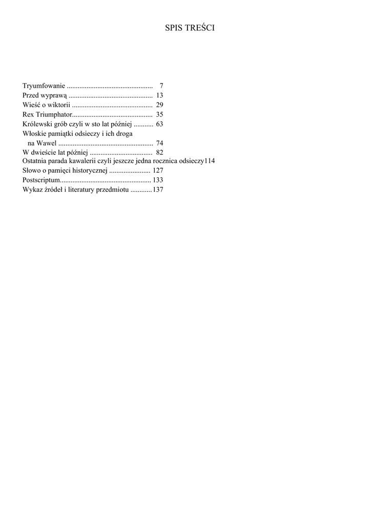 SPIS TREŚCI Tryumfowanie ................................................ 7 Przed wyprawą ............................................... 13 Wieść o wiktorii ............................................. 29 Rex Triumphator............................................. 35 Królewski grób czyli w sto lat później ........... 63 Włoskie pamiątki odsieczy i ich droga na Wawel ..................................................... 74 W dwieście lat później ................................... 82 Ostatnia parada kawalerii czyli jeszcze jedna rocznica odsieczy114 Słowo o pamięci historycznej ....................... 127 Postscriptum................................................... 133 Wykaz źródeł i literatury przedmiotu ............137 TRYUMFOWANIE Od czasów antycznych każde zwycięstwo nierozerwalnie wiązało się z tryumfowaniem. Tak postępowali rzymscy wodzowie, gdy po od-niesionej wiktorii za przyzwoleniem senatu odbywali tryumf, trofea składając w świątyni Jowisza Kapitolińskiego. Podobnie wyglądało w średniowieczu, wówczas miejscami trofealnymi stały się chrześcijańskie świątynie katedralne, a każdy sukces militarny był okazją do fetowania. Jan Długosz zanotował, że po zwycięstwie grunwaldzkim król Władysław Jagiełło złożył w katedrze wawelskiej chorągwie zdobyte na Krzyżakach. Przez stulecia wisiały przy grobie św. Stanisława, pełniącego szczególną w naszych dziejach funkcję – ołtarza Ojczyzny (Ara Patriae). Zwyczaj tryumfowania w typie all’antica wskrzesiła epoka Odrodzenia, rozbudowując jego formy, wzorowane tym razem bezpośrednio na starożytności, nadając tym wydarzeniom wielorakie treści. Stworzono kanon tryumfu wojskowego, przejęty przez Polskę. Okazji do fetowania sukcesów militarnych nie brakło, zwłaszcza w XVI, a szczególnie w XVII stuleciu. Szerokim echem rozeszły się polskie sukcesy nad wojskami moskiewskimi. Odpowiedni rozgłos nadano zdobyciu Smoleńska (1611) przez wojska pod wodzą króla Zygmunta III. Fetowano wtedy w Wilnie, Krakowie, Warszawie. W Rzymie zorganizowano barwne widowisko z ogniami sztucznymi, które układały się na kształt białego orła niszczącego orła czarnego. Symbolika aż nazbyt wymowna. Nie było w Rzeczypospolitej Obojga Narodów żadnego zwycięstwa, które nie połączono by z odpowiednio przygotowanym tryumfem. Po prostu tryumf należał do ceremoniału państwowego, integralnie wiążąc się z funkcją państwa i szeroko pojętą propagandą sukcesu, tworzoną wedle zasad zdrowego rozsądku, odpowiadającą polskiej racji stanu. Ścisły w owych czasach sojusz państwa z Kościołem pozwalał na łączenie ceremoniału „świeckiego” z ceremoniałem liturgicznym związanym z pontyfikalną mszą oraz dziękczynnym Te Deum laudamus. Sacrum przeplatało się z profanum, co powszechnie akceptowano. Obok podniosłych, pełnych patosu uroczystości liturgicznych nieodłącznym elementem fety były wątki ludyczne, pozwalające głównie niżej postawionym w hierarchii społecznej na aktywny udział we wspólnym państwowym święcie. To wzajemne przenikanie się wątku patetycznoreligijnego z ludycznym stało się charakterystyczną cechą dawnych tryumfów. Wszystkie służyły państwu i były oficjalnymi ceremoniami integrującymi społeczeństwo wokół osoby władcy, wodza, działającymi na rzecz podniesienia potęgi i prestiżu Rzeczypospolitej. Analogiczne ceremonie odbywały się prawie we wszystkich krajach europejskich, stając się nieodłączną częścią życia społecznego i politycznego. Towarzyszyły im odpowiednie koncepcje scenograficzne opatrzone właściwą dla danej ceremonii treścią. Powstawała dekoracja okazjonalna, która z upływem czasu zanikała, stanowiąc dziś przedmiot badań na podstawie nieraz nikłych zapisów archiwalnych. Wszystkie tryumfy przerosło zwycięstwo wiedeńskie. Wiktoria Jana III Sobieskiego należała do sukcesów, o jakich „wieki przeszłe nigdy nie słyszały”, jak słusznie pisał król z obozu pod Wiedniem do swej małżonki królowej Marii Kazimiery. Zaraz po bitwie (13 IX) donosił król w liście do żony, że zdobytą „chorągiew mahometańską (...) dziśże jeszcze posłałem do Rzymu Ojcu Świętemu przez Talentego pocztą”. Chorągiew tę złożyli Innocentemu XI – w obecności ambasadorów, posłów i kardynałów kurialnych – Tomasz Talenti, wspomniany w liście zaufany królewski i opat mogilski Jan Kazimierz Denhoff. Talenti wręczył papieżowi list od Sobieskiego zaczynający się od słów „Venimus, vidimus, Deus vicit”. Na wieść o sukcesie rozbrzmiały dzwony we wszystkich kościołach chrześcijaństwa. W dzień po zwycięstwie Wiedeń powitał Jana III. Honory zwycięzcy oddał Ernst Rüdiger von Starhemberg, dowódca obrony Wiednia. Król w towarzystwie wodzów i książąt zwiedził twierdzę wiedeńską. Obejrzał wyłomy w murach i tureckie zniszczenia, nie skąpił pochwał oprowadzającemu go Starhembergowi, chwaląc jego zalety dowódcze. Podziw wzbudzała dzielność i hart obrońców, którym udało się tak długo utrzymać i obronić przed zawziętym i fanatycznym wrogiem. Po obejrzeniu murów Wiednia Jan III wjechał do stolicy Austrii. Na czele tryumfalnego orszaku niesiono przed polskim monarchą zdobytą chorągiew turecką, dwa buńczuki oraz szablę Kara Mustafy. Prowadzono też konia wezyra. Król udał się do najbliższego kościoła, którym była świątynia jezuitów am Hof, a następnie po krótkiej modlitwie do augustianów. Tutaj w kaplicy Madonny Loretańskiej – szczególnie czczonej przez wiedeńczyków – wysłuchał dziękczynnej mszy świętej, na zakończenie której odśpiewano Te Deum laudamus. Odwiedził też katedrę św. Szczepana. Gdy wszedł w progi tej dostojnej świątyni, kaznodzieja powitał go słowy: „Był mąż posłany od Boga, któremu imię było Jan”. Tak witano obrońcę wiary, wybawiciela Europy. Tryumfalnemu wjaz