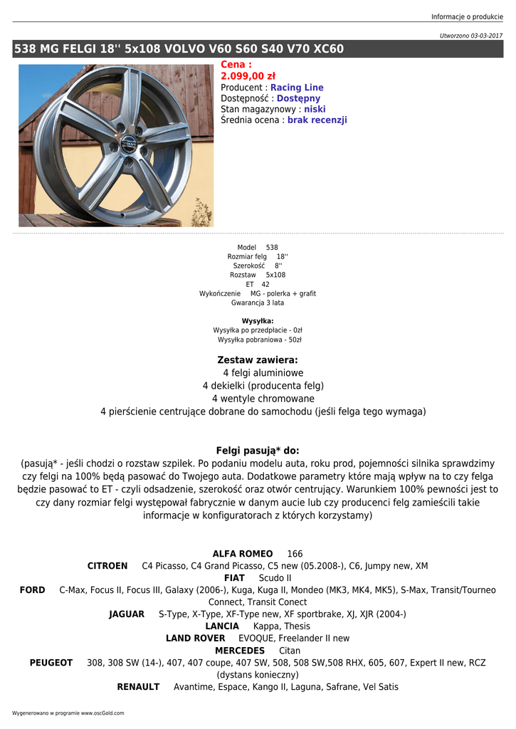 Informacje o produkcie Utworzono 03-03-2017 538 MG FELGI 18'' 5x108 VOLVO V60 S60 S40 V70 XC60 Cena : 2.099,00 zł Producent : Racing Line Dostępność : Dostępny Stan magazynowy : niski Średnia ocena : brak recenzji Model 538 Rozmiar felg 18'' Szerokość 8'' Rozstaw 5x108 ET 42 Wykończenie MG - polerka + grafit Gwarancja 3 lata Wysyłka: Wysyłka po przedpłacie - 0zł Wysyłka pobraniowa - 50zł Zestaw zawiera: 4 felgi aluminiowe 4 dekielki (producenta felg) 4 wentyle chromowane 4 pierścienie centrujące dobrane do samochodu (jeśli felga tego wymaga) Felgi pasują* do: (pasują* - jeśli chodzi o rozstaw szpilek. Po podaniu modelu auta, roku prod, pojemności silnika sprawdzimy czy felgi na 100% będą pasować do Twojego auta. Dodatkowe parametry które mają wpływ na to czy felga będzie pasować to ET - czyli odsadzenie, szerokość oraz otwór centrujący. Warunkiem 100% pewności jest to czy dany rozmiar felgi występował fabrycznie w danym aucie lub czy producenci felg zamieścili takie informacje w konfiguratorach z których korzystamy) ALFA ROMEO 166 CITROEN C4 Picasso, C4 Grand Picasso, C5 new (05.2008-), C6, Jumpy new, XM FIAT Scudo II FORD C-Max, Focus II, Focus III, Galaxy (2006-), Kuga, Kuga II, Mondeo (MK3, MK4, MK5), S-Max, Transit/Tourneo Connect, Transit Conect JAGUAR S-Type, X-Type, XF-Type new, XF sportbrake, XJ, XJR (2004-) LANCIA Kappa, Thesis LAND ROVER EVOQUE, Freelander II new MERCEDES Citan PEUGEOT 308, 308 SW (14-), 407, 407 coupe, 407 SW, 508, 508 SW,508 RHX, 605, 607, Expert II new, RCZ (dystans konieczny) RENAULT Avantime, Espace, Kango II, Laguna, Safrane, Vel Satis Wygenerowano w programie www.oscGold.com VOLVO TOYOTA Proace (2014-) 740, 760, 850, 940, 960, C30, C70, S40/V50, S60, S70, V40(2012-), V40 Cross Country, V60, V70, S80, S90/V90, XC60, XC70, XC90 Zgodnie z Kodeksem PWP art.156 ust 3, emblematy widoczne na felgach mają charakter wyłącznie informacyjny i nie należy się tym sugerować, że jest to produkt oryginalny danego producenta samochodu. Alufelgi dobieramy wg parametrów katalogowych producentów. W przypadku niektórych modeli aut lub felg zachodzi konieczność zastosowania dystansów, śrub/nakrętek ampułkowych. Ponieważ, zawsze może zajść taka sytuacja w której katalog/konfigurator wprowadzi w błąd sprzedawcę zaleca się przed montażem opon przyłożyć felgę na piastę i sprawdzić czy felga nigdzie nie będzie obcierać. Po założeniu opon zwrot felg będzie nie możliwy.