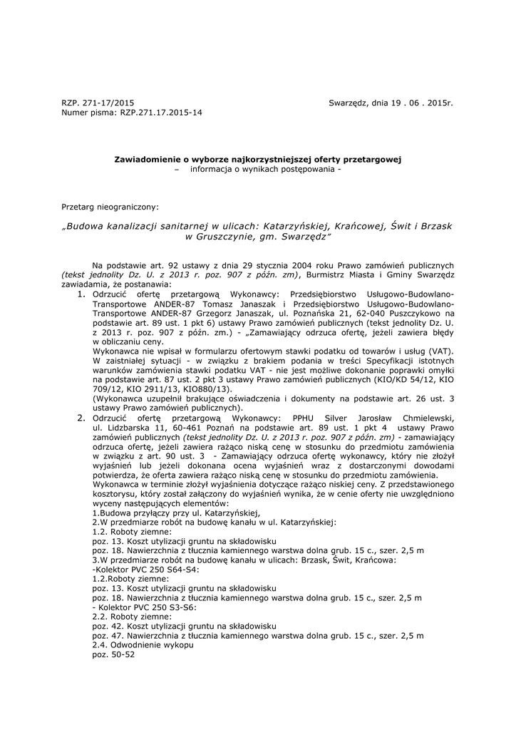 RZP. 271-17/2015 Numer pisma: RZP.271.17.2015-14 Swarzędz, dnia 19 . 06 . 2015r. Zawiadomienie o wyborze najkorzystniejszej oferty przetargowej – informacja o wynikach postępowania - Przetarg nieograniczony: „ Budowa kanalizacji sanitarnej w ulicach: Katarzyńskiej, Krańcowej, Świt i Brzask w Gruszczynie, gm. Swarzędz ” Na podstawie art. 92 ustawy z dnia 29 stycznia 2004 roku Prawo zamówień publicznych (tekst jednolity Dz. U. z 2013 r. poz. 907 z późn. zm), Burmistrz Miasta i Gminy Swarzędz zawiadamia, że postanawia: 1. Odrzucić ofertę przetargową Wykonawcy: Przedsiębiorstwo Usługowo-BudowlanoTransportowe ANDER-87 Tomasz Janaszak i Przedsiębiorstwo Usługowo-BudowlanoTransportowe ANDER-87 Grzegorz Janaszak, ul. Poznańska 21, 62-040 Puszczykowo na podstawie art. 89 ust. 1 pkt 6) ustawy Prawo zamówień publicznych (tekst jednolity Dz. U. z 2013 r. poz. 907 z późn. zm.) - „Zamawiający odrzuca ofertę, jeżeli zawiera błędy w obliczaniu ceny. Wykonawca nie wpisał w formularzu ofertowym stawki podatku od towarów i usług (VAT). W zaistniałej sytuacji - w związku z brakiem podania w treści Specyfikacji istotnych warunków zamówienia stawki podatku VAT - nie jest możliwe dokonanie poprawki omyłki na podstawie art. 87 ust. 2 pkt 3 ustawy Prawo zamówień publicznych (KIO/KD 54/12, KIO 709/12, KIO 2911/13, KIO880/13). (Wykonawca uzupełnił brakujące oświadczenia i dokumenty na podstawie art. 26 ust. 3 ustawy Prawo zamówień publicznych). 2. Odrzucić ofertę przetargową Wykonawcy: PPHU Silver Jarosław Chmielewski, ul. Lidzbarska 11, 60-461 Poznań na podstawie art. 89 ust. 1 pkt 4 ustawy Prawo zamówień publicznych (tekst jednolity Dz. U. z 2013 r. poz. 907 z późn. zm) - zamawiający odrzuca ofertę, jeżeli zawiera rażąco niską cenę w stosunku do przedmiotu zamówienia w związku z art. 90 ust. 3 - Zamawiający odrzuca ofertę wykonawcy, który nie złożył wyjaśnień lub jeżeli dokonana ocena wyjaśnień wraz z dostarczonymi dowodami potwierdza, że oferta zawiera rażąco niską cenę w stosunku do przedmiotu zamówienia. Wykonawca w terminie złożył wyjaśnienia dotyczące rażąco niskiej ceny. Z przedstawionego kosztorysu, który został załączony do wyjaśnień wynika, że w cenie oferty nie uwzględniono wyceny następujących elementów: 1.Budowa przyłączy przy ul. Katarzyńskiej, 2.W przedmiarze robót na budowę kanału w ul. Katarzyńskiej: 1.2. Roboty ziemne: poz. 13. Koszt utylizacji gruntu na składowisku poz. 18. Nawierzchnia z tłucznia kamiennego warstwa dolna grub. 15 c., szer. 2,5 m 3.W przedmiarze robót na budowę kanału w ulicach: Brzask, Świt, Krańcowa: -Kolektor PVC 250 S64-S4: 1.2.Roboty ziemne: poz. 13. Koszt utylizacji gruntu na składowisku poz. 18. Nawierzchnia z tłucznia kamiennego warstwa dolna grub. 15 c., szer. 2,5 m - Kolektor PVC 250 S3-S6: 2.2. Roboty ziemne: poz. 42. Koszt utylizacji gruntu na składowisku poz. 47. Nawierzchnia z tłucznia kamiennego warstwa dolna grub. 15 c., szer. 2,5 m 2.4. Odwodnienie wykopu poz. 50-52 -Kolektor PVC 250 S24-S9: 3.2. Roboty ziemne: poz. 71. Koszt utylizacji gruntu na składowisku poz. 76. Nawierzchnia z tłucznia kamiennego warstwa dolna grub. 15 c., szer. 2,5 m 3. W przedmiarze robót na budowę przyłączy w ulicach: Brzask, Świt, Krańcowa: -Przyłącza kanalizacyjne w ul. Krańcowej 1.3.Roboty montażowe poz. 20 Próba szczelności kanałów Ø150 1.4.Odwodnienie wykopu poz. 21-23 -Przyłącza kanalizacyjne w ul. Świt 2.3.Roboty montażowe poz. 41 Próba szczelności kanałów Ø150 2.4.Odwodnienie wykopu poz. 42-44 -Przyłącza kanalizacyjne ul. Brzask 3.3.Roboty montażowe poz. 64 Próba szczelności kanałów Ø150 3.4.Odwodnienie wykopu poz. 65-67 Zamawiający uznaje, że oferta złożona przez Wykonawcę zawiera rażąco niską cenę. 3. Złożone pozostałe oferty – po wyjaśnieniu rażąco niskiej ceny w ofertach Wykonawców: Wuprinż S.A., Dankar Usługi Budowlane, Wod-Kan. i C.O., Kosztorysowanie Danuta Pyssa, Zakład Robót Inżynieryjno-Hydrotechnicznych POL-GAR Polus i Garnetz Sp. j., Przedsiębiorstwo Hydro-Gaz Swarzędz Henryk Wojkiewicz i Altrans Alicja Tomczak (na podstawie art. 90 ust. 1 ustawy Prawo zamówień publicznych - uznać za ważne i ocenić w sposób następujący: Nr oferty Firma (nazwa) lub nazwisko oraz adres oferenta 1 Wuprinż S.A. ul. Straży Ludowej 35 60-465 Poznań 2 Dankar Usługi Budowlane, Wod-Kan. i C.O., Kosztorysowanie Danuta Pyssa Nienawiszcz 23, 64-610 Rogoźno 3 5 7 Zakład Robót Inżynieryjno-Hydrotechnicznych POL-GAR Polus i Garnetz Sp. j. ul. Gnieźnieńska 51, 62-100 Wągrowiec Przedsiębiorstwo Hydro-Gaz Swarzędz Henryk Wojkiewicz ul. Bednarska 7, 62-020 Swarzędz Altrans Alicja Tomczak ul. Słowackiego 67, 63-800 Gostyń Cena ofertowa brutto Okres gwarancji Suma punktów 508661,28 zł 60 miesięcy ilość punktów w kryterium: 88,38 pkt 499500,00 zł ilość punktów w kryterium: 10pkt 60 miesięcy 98,38 pkt ilość punktów w kryterium: 90pkt 595353,66 zł ilość punktów w kryterium: 10pkt 60 miesięcy 100,00 pkt ilość punktów w kryterium: 75,51 pkt 669120,00 zł ilość punktów w kryterium: 10pkt 60 miesięcy 85,51 pkt ilość punktów w kryterium: 67,19 pkt 548580,00 zł ilość punktów w kryterium: 10pkt 60 miesięcy 77,19 pkt ilość punktów w kryterium: 81,95 pkt ilość punktów w kryterium: 10pkt 91,95 pkt 4. Oferta nr 2 - Wykonawcy: Dankar Usługi Budowlane, Wod-Kan. i C.O., Kosztorysowanie Danuta Pyssa, Nienawiszcz 23, 64-610 Rogoźno jest najkorzystniejszą i ważną – niepodlegającą odrzuceniu - ofertą przetargową złożoną w przedmiotowym postępowaniu. Oferta przetargowa Wykonawcy uzyskała maksymalną i najwyższą ilość punktów w kryteriach oceny ofert określonych w treści SIWZ: najniższa cena – 90,00 punktów, okres gwarancji – 10 punktów. W sumie w obu kryteriach oferta Wykonawcy uzyskała 100 punktów. Wartość oferty mieści się w kwocie jaką zamawi