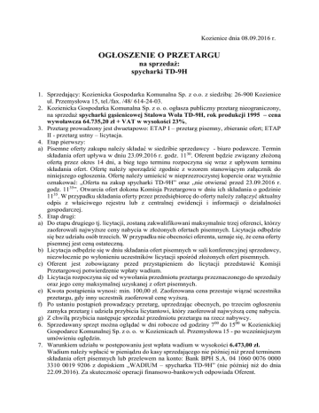 Kozienice dnia 08.09.2016 r. OGŁOSZENIE O PRZETARGU na sprzedaż: spycharki TD-9H 1. Sprzedający: Kozienicka Gospodarka Komunalna Sp. z o.o. z siedzibą: 26-900 Kozienice ul. Przemysłowa 15, tel./fax. /48/ 614-24-03. 2. Kozienicka Gospodarka Komunalna Sp. z o. o. ogłasza publiczny przetarg nieograniczony, na sprzedaż spycharki gąsienicowej Stalowa Wola TD-9H, rok produkcji 1995 – cena wywoławcza 64.735,20 zł + VAT w wysokości 23%, 3. Przetarg prowadzony jest dwuetapowo: ETAP I – przetarg pisemny, zbieranie ofert; ETAP II - przetarg ustny – licytacja. 4. Etap pierwszy: a) Pisemne oferty zakupu należy składać w siedzibie sprzedawcy - biuro podawcze. Termin składania ofert upływa w dniu 23.09.2016 r. godz. 1130. Oferent będzie związany złożoną ofertą przez okres 14 dni, a bieg tego terminu rozpoczyna się wraz z upływem terminu składania ofert. Ofertę należy sporządzić zgodnie z wzorem stanowiącym załącznik do niniejszego ogłoszenia. Ofertę należy umieścić w nieprzezroczystej kopercie oraz wyraźnie oznakować: „Oferta na zakup spycharki TD-9H” oraz „nie otwierać przed 23.09.2016 r. godz. 1135”. Otwarcia ofert dokona Komisja Przetargowa w dniu ich składania o godzinie 1135. W przypadku składania oferty przez przedsiębiorcę do oferty należy załączyć aktualny odpis z właściwego rejestru lub z centralnej ewidencji i informacji o działalności gospodarczej. 5. Etap drugi: a) Do etapu drugiego tj. licytacji, zostaną zakwalifikowani maksymalnie trzej oferenci, którzy zaoferowali najwyższe ceny nabycia w złożonych ofertach pisemnych. Licytacja odbędzie się bez udziału osób trzecich. W przypadku nie obecności oferenta, uznaje się, że cena oferty pisemnej jest ceną ostateczną. b) Licytacja odbędzie się w dniu składania ofert pisemnych w sali konferencyjnej sprzedawcy, niezwłocznie po wyłonieniu uczestników licytacji spośród złożonych ofert pisemnych. c) Oferent jest zobowiązany przed przystąpieniem do licytacji przedstawić Komisji Przetargowej potwierdzenie wpłaty wadium. d) Licytacja rozpoczyna się od wywołania przedmiotu przetargu przeznaczonego do sprzedaży oraz jego ceny maksymalnej uzyskanej z ofert pisemnych. e) Kwota postąpienia wynosi: min. 100,00 zł. Zaoferowana cena przestaje wiązać uczestnika przetargu, gdy inny uczestnik zaoferował cenę wyższą. f) Po ustaniu postąpień prowadzący przetarg, uprzedzając obecnych, po trzecim ogłoszeniu zamyka przetarg i udziela przybicia licytantowi, który zaoferował najwyższą cenę nabycia. g) Z chwilą przybicia następuje sprzedaż przedmiotu przetargu na rzecz nabywcy. 6. Sprzedawany sprzęt można oglądać w dni robocze od godziny 700 do 1500 w Kozienickiej Gospodarce Komunalnej Sp. z o. o. w Kozienicach ul. Przemysłowa 15 - po wcześniejszym umówieniu oględzin. 7. Warunkiem udziału w postępowaniu jest wpłata wadium w wysokości 6.473,00 zł. Wadium należy wpłacić w pieniądzu do kasy sprzedającego nie później niż przed terminem składania ofert pisemnych lub przelewem na konto: Bank BPH S.A. 04 1060 0076 0000 3310 0019 9206 z dopiskiem „WADIUM – spycharka TD-9H” (nie później niż do dnia 22.09.2016). Za skuteczność operacji finansowo-bankowych odpowiada Oferent. 8. Wadium złożone przez uczestników przetargu, którzy nie zostali niezakwalifikowani do II etapu przetargu, zostanie zwrócone bezzwłocznie. 9. Po zakończeniu II etapu przetargu i dokonaniu wyboru oferty, oferentowi, którego oferta zostanie przyjęta (zaoferował najwyższą cenę), wadium będzie zarachowane na poczet ceny nabycia, pozostałym uczestnikom licytacji wadium zostanie bezzwłocznie zwrócone. 10. Wadium przepada na rzecz sprzedawcy, jeżeli oferent, którego oferta zostanie przyjęta, uchyla się od zawarcia umowy – nie wpłacił ceny nabycia w wymaganym terminie. 11. Sprzedawca wybierze oferenta, który zaoferował najwyższą cenę za przedmiot sprzedaży. Nabywca jest obowiązany zapłacić cenę nabycia niezwłocznie lub w terminie nie dłuższym niż 14 dni kalendarzowych od przetargu. Nabywca, który w wymaganym terminie nie uiści ceny nabycia, traci prawa nabycia oraz złożone wadium. 12. Uczestnikom przetargu nie przysługuje prawo domagania się zwrotu kosztów poniesionych w związku z uczestnictwem w postępowaniu przetargowym. 13. Wydanie przedmiotu sprzedaży nabywcy nastąpi niezwłocznie po zapłaceniu ceny brutto nabycia. 14. Sprzedający zastrzega sobie prawo unieważnienia przetargu bez podania przyczyny. 15. Dodatkowych informacji w sprawie przetargu udzielają: a) Artur Mickiewicz – w sprawach technicznych tel. /48/ 614-24-03, 698-633-474 b) Krzysztof Boryczka – w sprawach formalnych tel. /48/ 614-60-84, 668-017-014. Prezes Zarządu - Robert Wojcieszek