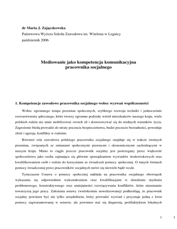 dr Maria J. Zaj czkowska Pa stwowa Wy sza Szkoła Zawodowa im. Witelona w Legnicy pa dziernik 2006 Mediowanie jako kompetencja komunikacyjna pracownika socjalnego 1. Kompetencje zawodowe pracownika socjalnego wobec wyzwa współczesno ci Wobec ogromnego tempa przemian społecznych, szybkiego rozwoju techniki i jednocze nie rozwarstwienia spłecznego, które tworzy ogromne podziały w ród mieszka ców naszego kraju, wiele polskich rodzin nie umie mobilizowa swoich sił i dostosowywa si do trudnych warunków ycia. Zagro enie bied prowadzi do utraty poczucia bezpiecze stwa, budzi poczucie bezradno ci, powoduje zło i agresj , konflikty w rodzinie. Równie rola zawodowa polskiego pracownika socjalnego znajduje si w trakcie istotnych przemian, zwi zanych ze zmianami społecznymi prawnymi i ekonomicznymi zachodz cymi w naszym kraju. Mimo to ci gle jeszcze pracownik socjalny jest postrzegany przez wi kszo społecze stwa jako osoba zajmuj ca si głównie sporz dzaniem wywiadów rodowiskowych oraz kwalifikowaniem osób i rodzin do korzystania ze wiadcze pomocy społecznej. O innych formach pomocy wiadczonej przez pracowników socjalnych mówi si niewiele b d wcale. Tymczasem Ustawa o pomocy społecznej nakłada na pracownika socjalnego obowi zek wykazania si odpowiednim wykształceniem oraz kwalifikacjami w dziedzinie my lenia problemowego, konstruktywnego oraz umiej tno ci rozwi zywania konfliktów, które nieustannie towarzysz jego pracy. Zało enia ustawy (wielokrotnie nowelizowanej) podkre laj , e pracownik socjalny powinien by nie tylko urz dnikiem, który prowadzi wywiad i przyznaje jedn z form pomocy zagwarantowanej w ustawie, ale powinien sta si diagnost , profilaktykiem lokalnych 1 1 problemów społecznych, animatorem zmian rodowiskowych oraz osob pobudzaj ca aktywno społeczn . Powinien te d y do rozbudowy infrastruktury socjalnej, a tak e zapobiega procesowi marginalizacji osób i grup oraz przeciwstawia si negatywnym zjawiskom w rodowisku lokalnym (Korlak-Łukasiewicz 2003). Działalno zawodowa pracowników socjalnych, precyzowana jako “praca socjalna” wi e si z celow i zorganizowan pomoc udzielan niewydolnym ekonomicznie, społecznie lub fizycznie członkom współczesnego społecze stwa. Praca socjalna jest specyficzn działalno ci zawodow maj c na celu lepsz adaptacj osób, rodzin, grup i rodowiska społecznego, w jakim yj oraz rozwijania poczucia godno ci osobistej i odpowiedzialno ci jednostek na drodze odwoływania si do potencjalnych mo liwo ci poszczególnych osób, do powi za mi dzy nimi a tak e sił i rodków społecznych (Szatur-Jaworska 1995). To maj ce swoje historyczne korzenie rozumienie działalno ci socjalnej jest aktualne do dzisiaj, cho ulega ono pewnej modyfikacji z racji post puj cych zmian społecznych na wiecie. Tak e wyznaczone cele poddawane s na bie co korekcie nie tylko ze wzgl du na przenoszenie punktu ci ko ci z jednych na drugie, ale tak e ze wzgl du na zwi kszanie si ich liczby. Stopniowo powi ksza si repertuar technik pracy, opartych na kontaktach interpersonalnych mi dzy pracownikami socjalnymi a osobami wspomaganymi, zwanymi “klientami” lub “u ytkownikami usług”. Doszły do nich w ostatnich latach takie jak psychochoterapia, poradnictwo, mediacja, rzecznictwo. Kompetentny, a zarazem odpowiadaj cy wspólczesnym wyzwaniom pracownik socjalny, jako profesjonalista powinien skupi si przy wykonywaniu swojej pracy na: • wzmacnianiu w ludziach zdolno ci do rozwi zywania problemów, radzenia sobie w trudnych sytuacjach i rozwoju osobistego; • doskonaleniu zdolno ci ludzi do prawidłowych stosunków i interakcji z innymi; • skutecznym inerweniowaniu na rzecz jednostek i grup najsłabszych, dyskryminowanych lub marginalizowanych z powodu niedostosowania, niepełnosprawno ci, choroby, ubóstwa etc.; • sprzyjaniu efektywnemu, sprawiedliwemu i humanitarnemu działaniu słu b zapewniaj cych jednostkom, grupom rodki, wiadczenia i mo liwo ci pomocy; • tworzeniu nowych lub ulepszaniu istniejacych systemów wsparcia, zapewniaj cych pomoc i trafniej zaspokajaj cych oczekiwania podopiecznych i klientów (Skidmore, Thockeray 1996). 2 2 Dla zealizowania owych zało e pracownik socjalny zmuszony jest pełni wiele ról, m.in.: pomocnika, ratownika, doradcy, informatora, po rednika, animatora, reformatora, badacza, koordynatora, mistrza oraz ucznia. Fakt, i nie ka dy pracownik socjalny realizuje wszystkie ze wskazanych ról, jest naturaln konsekwencj ró nic w zakresie przygotowania merytorycz nego, do wiadczenia zawodowego, a tak e cech osobowo ciowych. Stan taki jest implikowany tak e zakresem potrzeb zwi zanych z indywidualnymi przypadkami pomocobiorców ( akiewicz 2001). Tymczasem kontrowersje budzi ju sam problem systematyzacji wiedzy teoretycznej w pracy socjalnej, ze wzgl du chocia by na zró nicowanie adresatów wiadcze i form działa pomocowych (od opieki prenatalnej do opieki (pomocy) ludziom w wieku starczym). Stan ten powoduje, e nie ma jednej dyscypliny, do której odwołuje si pragmatyka pracy społecznej, ponadto nie ma jasno okre lonych wzorów interpretacji, które pozwoliłyby t wiedz jednoznacznie kategoryzowa i aplikowa w sferze profesjonalnego działania (Kantowicz 2001). Czynnikiem składaj cym si umiej tno ci (poza wiedz na kompetencje profesjonalne pracownika socjalnego s teoretyczn ). Mo na je podzieli jego na trzy grupy: pierwsza obejmuje umiej tno ci zwi zane ze skutecznym komunikowaniem si i łatwo nawi zywania kontaktu z klientem, słuchania czy wysłuchania, prowadzenia rozmowy. Drug kategori stanowi umiej tno ci zwi zane z metodyk i technik pracy socjalnej: umiej tno oceny sytuacji klienta, podejmowania decyzji i szybkiej interwencji, a tak e postawienia diagnozy. Trzecia grupa to te umiej tno ci, które dotycz sprawno ci działania pracownika socjalnego. Jest to zarówno umiej tno pracy, jej systematyczno ci czy planowania czasu, jak i umiej tno zorganizowania koordynowania działa wszystkich partnerów współpracuj cyc
