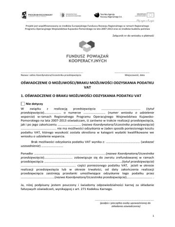 Projekt jest współfinansowany ze środków Europejskiego Funduszu Rozwoju Regionalnego w ramach Regionalnego Programu Operacyjnego Województwa Kujawsko-Pomorskiego na lata 2007-2013 oraz ze środków budżetu państwa Załącznik nr do wniosku o płatność ………………..……………………………………………………………… Nazwa i adres Koordynatora/Uczestnika przedsięwzięcia ……………….…………………………… Miejscowość, data OŚWIADCZENIE O MOŻLIWOŚCI/BRAKU MOŻLIWOŚCI ODZYSKANIA PODATKU VAT 1. OŚWIADCZENIE O BRAKU MOŻLIWOŚCI ODZYSKANIA PODATKU VAT Nie dotyczy W związku z realizacją przedsięwzięcia ............................................ (tytuł przedsięwzięcia)………………… o numerze ……………………… (numer wniosku o udzielenie wsparcia) w ramach Regionalnego Programu Operacyjnego Województwa KujawskoPomorskiego na lata 2007-2013 oświadczam, iż zarówno w trakcie realizacji przedsięwzięcia, jak i po jego zakończeniu .......................... (nazwa Koordynatora/Uczestnika przedsięwzięcia) ........................................ nie ma możliwości odzyskania w żaden sposób poniesionego kosztu podatku VAT, którego wysokość została określona w kategorii wydatki kwalifikowane we wniosku o udzielenie wsparcia. Brak możliwości odzyskania podatku VAT wynika z: …………………………………… (wskazać uzasadnienie) ……………………… Ponadto ………………………………………........................................(nazwa Koordynatora/Uczestnika przedsięwzięcia)................................ zobowiązuje się do zwrotu zrefundowanej w ramach przedsięwzięcia ……………………………………………………………………………………(tytuł przedsięwzięcia) .............................................................. części poniesionego podatku VAT, jeżeli w okresie realizacji przedsięwzięcia lub w okresie trwałości, od daty zakończenia realizacji przedsięwzięcia zaistnieją przesłanki umożliwiające odzyskanie tego podatku przez ......................................(nazwa Koordynatora/Uczestnika przedsięwzięcia)............................. . Ja, niżej podpisany jestem pouczony i świadomy odpowiedzialności karnej za składanie fałszywych oświadczeń, wynikającej z art. 271 Kodeksu Karnego. ………………………….……………………………………………….. (podpis i pieczątka osoby upoważnionej do składania oświadczenia) 1 2. OŚWIADCZENIE O MOŻLIWOŚCI ODZYSKANIA PODATKU VAT Nie dotyczy W związku z ubieganiem się .......................... (nazwa Koordynatora/Uczestnika przedsięwzięcia) .......................................o przyznanie wsparcia ze środków Europejskiego Funduszu Rozwoju Regionalnego w ramach Regionalnego Programu Operacyjnego Województwa Kujawsko – Pomorskiego na lata 2007-2013 na realizację przedsięwzięcia pn. ............................................ (tytuł przedsięwzięcia)………………… o numerze ……………………… (numer wniosku o udzielenie wsparcia) oświadczam, iż realizując powyższe przedsięwzięcie .......................... (nazwa Koordynatora/Uczestnika przedsięwzięcia) ....................................... ma możliwość odzyskania poniesionego kosztu podatku VAT, którego wysokość została określona w kategorii wydatki niekwalifikowalne wniosku o udzielenie wsparcia. Ja, niżej podpisany jestem pouczony i świadomy odpowiedzialności karnej za składanie fałszywych oświadczeń, wynikającej z art. 271 Kodeksu Karnego. ………………………………………………………….. (podpis i pieczątka osoby upoważnionej do składania oświadczenia) 2