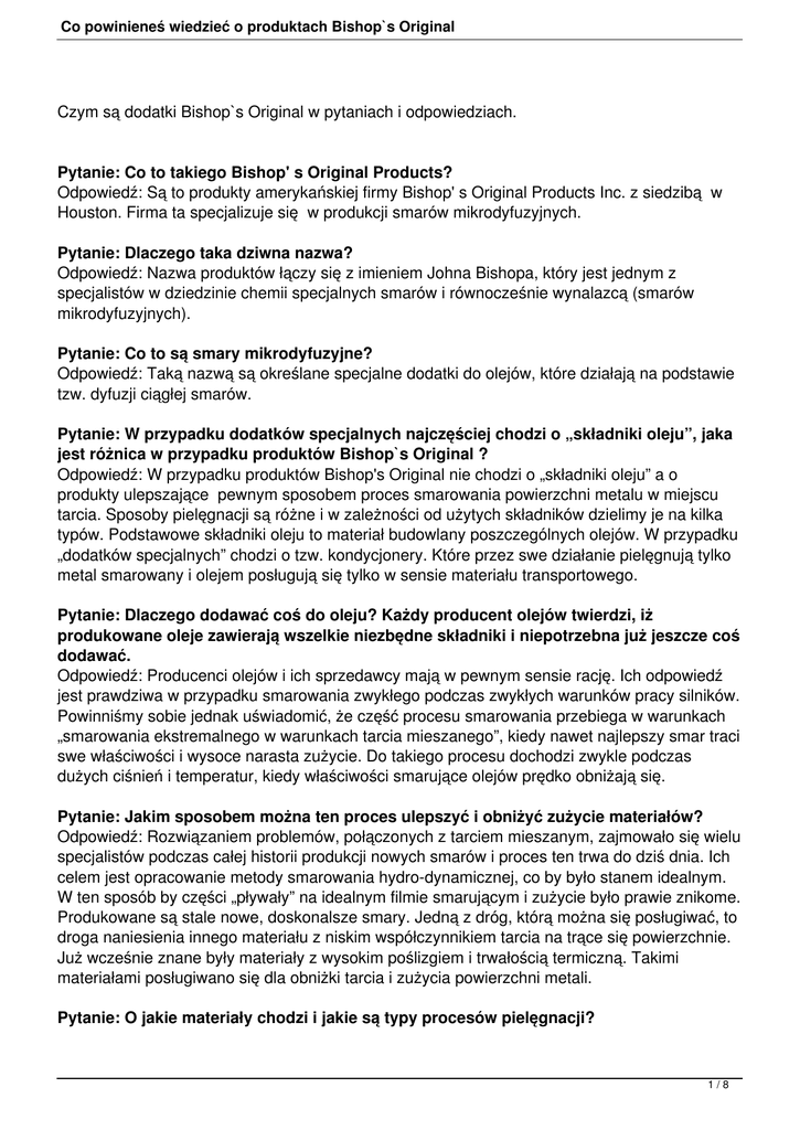 Co powinieneś wiedzieć o produktach Bishop`s Original Czym są dodatki Bishop`s Original w pytaniach i odpowiedziach. Pytanie: Co to takiego Bishop' s Original Products? Odpowiedź: Są to produkty amerykańskiej firmy Bishop' s Original Products Inc. z siedzibą w Houston. Firma ta specjalizuje się w produkcji smarów mikrodyfuzyjnych. Pytanie: Dlaczego taka dziwna nazwa? Odpowiedź: Nazwa produktów łączy się z imieniem Johna Bishopa, który jest jednym z specjalistów w dziedzinie chemii specjalnych smarów i równocześnie wynalazcą (smarów mikrodyfuzyjnych). Pytanie: Co to są smary mikrodyfuzyjne? Odpowiedź: Taką nazwą są określane specjalne dodatki do olejów, które działają na podstawie tzw. dyfuzji ciągłej smarów. Pytanie: W przypadku dodatków specjalnych najczęściej chodzi o „składniki oleju”, jaka jest różnica w przypadku produktów Bishop`s Original ? Odpowiedź: W przypadku produktów Bishop's Original nie chodzi o „składniki oleju” a o produkty ulepszające pewnym sposobem proces smarowania powierzchni metalu w miejscu tarcia. Sposoby pielęgnacji są różne i w zależności od użytych składników dzielimy je na kilka typów. Podstawowe składniki oleju to materiał budowlany poszczególnych olejów. W przypadku „dodatków specjalnych” chodzi o tzw. kondycjonery. Które przez swe działanie pielęgnują tylko metal smarowany i olejem posługują się tylko w sensie materiału transportowego. Pytanie: Dlaczego dodawać coś do oleju? Każdy producent olejów twierdzi, iż produkowane oleje zawierają wszelkie niezbędne składniki i niepotrzebna już jeszcze coś dodawać. Odpowiedź: Producenci olejów i ich sprzedawcy mają w pewnym sensie rację. Ich odpowiedź jest prawdziwa w przypadku smarowania zwykłego podczas zwykłych warunków pracy silników. Powinniśmy sobie jednak uświadomić, że część procesu smarowania przebiega w warunkach „smarowania ekstremalnego w warunkach tarcia mieszanego”, kiedy nawet najlepszy smar traci swe właściwości i wysoce narasta zużycie. Do takiego procesu dochodzi zwykle podczas dużych ciśnień i temperatur, kiedy właściwości smarujące olejów prędko obniżają się. Pytanie: Jakim sposobem można ten proces ulepszyć i obniżyć zużycie materiałów? Odpowiedź: Rozwiązaniem problemów, połączonych z tarciem mieszanym, zajmowało się wielu specjalistów podczas całej historii produkcji nowych smarów i proces ten trwa do dziś dnia. Ich celem jest opracowanie metody smarowania hydro-dynamicznej, co by było stanem idealnym. W ten sposób by części „pływały” na idealnym filmie smarującym i zużycie było prawie znikome. Produkowane są stale nowe, doskonalsze smary. Jedną z dróg, którą można się posługiwać, to droga naniesienia innego materiału z niskim współczynnikiem tarcia na trące się powierzchnie. Już wcześnie znane były materiały z wysokim poślizgiem i trwałością termiczną. Takimi materiałami posługiwano się dla obniżki tarcia i zużycia powierzchni metali. Pytanie: O jakie materiały chodzi i jakie są typy procesów pielęgnacji? 1/8 Co powinieneś wiedzieć o produktach Bishop`s Original Odpowiedź: Jak już podaliśmy na początku, proces pielęgnacji powierzchni można podzielić na różne typy pielęgnacji według formy działania: 1. typ: Smarowanie chemiczne – aktywny proces ulepszenia powierzchni metalu przez proces kontrolowania agresji miękkich metali i utleniaczy ( zwykłe składniku oleju). 2. typ: Naniesienie na powierzchnię metalu warstwę „cudzego” materiału z niskim współczynnikiem tarcia. 3. typ: Dodatki do olejów, pracujące na podstawie dyfuzji ciągłej. Pytanie: Proszę o objaśnienie procesu smarowania chemicznego? Odpowiedź: Dodatki pierwszego typu i ich sposób smarowania to zwykły proces, który się dzieje w wszelkich produkowanych olejach. Podczas procesu tarcia dochodzi do powstania cienkiego filmu miękkich soli i utleniaczy stale odnawianego podczas smarowania. Film wszak starzeje się i podlega działaniu cudzych domieszek do oleju i produktów reakcji chemicznych. Chodzi o tzw. smarowanie aktywne. Pytanie: O co chodzi w przypadku 2 typu pielęgnacji ? Jaka jest różnica? Odpowiedź: W przypadku drugiego typu chodzi o tzw. smarowanie pasywne za pomocy cząsteczek stałych. Duża ilość materiałów posiada takie właściwości, że mogą, dzięki niskiemu współczynnikowi tarcia, zapewniać bardzo dobry poślizg powierzchni metali. Należy do nich między innymi: grafit, dwusiarczek molibdenu, PTFE lub inne materiały. Zasada pielęgnacji powierzchni polega na naniesieniu warstewki ochronnej na powierzchnię metalu i ulepszenie jego właściwości smarowania. Proces nanoszenia jest długo trwalszy, nie można zabezpieczyć doskonałego naniesienia materiału na całą powierzchnię i deklarowane przez producenta działanie zwykle się nie potwierdza. Badaniami wielu centrów doświadczalnych zostało potwierdzone , iż współczynnik tarcia PTFE jest wyższy od współczesnych olejów silnikowych. Naniesienie PTFE na powierzchnię metalu można przeprowadzić tylko w próżni przy dużych temperaturach materiału bazowego (metalu). Użycie owego materiału w silnikach spalinowych nie ma sensu. Produktu nie można dodawać do nowych lub bardzo szczelnych urządzeń i producenci silników absolutnie nie polecają dodawanie takich produktów do oleju silnikowego. Produkty takie działają pozytywnie tylko w przekładniach. Aktualnie ich użycie obniża się, są maksymalnie obecne w smarach, gdzie jest ich użycie uzasadnione. Między innymi do produktów z drugiego typu należy zwłaszcza SLICK 50 (produkowany po 1984 roku), NULON, SWDOL, OEM i dużo innych. UWAGA! W przypadku SLICK 50 powinniśmy podać podstawową informację. To, co było już podane, dotyczy tylko dodatku do oleju, produkowanego po roku 1984 i nie dotyczy oryginalnego produktu, wynalezionego w 1975 roku. W 1979 roku