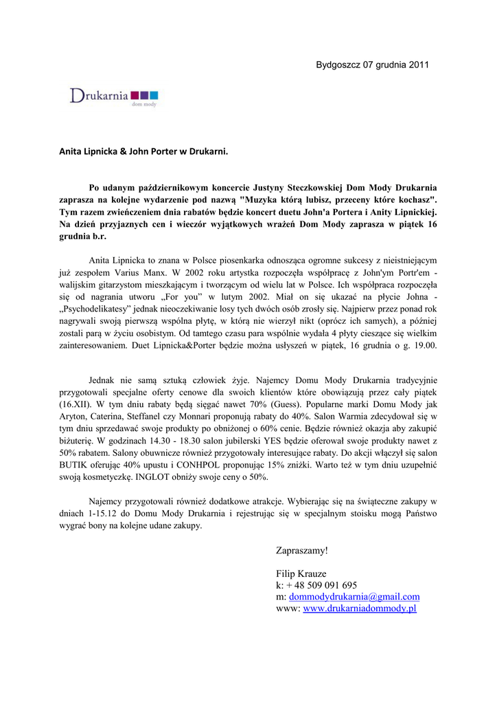 Bydgoszcz 07 grudnia 2011 Anita Lipnicka & John Porter w Drukarni. Po udanym październikowym koncercie Justyny Steczkowskiej Dom Mody Drukarnia zaprasza na kolejne wydarzenie pod nazwą "Muzyka którą lubisz, przeceny które kochasz". Tym razem zwieńczeniem dnia rabatów będzie koncert duetu John'a Portera i Anity Lipnickiej. Na dzień przyjaznych cen i wieczór wyjątkowych wrażeń Dom Mody zaprasza w piątek 16 grudnia b.r. Anita Lipnicka to znana w Polsce piosenkarka odnosząca ogromne sukcesy z nieistniejącym już zespołem Varius Manx. W 2002 roku artystka rozpoczęła współpracę z John'ym Portr'em walijskim gitarzystom mieszkającym i tworzącym od wielu lat w Polsce. Ich współpraca rozpoczęła się od nagrania utworu „For you” w lutym 2002. Miał on się ukazać na płycie Johna „Psychodelikatesy” jednak nieoczekiwanie losy tych dwóch osób zrosły się. Najpierw przez ponad rok nagrywali swoją pierwszą wspólna płytę, w którą nie wierzył nikt (oprócz ich samych), a później zostali parą w życiu osobistym. Od tamtego czasu para wspólnie wydała 4 płyty cieszące się wielkim zainteresowaniem. Duet Lipnicka&Porter będzie można usłyszeń w piątek, 16 grudnia o g. 19.00. Jednak nie samą sztuką człowiek żyje. Najemcy Domu Mody Drukarnia tradycyjnie przygotowali specjalne oferty cenowe dla swoich klientów które obowiązują przez cały piątek (16.XII). W tym dniu rabaty będą sięgać nawet 70% (Guess). Popularne marki Domu Mody jak Aryton, Caterina, Steffanel czy Monnari proponują rabaty do 40%. Salon Warmia zdecydował się w tym dniu sprzedawać swoje produkty po obniżonej o 60% cenie. Będzie również okazja aby zakupić biżuterię. W godzinach 14.30 - 18.30 salon jubilerski YES będzie oferował swoje produkty nawet z 50% rabatem. Salony obuwnicze również przygotowały interesujące rabaty. Do akcji włączył się salon BUTIK oferując 40% upustu i CONHPOL proponując 15% zniżki. Warto też w tym dniu uzupełnić swoją kosmetyczkę. INGLOT obniży swoje ceny o 50%. Najemcy przygotowali również dodatkowe atrakcje. Wybierając się na świąteczne zakupy w dniach 1-15.12 do Domu Mody Drukarnia i rejestrując się w specjalnym stoisku mogą Państwo wygrać bony na kolejne udane zakupy. Zapraszamy! Filip Krauze k: + 48 509 091 695 m: [email protected] www: www.drukarniadommody.pl