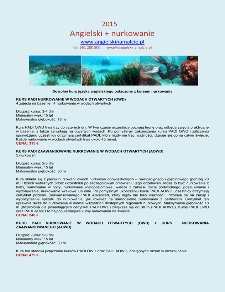 2015 Angielski + nurkowanie www.angielskinamalcie.pl tel. 691 280 500 [email protected] Dowolny kurs języka angielskiego połączony z kursem nurkowania KURS PADI NURKOWANIE W WODACH OTWARTYCH (OWD) 4 zajęcia na basenie i 4 nurkowania w wodach otwartych Długość kursu: 3-4 dni Minimalny wiek: 15 lat Maksymalna głębokość: 18 m Kurs PADI OWD trwa trzy do czterech dni. W tym czasie uczestnicy poznają teorię oraz odbędą zajęcia praktyczne w basenie, a także zanurkują na otwartych wodach. Po pomyślnym zakończeniu kursu PADI OWD i zaliczeniu sprawdzianu uczestnicy otrzymają certyfikat PADI, który nigdy nie traci ważności. Uznaje się go na całym świecie. Każde nurkowanie w wodach otwartych trwa około 45 minut. CENA: 315 € KURS PADI ZAAWANSOWANE NURKOWANIE W WODACH OTWARTYCH (AOWD) 5 nurkowań Długość kursu: 2-3 dni Minimalny wiek: 15 lat Maksymalna głębokość: 30 m Kurs składa się z pięciu nurkowań: dwóch nurkowań obowiązkowych – nawigacyjnego i głębinowego (poniżej 20 m) i trzech wybranych przez uczestnika po szczegółowym omówieniu jego oczekiwań. Może to być: nurkowanie z łodzi, nurkowanie w nocy, nurkowanie wielopoziomowe, wiedza z zakresu życia podwodnego, poszukiwanie i wydobywanie, nurkowanie wrakowe lub inne. Po pomyślnym ukończeniu kursu PADI AOWD uczestnicy otrzymają certyfikat poziomu zaawansowanego PADI Advanced, który nigdy nie traci ważności. Pozwala on na zakup i wypożyczenie sprzętu do nurkowania, jak również na samodzielne nurkowanie z partnerem. Certyfikat ten uprawnia także do nurkowania w niemal wszystkich dostępnych regionach nurkowych. Maksymalna głębokość 18 m (dozwolona dla posiadających certyfikat PADI OWD) zwiększa się do 30 m (PADI AOWD). Kursy PADI OWD oraz PADI AOWD to najpopularniejsze kursy nurkowania na świecie. CENA: 240 € KURS PADI NURKOWANIE ZAAWANSOWANEGO (AOWD) W WODACH OTWARTYCH (OWD) + KURS NURKOWANIA Długość kursu: 5-6 dni Minimalny wiek: 15 lat Maksymalna głębokość: 30 m Kurs ten stanowi połączenie kursów PADI OWD oraz PADI AOWD, dostępnych razem w niższej cenie. CENA: 475 €