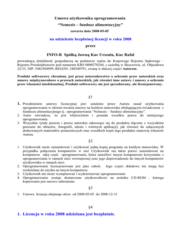 Umowa użytkownika oprogramowania “Nemezis – fundusz alimentacyjny” zawarta dnia 2008-05-05 na udzielenie bezpłatnej licencji w roku 2008 przez INFO-R Spółką Jawną Kuc Urszula, Kuc Rafał prowadzącą działalność gospodarczą na podstawie wpisu do Krajowego Rejestru Sądowego – Rejestru Przedsiębiorców pod numerem KRS 0000270244, z siedzibą w Skoczowie, ul. Objazdowa 22/33, NIP: 5482504999, REGON: 240540791, zwaną w dalszej części Autorem. Produkt softwarowy chroniony jest przez ustawodawstwo o ochronie praw autorskich oraz umowy międzynarodowe o prawach autorskich, jak również inne ustawy i umowy o ochronie praw własności intelektualnej. Produkt softwerowy nie jest sprzedawany, ale licencjonowany. §1 1. Przedmiotem umowy licencyjnej jest: ustalenie przez Autora zasad użytkowania oprogramowania w okresie trwania umowy na każdym stanowisku obsługującym świadczenia z funduszu alimentacyjnego tj.: oprogramowania “Nemezis – fundusz alimentacyjny”. 2. Autor oświadcza, że jest właścicielem i posiada wszelkie prawa do niniejszego oprogramowania. 3. Wszystkie tytuły prawne i prawa autorskie odnoszące się do produktu (łącznie z wszystkimi prawami do obrazów, fotografii, tekstu i wtórnych aplikacji), jak również do załączonych drukowanych materiałów pomocniczych oraz wszelkich kopii tego produktu stanowią własność Autora. §2 1. Użytkownik może zainstalować i użytkować jedną kopię programu na każdym stanowisku. W przypadku połączenia komputerów w sieć Użytkownik ma także prawo zainstalować na komputerze taką część oprogramowania, która umożliwi innym komputerom korzystanie z oprogramowania w ramach sieci wewnętrznej oraz jego doprowadzenie do innych komputerów użytkownika w ramach sieci. 2. Oprogramowanie licencjonowane jest jako całość. Jego części składowe nie mogą być rozdzielane do użytku na innym komputerze. 3. Użytkownik nie może wynajmować i wydzierżawiać oprogramowania 4. Oprogramowanie zostaje dostarczone użytkownikowi na nośniku CD-ROM , którego kopiowanie jest surowo zabronione. §3 1. Umowa licencja obejmuje okres od 2008-05-05 do 2008-12-31 §4 1. Licencja w roku 2008 udzielana jest bezpłatnie. §5 1. Wszelkie zmiany w programie wprowadzane na żądanie Użytkownika będą BEZPŁATNE po zgłoszeniu zmian i ustaleniu, czy ich wprowadzenie jest możliwe. Zmiany zostaną ujęte w najbliższej aktualizacji programu. O terminie tej aktualizacji Użytkownik zostanie powiadomiony telefonicznie bądź pocztą elektroniczną. 2. Aktualizacje programu związane z nowelizacją przepisów prawnych będą dokonywane BEZPŁATNIE w okresie trwania umowy licencyjnej. Aktualizacje programu przesyłane będą pocztą na koszt Autora lub dostępne będą na stronie internetowej. Wszystkie zmiany zawierające tylko poprawki do programu dostępne będą na stronie internetowej – BEZPŁATNIE. 3. Użytkownik uprawniony jest do bezpłatnego korzystania z porad telefonicznych w godzinach pracy Autora. Nr telefonu.: (33) 479 93 29. 4. Za uszkodzenia i straty związane z niewłaściwym użytkowaniem oprogramowania Autor NIE ODPOWIADA. §6 1. Umowa zawarta zostaje na okres od 2008-05-05 do 2008-12-31. 2. Umowa może być wypowiedziana przez każdą z stron z dwutygodniowym okresem wypowiedzenia. Wypowiedzenie jest skuteczne, jeżeli dokonane zostało w formie pisemnej. §7 Wszelkie zmiany niniejszej umowy wymagają formy pisemnej pod rygorem nieważności. §8 W kwestiach nie unormowanych w niniejszej umowie mają zastosowanie odpowiednie postanowienia Kodeksu cywilnego oraz Ustawy o prawie autorskim i prawach pokrewnych z 24 lutego 1994 r. (Dz.U. Nr 24, poz. 83). §9 W przypadku zaistnienia sporu na tle wykonywania postanowień niniejszej umowy, sądem właściwym, będzie sąd właściwy miejscowo dla siedziby Użytkownika.