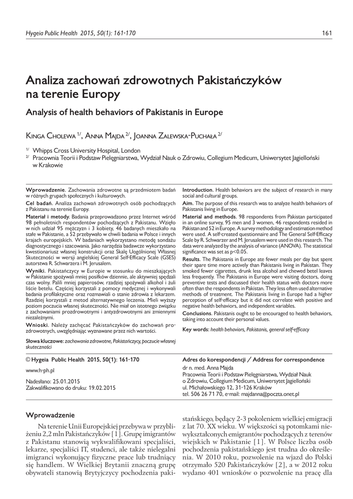 CholewaPublic Hygeia K i wsp. Health Analiza 2015, zachowań 50(1): 161-170 zdrowotnych Pakistańczyków na terenie Europy 161 Analiza zachowań zdrowotnych Pakistańczyków na terenie Europy Analysis of health behaviors of Pakistanis in Europe Kinga Cholewa 1/, Anna Majda 2/, Joanna Zalewska-Puchała 2/ Whipps Cross University Hospital, London Pracownia Teorii i Podstaw Pielęgniarstwa, Wydział Nauk o Zdrowiu, Collegium Medicum, Uniwersytet Jagielloński w Krakowie 1/ 2/ Wprowadzenie. Zachowania zdrowotne są przedmiotem badań w różnych grupach społecznych i kulturowych. Cel badań. Analiza zachowań zdrowotnych osób pochodzących z Pakistanu na terenie Europy. Materiał i metody. Badania przeprowadzono przez Internet wśród 98 pełnoletnich respondentów pochodzących z Pakistanu. Wzięło w nich udział 95 mężczyzn i 3 kobiety, 46 badanych mieszkało na stałe w Pakistanie, a 52 przebywało w chwili badania w Polsce i innych krajach europejskich. W badaniach wykorzystano metodę sondażu diagnostycznego i szacowania. Jako narzędzia badawcze wykorzystano kwestionariusz własnej konstrukcji oraz Skalę Uogólnionej Własnej Skuteczności w wersji angielskiej General Self-Efficacy Scale (GSES) autorstwa R. Schwarzera i M. Jerusalem. Wyniki. Pakistańczycy w Europie w stosunku do mieszkających w Pakistanie spożywali mniej posiłków dziennie, ale aktywniej spędzali czas wolny. Palili mniej papierosów, rzadziej spożywali alkohol i żuli liście betelu. Częściej korzystali z pomocy medycznej i wykonywali badania profilaktyczne oraz rozmawiali o stanie zdrowia z lekarzem. Rzadziej korzystali z metod alternatywnego leczenia. Mieli wyższy poziom poczucia własnej skuteczności. Nie miał on istotnego związku z zachowaniami prozdrowotnymi i antyzdrowotnymi ani zmiennymi niezależnymi. Wnioski. Należy zachęcać Pakistańczyków do zachowań prozdrowotnych, uwzględniając wyznawane przez nich wartości. Introduction. Health behaviors are the subject of research in many social and cultural groups. Aim. The purpose of this research was to analyze health behaviors of Pakistanis living in Europe. Material and methods. 98 respondents from Pakistan participated in an online survey, 95 men and 3 women, 46 respondents resided in Pakistan and 52 in Europe. A survey methodology and estimation method were used. A self-created questionnaire and The General Self-Efficacy Scale by R. Schwarzer and M. Jerusalem were used in this research. The data were analyzed by the analysis of variance (ANOVA). The statistical significance was set as p<0.05. Results. The Pakistanis in Europe ate fewer meals per day but spent their spare time more actively than Pakistanis living in Pakistan. They smoked fewer cigarettes, drunk less alcohol and chewed betel leaves less frequently. The Pakistanis in Europe were visiting doctors, doing preventive tests and discussed their health status with doctors more often than the respondents in Pakistan. They less often used alternative methods of treatment. The Pakistanis living in Europe had a higher perception of self-efficacy but it did not correlate with positive and negative health behaviors, and independent variables. Conclusions. Pakistanis ought to be encouraged to health behaviors, taking into account their personal values. Key words: health behaviors, Pakistanis, general self-efficacy Słowa kluczowe: zachowania zdrowotne, Pakistańczycy, poczucie własnej skuteczności © Hygeia Public Health 2015, 50(1): 161-170 Adres do korespondencji / Address for correspondence www.h-ph.pl dr n. med. Anna Majda Pracownia Teorii i Podstaw Pielęgniarstwa, Wydział Nauk o Zdrowiu, Collegium Medicum, Uniwersytet Jagielloński ul. Michałowskiego 12, 31-126 Kraków tel. 506 26 71 70, e-mail: [email protected] Nadesłano: 25.01.2015 Zakwalifikowano do druku: 19.02.2015 Wprowadzenie Na terenie Unii Europejskiej przebywa w przybliżeniu 2,2 mln Pakistańczyków [1]. Grupę imigrantów z Pakistanu stanowią wykwalifikowani specjaliści, lekarze, specjaliści IT, studenci, ale także nielegalni imigranci wykonujący fizyczne prace lub trudniący się handlem. W Wielkiej Brytanii znaczną grupę obywateli stanowią Brytyjczycy pochodzenia paki- stańskiego, będący 2-3 pokoleniem wielkiej emigracji z lat 70. XX wieku. W większości są potomkami niewykształconych emigrantów pochodzących z terenów wiejskich w Pakistanie [1]. W Polsce liczba osób pochodzenia pakistańskiego jest trudna do określenia. W 2010 roku, pozwolenie na wjazd do Polski otrzymało 520 Pakistańczyków [2], a w 2012 roku wydano 401 wniosków o pozwolenie na pracę dla Hygeia Public Health 2015, 50(1): 161-170 162 osób pochodzenia pakistańskiego [3]. Jednakże dane te nie obrazują rzeczywistej liczby przebywających w Polsce Pakistańczyków, nie uwzględniają, bowiem studentów i nielegalnych imigrantów. Obecnie coraz częściej Polska staje się celem emigracji osób z Pakistanu, którzy przybywają w celach edukacyjnych lub ekonomicznych z innych krajów europejskich, a także wstępują w związki małżeńskie z obywatelami Polski. Dlatego istotne jest poznanie zachowań zdrowotnych oraz najczęściej występujących problemów zdrowotnych tej grupy kulturowej. Zachowania zdrowotne w znaczącym stopniu zależą od czynników kulturowych. Kultura wyznacza wzory i normy postępowania dotyczące profilaktyki zdrowotnej, podejmowanego leczenia, sposobów radzenia sobie z chorobą. Ponadto definiuje, czym jest zdrowie, choroba, jakie są przyczyny choroby, jaka jest rola osoby chorej [4, 5]. Powiązania między kulturą zbiorowości, a zdrowiem mają charakter wielostronny i nawzajem się przenikają. Pochodzenie kulturowe wpływa także na sposób odczuwania i interpretowania objawów chorobowych, a także postawy i zachowania wobec własnej choroby i choroby innych osób, wobec zabiegów leczniczych, czy pracowników ochrony zdrowia. Kultura determinuje również wiele zachowań, które są czę