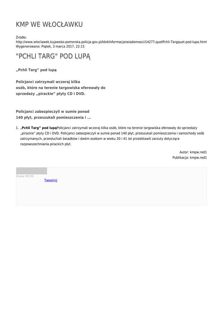 KMP WE WŁOCŁAWKU Źródło: http://www.wloclawek.kujawsko-pomorska.policja.gov.pl/kb4/informacje/wiadomosci/14277,quotPchli-Targquot-pod-lupa.html Wygenerowano: Piątek, 3 marca 2017, 22:15 "PCHLI TARG" POD LUPĄ „Pchli Targ” pod lupą Policjanci zatrzymali wczoraj kilka osób, które na terenie targowiska oferowały do sprzedaży „pirackie” płyty CD i DVD. Policjanci zabezpieczyli w sumie ponad 140 płyt, przeszukali pomieszczenia i ... 1. „Pchli Targ” pod lupąPolicjanci zatrzymali wczoraj kilka osób, które na terenie targowiska oferowały do sprzedaży „pirackie” płyty CD i DVD. Policjanci zabezpieczyli w sumie ponad 140 płyt, przeszukali pomieszczenia i samochody osób zatrzymanych, przesłuchali świadków i dwóm osobom w wieku 20 i 41 lat przedstawili zarzuty dotyczące rozpowszechniania pirackich płyt. Autor: kmpw.red1 Publikacja: kmpw.red1 Ocena: 0/5 (0) Tweetnij