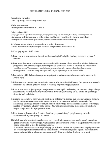 REGULAMIN JURA FUTSAL CUP 2015 Organizator turnieju: Jura Cup Łazy, Park Wodny Jura Łazy Miejsce rozgrywek: -Hala sportowa w Porębie ul. LWP 4 Cele i zadania JFC: -propagowanie wysiłku fizycznego,który przedłuży się na dobrą kondycję i samopoczucie -stworzenie miłośnikom gry w piłkę nożną możliwości rywalizacji z innymi zespołami -zintegrować środowisko piłkarskie poprzez zachowanie zasad Fair-Play. 1) W grze bierze udział 4 zawodników w polu + bramkarz. -liczba zawodników zgłoszonych na liście nie powinna przekraczać 10. 2) Czas gry wynosi 1x17 minut. 3) Przy rzucie z autu, rożnym i rzucie wolnym odległość od piłki drużyny broniącej wynosi 5 metrów. 4) Przy aucie bramkowym bramkarz wprowadza piłkę do gry ręką,w dowolne miejsce boiska, w przypadku autu bramkowego i podania piłki do bramkarza ma on 4 sekundy na podanie do współpartnera. Taka sama sytuacja jest w przypadku gdy wprowadza się piłkę z rzutu rożnego,autu i rzutu wolnego (na gwizdek) wykonywanego przez zawodnika. 5) Po podaniu piłki do bramkarza przez współpartnera do własnego bramkarza nie może on jej przejąć ręką. 6) Z bramkarzem można grać na połowie przeciwnika dowolną ilość czasu (np. gra w przewadze), natomiast na własnej połowie ma on 4 sekundy na ponowne jej zagranie. 7) Rzut z autu wykonuje się noga z miejsca opuszczenia piłki za boisko, nie można z niego zdobyć bezpośrednio bramki,piłka przy wznowieniu może znajdować się do 50 cm za linią,ale stopa nie może być na boisku. 8) Zmiany zawodników odbywają się systemem hokejowym i mogą być przeprowadzone tylko w strefie zmian,najpierw zawodnik opuszcza plac gry,a następnie wchodzi zmiennik. Gdy zawodnicy dokonają zmiany w innym miejscu niż do tego przeznaczone,zawodnik wchodzący na plac gry zostanie ukarany żółtą kartką Zawodnik kontuzjowany może opuścić boisko w innym miejscu niż do tego przeznaczone. 9) Rzut karny wykonuje się z 6 metra. Rzut karny ,,przedłużony'' podyktowany za faule akumulowane wykonuje się z 10 metra. 10) Jeżeli zawodnik zostanie wykluczony z gry przed jej rozpoczęciem, może zostać zastąpiony przez zawodnika rezerwowego. Wykluczeni z gry zawodnicy winni w ciągu minuty udać się do szatni i pozostać w niej do końca zawodów. Zawodnik rezerwowy może wejść do gry po upływie 2 minut od wykluczenia współpartnera,o ile wcześniej drużyna osłabiona nie straci bramki. W takim przypadku : jeżeli 4 zawodników gra przeciwko 5 i tracą bramkę,mogą uzupełnić skład,jeżeli obie drużyny mają po 4 zawodników i pada bramka to drużyna która straciła bramkę uzupełnia skład o brakującego zawodnika, jeżeli 3 zawodników gra przeciwko 4 lub 5 i traci bramkę, mogą uzupełnić skład tylko o jednego zawodnika,jeżeli obie drużyny maja po 3 zawodników i pada bramka to drużyna która straciła bramkę uzupełnia skład o jednego zawodnika. Jeżeli drużyna grająca w osłabieniu strzela bramkę nie uzupełnia składu przed upływem 2 minut od chwili wykluczenia zawodnika. Uzupełnienie składu wymaga zgody sędziego. 11) Zabrania się gry wślizgiem,za grę wślizgiem będzie dyktowany rzut wolny bezpośredni lub rzut karny jeżeli jeżeli przewinienie zostało dokonane w polu karnym. Przewinienia te będą wliczane w faule akumulowane. 12) Za naruszenie nietykalności cielesnej i fizycznym znieważeniu innych osób biorących udział w grze i poza nią,wysoce niesportowym,grubiańskim i ordynarnym zachowaniu się przed,w czasie i po zawodów przeprowadzone zostanie postępowanie dyscyplinarne przez organizatora turnieju. 13) Organizator zastrzega sobie prawo do ewentualnych zmian w regulaminie,podejmuje decyzje o ewentualnych dyskwalifikacjach. 14) Za sportowe zachowanie drużyny podczas turnieju odpowiada kierownik lub kapitan drużyny - zawodnicy i osoby towarzyszące drużynie zobowiązane są do przestrzegania reg.obiektu -organizator nie ponosi odpowiedzialności za rzeczy pozostawione w szatniach,na obiekcie lub ich zaginieciu. 15) Ewentualne ubezpieczenie na czas turnieju drużyna załatwia we własnym zakresie - organizator zapewnia pomoc medyczną na czas turnieju - organizatorzy turnieju nie ponoszą odpowiedzialności prawnej za wypadki wynikające z udziałem osób chorych i zdrowych oraz skutki wypadków podczas trwania turnieju. 16) Osoby niepełnoletnie,chcące wziąć udział w turnieju,muszą posiadać pisemną zgodę rodziców lub opiekuna prawnego i dostarczyć przed pierwszym meczem przez kierownika drużyny. 17) Każdy zawodnik podpisuje oświadczenie o posiadaniu aktualnych badań lekarskich,braku przeciw wskazań zdrowotnych i własnej odpowiedzialności za swoje zdrowie w związku z udziałem w turnieju. 18) Na terenie obiektu obowiązuje bezwzględny zakaz: -spożywania alkoholu,palenia papierosów, używania środków odurzających - przebywania w stanie nietrzezwym -dopuszczania się zachowań stwarzających zagrożenie dla innych uczestników Osoby które nie będą stosowały się do tych zaleceń będą usunięte z obiektu. 19) Formularz zgłoszeniowy,zgoda rodziców,oświadczenia do pobrania na stronie www.juracuplazy.pl System rozgrywek: W turnieju bierze udział 16 zespołów tworzących 4 grupy-4 zespołowe. Z każdej grupy do ćwierćfinału wychodzą po 2 najlepsze zespoły z najlepszym dorobkiem punktowym,w przypadku takiej samej ilości punktów między zainteresowanymi zespołami decyduje bezpośrednie spotkanie, kolejno stosunek bramek. Od ćwierćfinału obowiązuje system pucharowy, w przypadku remisu wykonywane są rzuty karne (po 3) następnie do skutku. Nagrody; 1 miejsce -1000 złotych, okazały puchar, medale 2 miejsce- sprzęt sportowy,okazały puchar,medale 3 miejsce -sprzęt sportowy,okazały puchar,medale 4 miejsce -puchar plus nagroda rzeczowa Puchar+ nagroda rzeczowa dla najlepszego: -zawodnika -bramkarza -strzelca Pamiątkowe puchary i medale dla każdej drużyny. Puchar Fair-Play Puchar