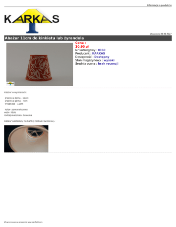 Informacje o produkcie Utworzono 03-03-2017 Abażur 11cm do kinkietu lub żyrandola Cena : 20,90 zł Nr katalogowy : ID60 Producent : KARKAS Dostępność : Dostępny Stan magazynowy : wysoki Średnia ocena : brak recenzji Abażur o wymiarach: średnica dolna - 11cm średnica górna - 7cm wysokość - 11cm kolor- pomarańczowy wzór- liście rodzaj materiału- bawełna Abażur nakładany na bańkę żarówki świecowej. Wygenerowano w programie www.oscGold.com