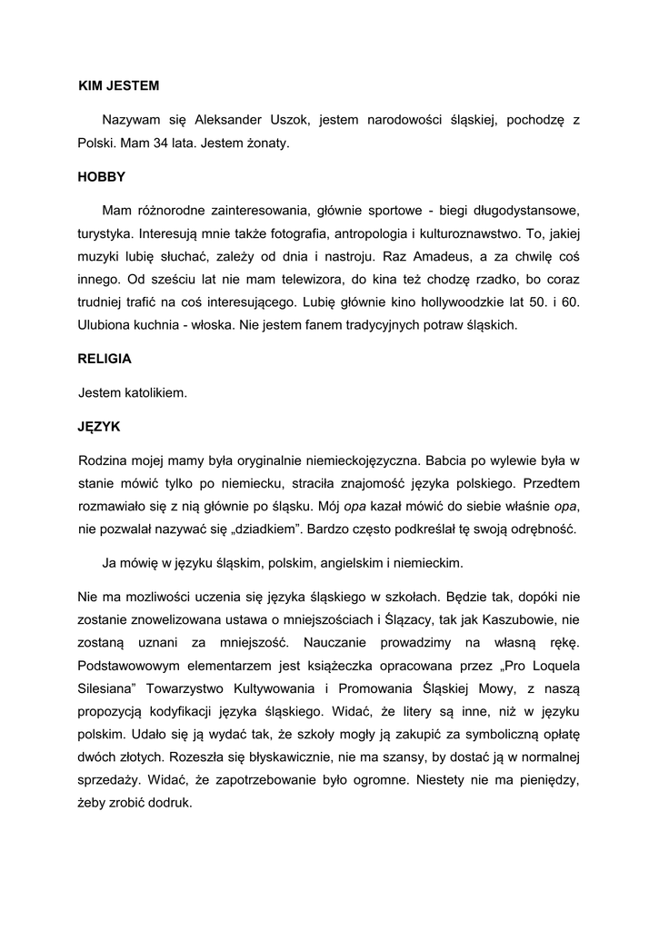 KIM JESTEM Nazywam się Aleksander Uszok, jestem narodowości śląskiej, pochodzę z Polski. Mam 34 lata. Jestem żonaty. HOBBY Mam różnorodne zainteresowania, głównie sportowe - biegi długodystansowe, turystyka. Interesują mnie także fotografia, antropologia i kulturoznawstwo. To, jakiej muzyki lubię słuchać, zależy od dnia i nastroju. Raz Amadeus, a za chwilę coś innego. Od sześciu lat nie mam telewizora, do kina też chodzę rzadko, bo coraz trudniej trafić na coś interesującego. Lubię głównie kino hollywoodzkie lat 50. i 60. Ulubiona kuchnia - włoska. Nie jestem fanem tradycyjnych potraw śląskich. RELIGIA Jestem katolikiem. JĘZYK Rodzina mojej mamy była oryginalnie niemieckojęzyczna. Babcia po wylewie była w stanie mówić tylko po niemiecku, straciła znajomość języka polskiego. Przedtem rozmawiało się z nią głównie po śląsku. Mój opa kazał mówić do siebie właśnie opa, nie pozwalał nazywać się „dziadkiem”. Bardzo często podkreślał tę swoją odrębność. Ja mówię w języku śląskim, polskim, angielskim i niemieckim. Nie ma mozliwości uczenia się języka śląskiego w szkołach. Będzie tak, dopóki nie zostanie znowelizowana ustawa o mniejszościach i Ślązacy, tak jak Kaszubowie, nie zostaną uznani za mniejszość. Nauczanie prowadzimy na własną rękę. Podstawowowym elementarzem jest książeczka opracowana przez „Pro Loquela Silesiana” Towarzystwo Kultywowania i Promowania Śląskiej Mowy, z naszą propozycją kodyfikacji języka śląskiego. Widać, że litery są inne, niż w języku polskim. Udało się ją wydać tak, że szkoły mogły ją zakupić za symboliczną opłatę dwóch złotych. Rozeszła się błyskawicznie, nie ma szansy, by dostać ją w normalnej sprzedaży. Widać, że zapotrzebowanie było ogromne. Niestety nie ma pieniędzy, żeby zrobić dodruk. Został również wydany podręcznik dla starszych dzieci, które bardzo często mówią po śląsku, ale jest to dalekie od poprawności. Dzięki tej książce mogą zgłębić wiedzę dotyczącą swojego języka, zobaczyć jakie są reguły i jakie błędy nieświadomie popełaniały. RODZINA Pochodzę z rodziny czysto śląskiej. Ze strony mojej mamy była ona zdecydowanie niemiecka. Kultura niemiecka była dla nich czymś naturalnym, jednak jej członkowie identyfikowali się przede wszystkim jako Ślązacy. Ta część rodziny pochodzi z Gliwic, które do II wojny światowej były niemieckie. Rozmawiając ze swoimi starszymi wujkami, mieszkającymi dzisiaj w Zagłębiu Ruhry, poruszyłem wątek tożsamości. Oni wciąż postrzegają siebie przede wszystkim jako Ślązaków. Mają szczęście, że mieszkają w społeczeństwach bardzo złożonych - dla Niemców to normalne, że pierwszym etapem jest tożsamość lokalna, regionalna. W Zagłębiu Ruhry funkcjonuje piękne Muzeum Śląskie, a w mieście Essen finansowana jest Izba Pamięci o Zabrzu. Kładzie się duży nacisk na kultywowanie związku z miejscem pochodzenia. Nie ma prób szykowania czy spychania tego, jako niebezpiecznego dla jedności państwa. Wręcz przeciwnie - w tej różnorodności widzi się wartość. Miliony euro są przekazywane na kulturę śląską, która jest komponentem kultury niemieckiej na danym obszarze. TOŻSAMOŚĆ Tożsamość… Im ogólniej mówimy o tożsamości, tym sprawa wydaje się prostsza, a im bardziej próbujemy sprawę sprecyzować, tym mocniej się gmatwamy i trafiamy na większe problemy. Uważam, że należy przyjąć założenie, iż tożsamość w wymiarze społecznym, to coś bardzo mocno związanego z jakimś określonym terytorium. Zatem jej złożoność będzie odpowiadała złożoności dziejowej danego regionu. Dlatego uważam, że tożsamość górnośląska z konieczności jest odmienna. Na naszą tożsamość wpływa przede wszystkim historia i kultura, która tutaj, na Górnym Śląsku, od zawsze była bardzo niejednoznaczna. To różnorodne wpływy, wielość kultur i narodów. Górny Śląsk nazywany był obszarem pogranicza. Teraz mamy tylko jedną granicę, tę pomiędzy Polską a Niemcami. Jednak uważam, że w sensie kulturowym i symbolicznym nastąpiło odrodzenie kultury pogranicza – te wątki znowu zaczynają na Górnym Śląsku odżywać. Na przykład niemieckie części tej kultury na wielu płaszczyznach przestają być tematem tabu. W przeszłości bywały próby stłamszenia niemieckiej tożsamości, wyeliminowania jej z powszechnej pamięci i świadomości. W najbardziej drastycznych przypadkach przypominają to dzisiaj akty wymazywania napisów w języku niemieckim na pomnikach, niszczenia cmentarzy, na których są pochowani Ślązacy narodowości niemieckiej itp. Historycznie wpływ kultury niemieckiej na rozwój Górnego Śląska jest czymś nie do zakwestionowania. Na szczęście dzisiaj coraz rzadziej próbuje się temu zaprzeczać i zaczyna być to przyjmowane jako fakt. Tylko skrajne środowiska postrzegają niemieckość Śląska jako coś negatywnego; pojawiają się wypowiedzi określające Ślązaków jako ukrytą opcję niemiecką. JAK KSZAŁTOWAŁO SIĘ MOJE POCZUCIE TOŻSAMOŚCI NARODOWEJ I ETNICZNEJ W wymiarze bardziej osobistym tożsamość opiera się na pewnego rodzaju deklaracji i stanowi osobisty wybór. Najczęściej sami decydujemy, kim jesteśmy. Myślę o sobie przede wszystkim jako o Ślązaku, deklaruję to przy każdej okazji. Dopiero w dalszej kolejności czuję się Polakiem. Jest to postawa dość powszechna, przynajmniej w tym środowisku, z którym mam najczęściej kontakt. Powody takich wyborów są różnorodne - nie chciałbym wypowiadać się w imieniu innych. Natomiast czynniki, które decydują o tożsamości, są różnorodne. Dla mnie śląskość jest przede wszystkim wartością samą w sobie. Staram się podchodzić do niej w sposób krytyczny; nie przyjmuję jej z całym dobrodziejstwem inwentarza i na ślepo. Wydaje mi się, że nigdy nie traktowaliśmy naszej śląsko