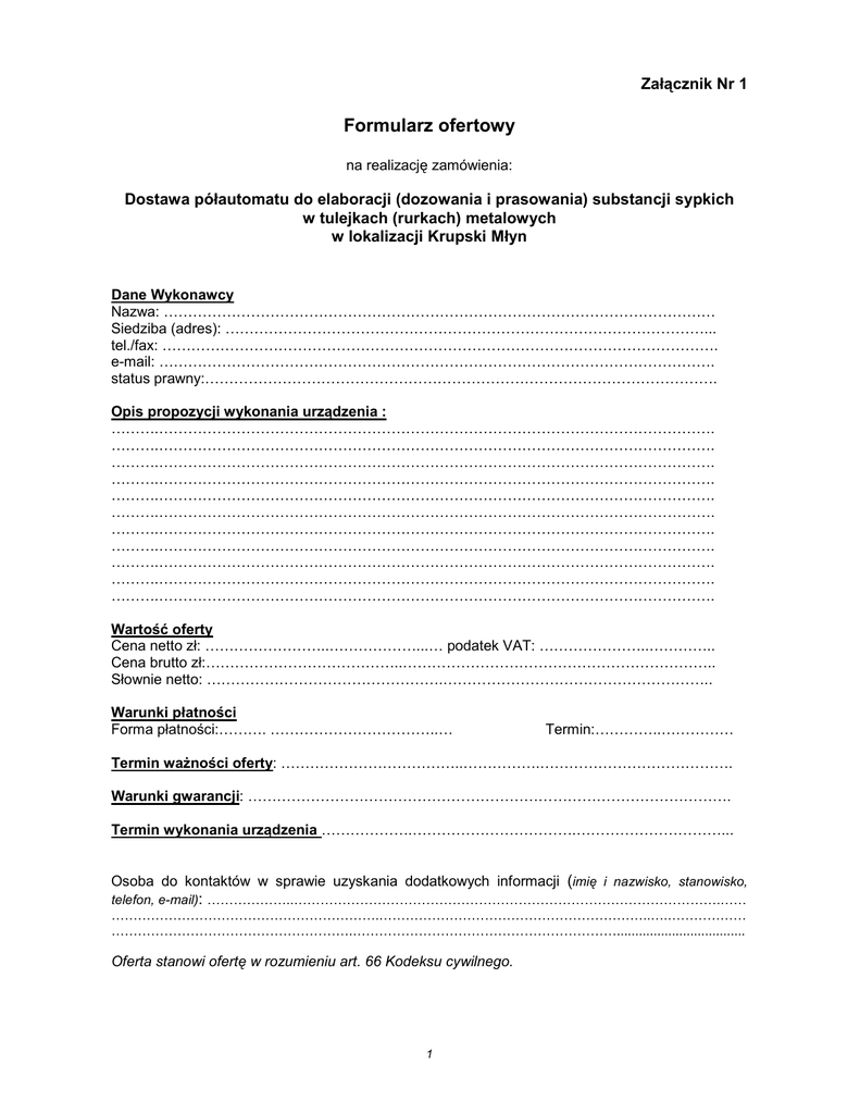 Załącznik Nr 1 Formularz ofertowy na realizację zamówienia: Dostawa półautomatu do elaboracji (dozowania i prasowania) substancji sypkich w tulejkach (rurkach) metalowych w lokalizacji Krupski Młyn Dane Wykonawcy Nazwa: …………………………………………………………………………………………………… Siedziba (adres): ………………………………………………………………………………………... tel./fax: ……………………………………………………………………………………………………. e-mail: ……………………………………………………………………………………………………. status prawny:……………………………………………………………………………………………. Opis propozycji wykonania urządzenia : ……….……………………………………………………………………………………………………. ……….……………………………………………………………………………………………………. ……….……………………………………………………………………………………………………. ……….……………………………………………………………………………………………………. ……….……………………………………………………………………………………………………. ……….……………………………………………………………………………………………………. ……….……………………………………………………………………………………………………. ……….……………………………………………………………………………………………………. ……….……………………………………………………………………………………………………. ……….……………………………………………………………………………………………………. ……….……………………………………………………………………………………………………. Wartość oferty Cena netto zł: ……………………..………………...… podatek VAT: …………………..………….. Cena brutto zł:…………………………………..……………………………………………………….. Słownie netto: ………………………………………….……………………………………………….. Warunki płatności Forma płatności:………. ……………………………..… Termin:…………..…………… Termin waŜności oferty: ………………………………..…………….…………………………………. Warunki gwarancji: ………………………………………………………………………………………. Termin wykonania urządzenia ……………….…………………………….…………………………... Osoba do kontaktów w sprawie uzyskania dodatkowych informacji (imię i nazwisko, stanowisko, telefon, e-mail): ………………..…………………………………………………………………………………….…… …………………………………………………….……………………………………………………..….……………… ……………………………………………….……………………………………………………................................... Oferta stanowi ofertę w rozumieniu art. 66 Kodeksu cywilnego. 1 Oświadczenia: 1. Oświadczamy, Ŝe posiadamy uprawnienia oraz niezbędną wiedzę, doświadczenie i dysponujemy potencjałem technicznym i osobami zdolnymi do wykonania zamówienia. 2. Oświadczamy, Ŝe znajdujemy się w sytuacji ekonomicznej i finansowej zapewniającej wykonanie zamówienia. 3. Oświadczamy, Ŝe zapoznaliśmy się ze Specyfikacją Istotnych Warunków Zamówienia i nie wnosimy do niej zastrzeŜeń oraz, Ŝe zdobyliśmy konieczne informacje do przygotowania oferty. 4. Oświadczamy, Ŝe uwaŜamy się za związanych niniejszą ofertą na czas określony powyŜej. 5. Oświadczamy, Ŝe zapoznaliśmy się w terenie z zakresem prac określonych w SIWZ i wymaganiami technicznymi dotyczącymi przedmiotu zamówienia. 6. Oświadczamy, Ŝe zapoznaliśmy się z treścią załączników do niniejszej Specyfikacji i przyjmujemy je bez zastrzeŜeń. 7. Oświadczamy, iŜ wszystkie informacje zamieszczone w ofercie są prawdziwe (za składanie nieprawdziwych informacji Oferent odpowiada zgodnie z art. 270 KK). Oferta została złoŜona na .…. stronach, kolejno ponumerowanych i podpisanych. 1 Załączniki do niniejszego formularza: 1. Opis urządzenia, wymiary, rysunki, zdjęcia etc 2. ……………………………………………………………………………… 3. ……………………………………………………………………………… 4. ……………………………………………………………………………… 5. ……………………………………………………………………………… 6. ……………………………………………………………………………… 7. ……………………………………………………………………………… 8. ……………………………………………………………………………… 9. ……………………………………………………………………………… ……………………….………… ………………………………………………… Miejsce i data 1 Podpis Wykonawcy (zgodnie z reprezentacją firm) wraz z pieczęcią imienną i firmową W tym wymagane oświadczenia i zaświadczenia – zgodnie z rozdziałem II SIWZ. 2