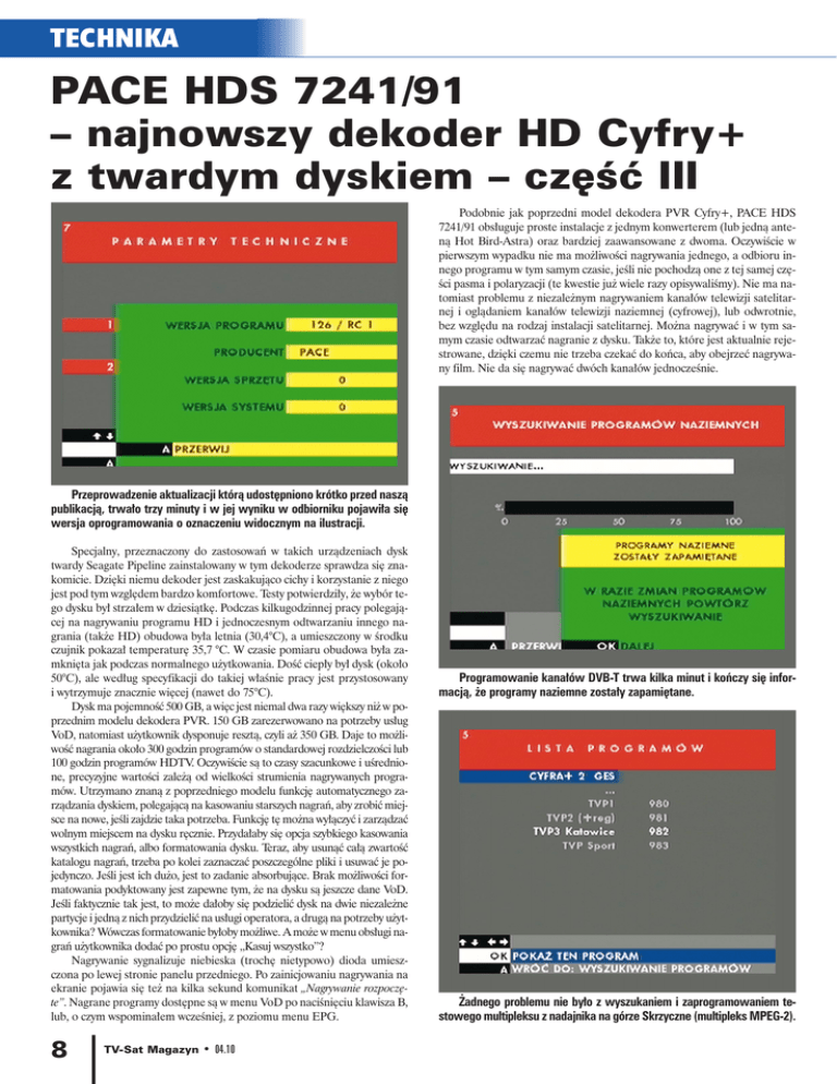 TECHNIKA PACE HDS 7241/91 – najnowszy dekoder HD Cyfry+ z twardym dyskiem – część III Podobnie jak poprzedni model dekodera PVR Cyfry+, PACE HDS 7241/91 obs³uguje proste instalacje z jednym konwerterem (lub jedn¹ anten¹ Hot Bird-Astra) oraz bardziej zaawansowane z dwoma. Oczywiœcie w pierwszym wypadku nie ma mo¿liwoœci nagrywania jednego, a odbioru innego programu w tym samym czasie, jeœli nie pochodz¹ one z tej samej czêœci pasma i polaryzacji (te kwestie ju¿ wiele razy opisywaliœmy). Nie ma natomiast problemu z niezale¿nym nagrywaniem kana³ów telewizji satelitarnej i ogl¹daniem kana³ów telewizji naziemnej (cyfrowej), lub odwrotnie, bez wzglêdu na rodzaj instalacji satelitarnej. Mo¿na nagrywaæ i w tym samym czasie odtwarzaæ nagranie z dysku. Tak¿e to, które jest aktualnie rejestrowane, dziêki czemu nie trzeba czekaæ do koñca, aby obejrzeæ nagrywany film. Nie da siê nagrywaæ dwóch kana³ów jednoczeœnie. Przeprowadzenie aktualizacji którą udostępniono krótko przed naszą publikacją, trwało trzy minuty i w jej wyniku w odbiorniku pojawiła się wersja oprogramowania o oznaczeniu widocznym na ilustracji. Specjalny, przeznaczony do zastosowañ w takich urz¹dzeniach dysk twardy Seagate Pipeline zainstalowany w tym dekoderze sprawdza siê znakomicie. Dziêki niemu dekoder jest zaskakuj¹co cichy i korzystanie z niego jest pod tym wzglêdem bardzo komfortowe. Testy potwierdzi³y, ¿e wybór tego dysku by³ strza³em w dziesi¹tkê. Podczas kilkugodzinnej pracy polegaj¹cej na nagrywaniu programu HD i jednoczesnym odtwarzaniu innego nagrania (tak¿e HD) obudowa by³a letnia (30,4°C), a umieszczony w œrodku czujnik pokaza³ temperaturê 35,7 °C. W czasie pomiaru obudowa by³a zamkniêta jak podczas normalnego u¿ytkowania. Doœæ ciep³y by³ dysk (oko³o 50°C), ale wed³ug specyfikacji do takiej w³aœnie pracy jest przystosowany i wytrzymuje znacznie wiêcej (nawet do 75°C). Dysk ma pojemnoœæ 500 GB, a wiêc jest niemal dwa razy wiêkszy ni¿ w poprzednim modelu dekodera PVR. 150 GB zarezerwowano na potrzeby us³ug VoD, natomiast u¿ytkownik dysponuje reszt¹, czyli a¿ 350 GB. Daje to mo¿liwoœæ nagrania oko³o 300 godzin programów o standardowej rozdzielczoœci lub 100 godzin programów HDTV. Oczywiœcie s¹ to czasy szacunkowe i uœrednione, precyzyjne wartoœci zale¿¹ od wielkoœci strumienia nagrywanych programów. Utrzymano znan¹ z poprzedniego modelu funkcjê automatycznego zarz¹dzania dyskiem, polegaj¹c¹ na kasowaniu starszych nagrañ, aby zrobiæ miejsce na nowe, jeœli zajdzie taka potrzeba. Funkcjê tê mo¿na wy³¹czyæ i zarz¹dzaæ wolnym miejscem na dysku rêcznie. Przyda³aby siê opcja szybkiego kasowania wszystkich nagrañ, albo formatowania dysku. Teraz, aby usun¹æ ca³¹ zwartoœæ katalogu nagrañ, trzeba po kolei zaznaczaæ poszczególne pliki i usuwaæ je pojedynczo. Jeœli jest ich du¿o, jest to zadanie absorbuj¹ce. Brak mo¿liwoœci formatowania podyktowany jest zapewne tym, ¿e na dysku s¹ jeszcze dane VoD. Jeœli faktycznie tak jest, to mo¿e da³oby siê podzieliæ dysk na dwie niezale¿ne partycje i jedn¹ z nich przydzieliæ na us³ugi operatora, a drug¹ na potrzeby u¿ytkownika? Wówczas formatowanie by³oby mo¿liwe. A mo¿e w menu obs³ugi nagrañ u¿ytkownika dodaæ po prostu opcjê „Kasuj wszystko”? Nagrywanie sygnalizuje niebieska (trochê nietypowo) dioda umieszczona po lewej stronie panelu przedniego. Po zainicjowaniu nagrywania na ekranie pojawia siê te¿ na kilka sekund komunikat „Nagrywanie rozpoczête”. Nagrane programy dostêpne s¹ w menu VoD po naciœniêciu klawisza B, lub, o czym wspomina³em wczeœniej, z poziomu menu EPG. 8 TV-Sat Magazyn • 04.10 Programowanie kanałów DVB-T trwa kilka minut i kończy się informacją, że programy naziemne zostały zapamiętane. Żadnego problemu nie było z wyszukaniem i zaprogramowaniem testowego multipleksu z nadajnika na górze Skrzyczne (multipleks MPEG-2). TECHNIKA Nowy pilot do dekodera Pace HD PVR Na ekranie lokalny program TVK Katowice. Plusem jest niezale¿na obecnoœæ sygna³u wideo na wyjœciach SCART i HDMI. Programy cyfrowej telewizji naziemnej (DVB-T) zapisywane s¹ na liœcie kana³ów standardowo dla dekoderów Cyfry+, na pozycjach od 980. Korzystaj¹c z dostêpnoœci sygna³u DVB-T naszych po³udniowych s¹siadów, chcia³em sprawdziæ, czy nie bêdzie problemów z odbiorem kana³ów telewizji zagranicznych, jeœli odbiornik znajdzie siê w ich zasiêgu. Mieszkañcy stref przygranicznych mogliby wówczas odbieraæ cyfrow¹ telewizjê naziemn¹, bez wzglêdu na to jak skandaliczne opóŸnienia w jej wdra¿aniu bêdziemy obserwowaæ na polskim rynku. Niestety, nie uda³o siê tej mo¿liwoœci potwierdziæ. Poziom sygna³u czeskich multipleksów nie by³ co prawda tak silny jak docieraj¹cy z polskiego nadajnika, ale mimo to by³ wystarcza- j¹cy, aby odbieraæ bez problemów czeskie programy za pomoc¹ zewnêtrznych tunerów DVB-T i odpowiednio wyposa¿onych telewizorów. Tymczasem PACE HDS 7241/91 nie wyszuka³ czeskich stacji (testowaliœmy mo¿liwoœci na trzech antenach w odleg³oœci oko³o 60 km od granicy z Czechami), co wskazywa³oby na ni¿sz¹ czu³oœæ g³owicy tego dekodera. Jednak to zagadnienie wymaga jeszcze weryfikacji. Pozosta³e opcje, dla opisu których, niestety, zabrak³o miejsca, zorganizowano podobnie jak w dekoderze Philips DSR 7201/91. Odtwarzanie nagrañ, przewijanie, timeshifting, timer, blokadê rodzicielsk¹, wybór fonii i napisów, lista kana³ów (bez mo¿liwoœci edycji) czy ustawienia podstawowej konfiguracji obs³uguje siê tak samo. W pierwszej czêœci artyku³u prezentowaliœmy model pilota, jaki dotar³ do nas w paczce z dekoderem. Takie piloty by³y do³¹czane do pierwszej serii urz¹dzeñ. Obecnie dekodery wyposa¿ane s¹ w piloty przedstawione na fotografii. Opracowa³ Z. Marchewka. Ilustracje autora Specyfikacja techniczna dekodera PACE HDS 7241/91 (według instrukcją o