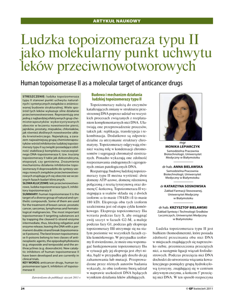 SŁOWA KLUCZOWE: leki przeciwnowotworowe, ludzka topoizomeraza typu II, inhibitory topoizomerazy II