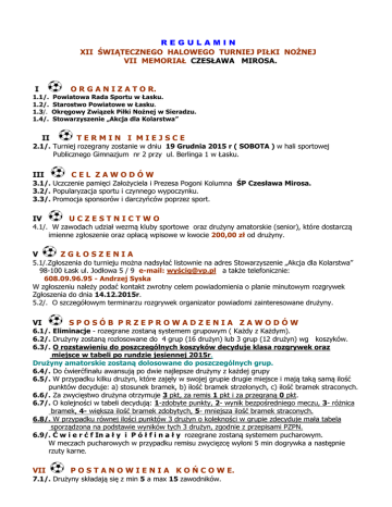 REGULAMIN XII ŚWIĄTECZNEGO HALOWEGO TURNIEJ PIŁKI NOŻNEJ VII MEMORIAŁ CZESŁAWA MIROSA. I O R G A N I Z A T O R. 1.1/. 1.2/. 1.3/. 1.4/. II Powiatowa Rada Sportu w Łasku. Starostwo Powiatowe w Łasku. Okręgowy Związek Piłki Nożnej w Sieradzu. Stowarzyszenie „Akcja dla Kolarstwa” TERMIN I MIEJSCE 2.1/. Turniej rozegrany zostanie w dniu 19 Grudnia 2015 r ( SOBOTA ) w hali sportowej Publicznego Gimnazjum nr 2 przy ul. Berlinga 1 w Łasku. III CEL ZAWODÓW 3.1/. Uczczenie pamięci Założyciela i Prezesa Pogoni Kolumna ŚP Czesława Mirosa. 3.2/. Popularyzacja sportu i czynnego wypoczynku. 3.3/. Promocja sponsorów i darczyńców poprzez sport. IV UCZESTNICTWO 4.1/. W zawodach udział wezmą kluby sportowe oraz drużyny amatorskie (senior), które dostarczą imienne zgłoszenie oraz opłacą wpisowe w kwocie 200,00 zł od drużyny. V ZGŁOSZENIA 5.1/.Zgłoszenia do turnieju można nadsyłać listownie na adres Stowarzyszenie „Akcja dla Kolarstwa” 98-100 Łask ul. Jodłowa 5 / 9 e-mail: wyś[email protected] a także telefonicznie: 608.09.96.95 - Andrzej Syska W zgłoszeniu należy podać kontakt zwrotny celem powiadomienia o planie minutowym rozgrywek Zgłoszenia do dnia 14.12.2015r. 5.2/. O szczegółowym terminarzu rozgrywek organizator powiadomi zainteresowane drużyny. VI SPOSÓB PRZEPROWADZENIA ZAWODÓW VII P O S T A N O W I E N I A K O Ń C O W E. 6.1/. Eliminacje - rozegrane zostaną systemem grupowym ( Każdy z Każdym). 6.2/. Drużyny zostaną rozlosowane do 4 grup (16 drużyn) lub 3 grup (12 drużyn) wg koszyków. 6.3/. O rozstawieniu do poszczególnych koszyków decyduje klasa rozgrywek oraz miejsce w tabeli po rundzie jesiennej 2015r. Drużyny amatorskie zostaną dolosowane do poszczególnych grup. 6.4/. Do ćwierćfinału awansują po dwie najlepsze drużyny z każdej grupy 6.5/. W przypadku kilku drużyn, które zajęły w swojej grupie drugie miejsce i mają taką samą ilość punktów decyduje: a) stosunek bramek, b) ilość bramek strzelonych, c) ilość bramek straconych. 6.6/. Za zwycięstwo drużyna otrzymuje 3 pkt, za remis 1 pkt i za przegraną 0 pkt. 6.7/. O kolejności w tabeli decydują: 1-zdobyte punkty, 2- wynik bezpośredniego meczu, 3- różnica bramek, 4- większa ilość bramek zdobytych, 5- mniejsza ilość bramek straconych. 6.8/. W przypadku równej ilości punktów 3 drużyn o kolekności w grupie zdecyduje mała tabela sporządzona na podstawie wyników tych 3 drużyn, zgodnie z przepisami PZPN. 6.9/. Ć w i e r ć f In a ł y i P ó ł f i n a ł y rozegrane zostaną systemem pucharowym. W meczach pucharowych w przypadku remisu zwycięzcę wyłoni 5 min dogrywka a następnie rzuty karne. 7.1/. Drużyny składają się z min 5 a max 15 zawodników. 7.2/. 7.3/. 7.4/. 7.5/. 7.6/. 7.7/. 7.8/. W jednym meczu występuje 4 zawodników + bramkarz ( 5 osób). Wszystkie mecze trwają 15 min bez przerw i zmiany stron. Organizator na znak sędziego, wstrzymuje odliczanie czasu meczu . Dokonywanie zmian w trakcie meczu dowolne. Gra toczy się w obrębie boiska, dyktuje się rzuty rożne. . Auty wykonywane są zagraniem nogą. Przy rozpoczęciu gry po aucie bramkowym, bramkarz może wyrzucić piłkę na swojej połowie, po złym wyrzucie piłki przez bramkarza, sędzia dyktuje rzut wolny pośredni. 7.9/. Nie wolno stosować wślizgów. 7.10/. Stosowane będą kary: wykluczenie na 2 min, wykluczenie z meczu /kartka czerwona/ i wykluczenie z turnieju / dwie kartki czerwone/* 7.11/. Po otrzymaniu czerwonej kartki, zawodnik nie może grać w pierwszym następnym meczu. 7.12/. Każdy uczestnik występuje w turnieju na swoją odpowiedzialność. 7.13/. Zawodnicy muszą być ubezpieczeni przez macierzyste kluby, natomiast drużyny amatorskie winny ubezpieczyć się od nieszczęśliwych wypadków. 7.14/. Organizator nie ponosi odpowiedzialności za kontuzje i nieszczęśliwe wypadki oraz nie odpowiada za rzeczy zagubione, pozostawione lub skradzione. 7.15/. Po dotknięciu przez piłkę sufitu lub kosza, sędzia zarządza rzut wolny pośredni. 7.16/. Opiekę medyczną (lekarz) oraz licencjonowanych sędziów zapewnia organizator. 7.17/. Listę zgłoszeń należy wypełnić czytelnie drukowanymi literami, celem uniknięcia pomyłek przez spikera zawodów. 7.18/. Kierownik drużyny ponosi odpowiedzialność za zapoznanie zawodników z powyższym regulaminem. 7.19/. W czasie trwania turnieju wszelkie uwagi, skargi i protesty może zgłaszać jedynie kapitan drużyny. Uwagi te rozpatrywane będą w obecności: Sędziego Głównego danego meczu, organizatora i kapitana drużyny. 7.20/. W przypadku sporów organizator ma prawo konsultacji z pozostałymi sędziami. 7.21/. Wszelkie ewentualne uwagi i poprawki do regulaminu mogą być zgłoszone i naniesione przed rozpoczęciem turnieju. Po w/w terminie regulamin uważa się za zatwierdzony do przestrzegania i respektowania. 7.22/. Sędziowie zawodów z OZPN Sieradz. 7.23/. Każdy mecz prowadzi dwóch sędziów. 7.24/. Przy wszelkich sporach (mała tabela) decydują przepisy PZPN. VIII NAGRODY. 8.1/. Drużyny, które zajmą miejsca od 1 do 4 otrzymają nagrody rzeczowe i puchary. 8.2/. Najlepszy strzelec turnieju otrzyma nagrodę i statuetkę. 8.3/. Najlepszy bramkarz turnieju otrzyma nagrodę i statuetkę. 8.4/. Najlepszy zawodnik turnieju otrzyma nagrodę i statuetkę. ORGANIZATORZY