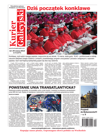 Dziś początek konklawe gosc.pl kurier galicyjski Niezależne pismo Polaków na Ukrainie www.kuriergalicyjski.com 12–25 marca 2013 nr 5 (177) Konklawe, czyli wybór nowego papieża, rozpocznie się we wtorek, 12 marca, około godz. 16:45 – poinformował w sobotę rzecznik Watykanu ksiądz Federico Lombardi, przedstawiając program uroczystości i procedur związanych z wyborem papieża. Dym nad Kaplicą Sykstyńską pojawi się dwa razy dziennie. O godz. 16:30, we wtorek rozpocznie się procesja 115 kardynałów elektorów, którzy przejdą z Kaplicy Paulińskiej Pałacu Apostolskiego do Kaplicy Sykstyńskiej. Po przybyciu do miejsca wyboru papieża purpuraci złożą przysięgę. Po tym obrzędzie Mistrz Papieskich Ceremonii Liturgicznych wyda polecenie extra omnes, po którym wszyscy, którzy nie biorą udziału w konklawe, opuszczą Kaplicę Sykstyńską. Jej drzwi zostaną zamknięte. Wcześniej, o godz. 10 w Bazylice św. Piotra kardynałowie zgromadzą się na mszy pro eligendo Papa, czyli w intencji wyboru papieża. Przewodniczyć jej będzie dziekan Kolegium Kardynalskiego kard. Angelo Sodano. Od wtorkowego poranka kardynałowie elektorzy mieszkać będą w Domu Świętej Marty. Ksiądz Lombardi wyjaśnił, że czarnego dymu, obwieszczającego brak wyboru papieża, bądź wreszcie białego, oznaczającego jego elekcję, należy spodziewać się po południowej inauguracji konklawe we wtorek i tylko jednym wtedy głosowaniu około godziny 19. W następnych dniach odbywać się będą po dwa głosowania zarów- no rano, jak i po południu. Gdyby wyboru dokonano już w pierwszym, to biały dym pojawi się rano między godz. 10:30 a 11 albo po południu między 17:30–18. Dym po drugim z głosowań widać będzie albo około południa albo ok. godz. 19. Watykański rzecznik przypomniał, że w ciągu ostatniego stulecia kolejne konklawe były zazwyczaj krótkie i trwały od dwóch do czterech dni. Przedstawił następnie szczegółowy harmonogram godzinowy w dniach konklawe. W pierwszym dniu kardynałowie opuszczą Kaplicę Sykstyńską około 19.30. Pół go- dziny później zasiądą do kolacji w Domu Świętej Marty. Począwszy od środy 13 marca elektorzy będą jeść śniadanie w godzinach 6:30–7:30. Po nim o godz. 8:15 będą się zbierać na mszy w Kaplicy Paulińskiej. Od godz. 9:30 do 12:30 przebywać będą w Kaplicy Sykstyńskiej. Po obiedzie i odpoczynku wrócą do niej o godz. 16. Popołudniowa sesja kończyć się będzie modlitwą przed godz. 19:30. W konklawe będzie uczestniczyć czterech kardynałów – elektorów z Polski. Z Ukrainy nie będzie nikogo. Obydwaj kardynałowie z Ukrainy: Marian Jaworski i Lubomyr Huzar przekroczyli wiek 80 lat, co automatycznie eliminuje ich z uczestnictwa w konklawe. Na konferencji prasowej, gdy dziennikarze pytali rzecznika Watykanu, czy dym będzie miał wyraźny kolor i czy nie powtórzą się kłopoty z ustaleniem jego barwy, tak jak było przed ośmioma laty, ksiądz Lombardi zauważył żartobliwie: „Ale także na tym polega piękno tego wydarzenia, stan niepewności stanowi część takich chwil”. Dodał jednak, że dym biały „będzie na pewno biały”. na podstawie korespondencji PAP z Watykanu POWSTANIE UNIA TRANSATLANTYCKA? Realizacja projektu sprawiłaby, że powstałby wolny rynek handlu i inwestycji na obszarze zamieszkałym przez 800 mln ludzi. Byłaby to największa i potencjalnie najsilniejsza organizacja gospodarcza świata. MARCIN ROMER Decyzja polityczna, czyli rodzaj listu intencyjnego została już podjęta po obu stronach Atlantyku. Zamiar potwierdził w swoim orędziu o stanie państwa prezydent USA Barrack Obama. Kilka tygodni temu polityczną decyzję podjęcia rozmów w sprawie traktatu zapowiedzieli szef Komisji Europejskiej Jose Manuel Barroso oraz przewodniczący Rady Europejskiej Herman Van Rompuy. Negocjacje miałyby się rozpocząć do połowy bieżącego roku, a zakończyć na początku 2015 roku. Na dzień dzisiejszy obrót towarowy pomiędzy UE i USA sięga wartości 2 mld euro dziennie. To połowa produkcji gospodarczej całego świata. Realizacja projektu sprawiłaby, że powstałby wolny rynek handlu i inwestycji na obszarze zamieszkałym przez 800 mln ludzi. Byłaby to największa i potencjalnie najsilniejsza organizacja gospodarcza świata. Niektórzy komentatorzy określają to jako „wspólny front Zachodu wobec rosnącej konkurencji Chin i Indii”. O Rosji i organizowanej przez nią Unii Celnej nikt nawet nie wspomina. To sojusz państw technologicznie zapóźnionych. „Przyszła umowa między dwoma największymi gospodarczymi mocarstwami świata zmieni reguły gry” – powiedział niedawno szef Komisji Europejskiej José Manuel Barroso. Sytuacja wewnątrz UE, wobec perspektywy zawarcia największego porozumienia gospodarczego w dziejach świata, także ulegnie zmianie. Już dziś ideę tę popierają: Wielka Brytania, Niemcy i Francja, niezależnie od różnic w poglądach co do przyszłości samej UE. Idea nie jest nowa. USA i UE już dwukrotnie negocjowały umowę o wolnym handlu, ale za każdym razem do porozumienia nie doszło. Obecnie sprawa wydaje się mieć realne szanse. Katalizatorem może się okazać... kryzys światowej gospodarki, wymuszający nowe spojrzenie i mobilizujący do efektywnych działań. Negocjatorzy mają wyciągnąć wnioski z dotychczasowych niepowodzeń. „Nie będziemy negocjować zmian, których nie chcemy, na przykład kwestii stosowania hormonów czy GMO” – podkreślił Barroso. Nie będzie też negocjowana pełna unifikacja prawa o ochronie praw intelektualnych, ale jedynie podjęta zostanie próba jego zbliżenia. Może więc się uda. Byłoby to działanie według zasady: „ja nie mam nic, ty nie masz nic – razem mamy akurat tyle żeby zbudować... nową unię”. Co prawda USA i UE jeszcze „coś” mają, ale być może uda im się tym razem dostrzec, że to „coś” to jednak w zmieniającym się świecie nie tak wiel