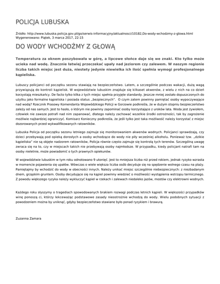 POLICJA LUBUSKA Źródło: http://www.lubuska.policja.gov.pl/go/serwis-informacyjny/aktualnosci/10182,Do-wody-wchodzmy-z-glowa.html Wygenerowano: Piątek, 3 marca 2017, 22:15 DO WODY WCHODŹMY Z GŁOWĄ Temperatura za oknem poszybowała w górę, a lipcowe słońce daje się we znaki. Kto tylko może ucieka nad wodę. Znacznie łatwiej przeczekać upały nad jeziorem czy zalewem. W naszym regionie liczba takich miejsc jest duża, niestety jedynie niewielka ich ilość spełnia wymogi profesjonalnego kąpieliska. Lubuscy policjanci od początku sezonu stawiają na bezpieczeństwo. Latem, a szczególnie podczas wakacji, dużą wagą przywiązują do kontroli kąpielisk. W województwie lubuskim znajduje się kilkaset akwenów, z wielu z nich na co dzień korzystają mieszkańcy. De facto tylko kilka z tych miejsc spełnia przyjęte standardy. Jeszcze mniej zostało dopuszczonych do użytku jako formalne kąpieliska i posiada status ,,bezpiecznych”. O czym zatem powinny pamiętać osoby wypoczywające nad wodą? Rzecznik Prasowy Komendanta Wojewódzkiego Policji w Gorzowie podkreśla, że w dużym stopniu bezpieczeństwo zależy od nas samych. Jest to hasło, o którym nie powinny zapominać osoby korzystające z uroków lata. Woda jest żywiołem, człowiek nie zawsze potrafi nad nim zapanować, dlatego należy zachować wszelkie środki ostrożności, tak by zagrożenie możliwie najbardziej ograniczyć. Komisarz Konieczny podkreśla, że jeśli tylko jest taka możliwość należy korzystać z miejsc dozorowanych przed wykwalifikowanych ratowników. Lubuska Policja od początku sezonu letniego zajmuje się monitorowaniem akwenów wodnych. Policjanci sprawdzają, czy dzieci przebywają pod opieką dorosłych a osoby wchodzące do wody nie piły wcześniej alkoholu. Ponieważ tzw. „dzikie kąpieliska” nie są objęte nadzorem ratowników, Policja równie często zajmuje się kontrolą tych terenów. Szczególną uwagę zwraca się na to, czy w miejscach takich nie przebywają osoby najmłodsze. W przypadku, kiedy policjant natrafi tam na osoby nieletnie, może powiadomić o tych prawnych opiekunów. W województwie lubuskim w tym roku odnotowano 9 utonięć. Jest to mniejsza liczba niż przed rokiem, jednak ryzyko wzrasta w momencie pojawienia się upałów. Wówczas o wiele większa liczba osób decyduje się na spędzenie wolnego czasu na plaży. Pamiętajmy by wchodzić do wody w obecności innych. Należy unikać miejsc szczególnie niebezpiecznych: z niezbadanym dnem, grząskim gruntem. Osoby decydujące się na kąpiel powinny wiedzieć o możliwości wystąpienia wstrząsu termicznego. Z powodu większego ryzyka należy wykluczyć kąpiel w rzekach i zalewach niedaleko jazów, mostów czy elektrowni wodnych. Każdego roku słyszymy o tragediach spowodowanych brakiem rozwagi podczas letnich kąpieli. W większości przypadków winę ponoszą ci, którzy lekceważąc podstawowe zasady nieostrożnie wchodzą do wody. Wielu podobnych sytuacji z powodzeniem można by uniknąć, gdyby bezpieczeństwo stawiane było ponad ryzykiem i brawurą. Zuzanna Zamara Do wody wchodźmy z głową Do wody wchodźmy z głową Do wody wchodźmy z głową Do wody wchodźmy z głową Do wody wchodźmy z głową Do wody wchodźmy z głową Ocena: 0/5 (0) Tweetnij