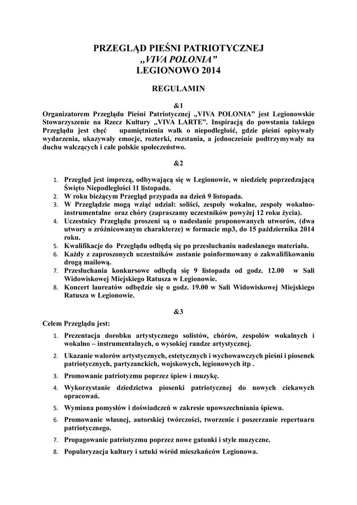 PRZEGLĄD PIEŚNI PATRIOTYCZNEJ ,,VIVA POLONIA” LEGIONOWO 2014 REGULAMIN &1 Organizatorem Przeglądu Pieśni Patriotycznej ,,VIVA POLONIA” jest Legionowskie Stowarzyszenie na Rzecz Kultury ,,VIVA LARTE”. Inspiracją do powstania takiego Przeglądu jest chęć upamiętnienia walk o niepodległość, gdzie pieśni opisywały wydarzenia, ukazywały emocje, rozterki, rozstania, a jednocześnie podtrzymywały na duchu walczących i całe polskie społeczeństwo. &2 1. Przegląd jest imprezą, odbywającą się w Legionowie, w niedzielę poprzedzającą Święto Niepodległości 11 listopada. 2. W roku bieżącym Przegląd przypada na dzień 9 listopada. 3. W Przeglądzie mogą wziąć udział: soliści, zespoły wokalne, zespoły wokalno4. 5. 6. 7. 8. instrumentalne oraz chóry (zapraszamy uczestników powyżej 12 roku życia). Uczestnicy Przeglądu proszeni są o nadesłanie proponowanych utworów, (dwa utwory o zróżnicowanym charakterze) w formacie mp3, do 15 października 2014 roku. Kwalifikacje do Przeglądu odbędą się po przesłuchaniu nadesłanego materiału. Każdy z zaproszonych uczestników zostanie poinformowany o zakwalifikowaniu drogą mailową. Przesłuchania konkursowe odbędą się 9 listopada od godz. 12.00 w Sali Widowiskowej Miejskiego Ratusza w Legionowie. Koncert laureatów odbędzie się o godz. 19.00 w Sali Widowiskowej Miejskiego Ratusza w Legionowie. &3 Celem Przeglądu jest: 1. Prezentacja dorobku artystycznego solistów, chórów, zespołów wokalnych i wokalno – instrumentalnych, o wysokiej randze artystycznej. 2. Ukazanie walorów artystycznych, estetycznych i wychowawczych pieśni i piosenek patriotycznych, partyzanckich, wojskowych, legionowych itp . 3. Promowanie patriotyzmu poprzez śpiew i muzykę. 4. Wykorzystanie dziedzictwa piosenki patriotycznej do nowych ciekawych opracowań. 5. Wymiana pomysłów i doświadczeń w zakresie upowszechniania śpiewu. 6. Promowanie własnej, autorskiej twórczości, tworzenie i poszerzanie repertuaru patriotycznego. 7. Propagowanie patriotyzmu poprzez nowe gatunki i style muzyczne. 8. Popularyzacja kultury i sztuki wśród mieszkańców Legionowa. &4 Główne kryteria oceny: 1. Dobór repertuaru- treść i charakter zgodny z założeniami REGULAMINU!!! 2. Dobór i spójność repertuaru oraz jego zgodność z możliwościami wykonawców. 3. Muzykalność i warunki głosowe wykonawców (emisja, dykcja, intonacja). 4. Interpretacja utworów, estetyka i ogólny wyraz artystyczny. &5 Nagrody: 1. Główną nagrodą jest grand prix za najlepsze wykonanie utworu patriotycznego w wysokości 4000 zł oraz pamiątkowa statuetka. 2. Druga nagroda- 2000 zł oraz pamiątkowa statuetka. 3. Trzecia nagroda- 1000 zł oraz pamiątkowa statuetka. 4. Wszyscy Uczestnicy Przeglądu otrzymają Dyplomy Uczestnictwa. 5. Przewidziana jest nagroda specjalna Miejskiego Ośrodka Kultury w Legionowie w wysokości 2000 zł dla chóru/zespołu oraz 500 zł dla solisty. 6. Nagrody przyznaje Jury Przeglądu powołane przez Organizatora. 7. Decyzje Jury są ostateczne i nieodwołalne. &6 Postanowienia końcowe: 1. Organizatorzy zapewniają obsługę akustyczną, nagłośnienie oraz instrument klawiszowy. 2. Zgłoszenie (Kartę Uczestnika oraz nagrane utwory konkursowe w mp3) należy przesyłać do dnia 15 października pocztą e-mailową. 3. Koszty przyjazdu i pobytu pokrywają Uczestnicy. 4. Uczestnicy Przeglądu zgłaszają się w dniu 9 listopada do godz. 11.30. W przypadku trudności z dotrzymaniem punktualności należy wcześniej uzgodnić to z Organizatorem. 5. Zgłoszenie udziału w Przeglądzie jest równoznaczne z akceptacją niniejszego regulaminu i wyrażeniem zgody dla Organizatora na nieodpłatne prawo do rejestracji prezentacji artystycznych dowolną techniką zapisu i możliwością wykorzystania zarejestrowanego materiału. 6. Uczestnictwo w Przeglądzie wymaga potwierdzenia przyjęcia zgłoszenia przez Organizatora. 7. Nadesłanie zgłoszenia jest równoznaczne z przyjęciem warunków niniejszego Regulaminu. 8. Sprawy nie ujęte w regulaminie rozstrzyga ostatecznie Organizator. ADRES: Legionowskie Stowarzyszenie na Rzecz Kultury ,,VIVA LARTE” 05-119 Legionowo ul. Piaskowa 4/20 [email protected] Koordynator Przeglądu: Dorota Bonisławska tel. 500 373 248