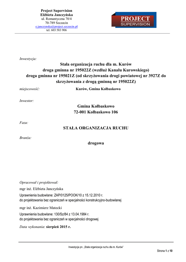 Project Supervision Elżbieta Janczyńska ul. Romantyczna 70/4 70-789 Szczecin [email protected] tel. 603 583 906 Inwestycja: Stała organizacja ruchu dla m. Kurów droga gminna nr 195022Z (wzdłuż Kanału Kurowskiego) droga gminna nr 195021Z (od skrzyżowania drogi powiatowej nr 3927Z do skrzyżowania z drogą gminną nr 195022Z) miejscowość: Kurów, Gmina Kołbaskowo Inwestor: Gmina Kołbaskowo 72-001 Kołbaskowo 106 Faza: STAŁA ORGANIZACJA RUCHU Branża: drogowa Opracował i projektował: mgr inż. Elżbieta Janczyńska Uprawnienia budowlane: ZAP/0125/POOK/10 z 15.12.2010 r. do projektowania bez ograniczeń w specjalności konstrukcyjno-budowlanej mgr inż. Kazimierz Matecki Uprawnienia budowlane: 130/Sz/84 z 13.04.1984 r. do projektowania bez ograniczeń w specjalności drogowej Data wykonania: sierpień 2015 r. Inwestycja pn. „Stała organizacja ruchu dla m. Kurów” Strona 1 z 10 SPIS TREŚCI I. PODSTAWA OPRACOWANIA ..................................................................................................... 3 II. PRZEDMIOT INWESTYCJI.......................................................................................................... 3 2.1 Przedmiot i zakres opracowania.................................................................................................. 3 2.2 Opis stanu istniejącego i projektowane zmiany .......................................................................... 3 2.2.1 Ograniczenie wjazdu pojazdów o masie rzeczywistej ponad 10 t ............................................... 4 2.2.2 Progi zwalniające ......................................................................................................................... 6 III. WARUNKI TECHNICZNE DLA PIONOWYCH I POZIOMYCH ZNAKÓW DROGOWYCH ........................................................................................................................................ 7 3.1 Kategorie znaków pionowych ...................................................................................................... 7 3.2 Wielkości znaków pionowych ...................................................................................................... 7 3.3 Materiał na znaki pionowe........................................................................................................... 8 3.3.1 Tarcza znaku ................................................................................................................................ 8 3.4 Konstrukcje wsporcze .................................................................................................................. 8 3.5 Progi zwalniające U-16 d ............................................................................................................. 9 Załączniki ............................................................................................................................................... 10 Załączniki graficzne ............................................................................................................................... 10 Strona 2 z 10 I. PODSTAWA OPRACOWANIA 1.1 Zlecenie Inwestora z 18.06.2015 r. 1.2 Wizja lokalna wraz z inwentaryzacją do celów projektowych; 1.3 Ustawa z dnia 20 czerwca 1997 roku Prawo o ruchu drogowym (tekst jednolity) (Dz. U. z 2012 r. poz. 1137); 1.4 Rozporządzenie Ministrów Infrastruktury oraz Spraw Wewnętrznych i Administracji z dnia 31 lipca 2002 roku w sprawie znaków i sygnałów drogowych. (Dz. U. Nr 170 poz. 1393 z dnia 12 października 2002 roku z późniejszymi zmianami). 1.5 Rozporządzenie Ministra Infrastruktury Ministra Transportu i Gospodarki Morskiej w sprawie szczegółowych warunków technicznych dla znaków i sygnałów drogowych oraz urządzeń bezpieczeństwa ruchu drogowego i warunków ich umieszczania na drogach (Dz. U. Nr 220, poz. 2181 z dnia 23 grudnia 2003 roku). II. PRZEDMIOT INWESTYCJI 2.1 Przedmiot i zakres opracowania Przedmiotem opracowania jest Projekt Stałej Organizacji Ruchu dla m. Kurów w zakresie: - wprowadzenia ograniczenia ruchu pojazdów o masie całkowitej powyżej 10T na drogę gminna nr 195021Z; - wprowadzenia urządzeń spowalniających ruch na drodze gminnej nr 195022 Z. 2.2 Opis stanu istniejącego i projektowane zmiany Rys. 1 Plan orientacyjny ze wskazaniem obszaru objętego opracowaniem Strona 3 z 10 W niniejszym opracowaniu objęto odcinek stanowiący I etap modernizacji drogi gminnej od m. Kurów do m. Siadło Dolne, w zakresie od skrzyżowania z drogą powiatową do m. Siadło Dolne (wzdłuż Kanału Kurowskiego) – odcinek o dł. 539 m. 2.2.1 Ograniczenie wjazdu pojazdów o masie rzeczywistej ponad 10 t W roku 2014 zakończono modernizację drogi gminnej nr 195022Z i 195021Z od skrzyżowania z drogą powiatową nr 3927Z w kierunku do m. Siadło Dolne wzdłuż Kanału Kurowskiego; oraz drogę wewnętrzną w m. Kurów. Przeprowadzona modernizacja polegała na wykonaniu nowej nawierzchni z kostki betonowej typu „PolBruk”, wykonaniu ciągów pieszych oraz odwodnieniu. Zmodernizowana droga wzdłuż Kanału Kurowskiego posiada jezdnię o szerokości 5.0 m oraz jednostronny chodnik o szerokości 1.5 m. Woda z rowu przydrożnego miała być odprowadzona do Kanału Kurowskiego przy pomocy istniejących przepustów pod drogą, które były wydłużone do wymiarów wynikających z szerokości jezdni i chodnika. Nadmienić należy, iż część przepustów została zasypana przez użytkowników i właścicieli przyległych nieruchomości, przez co ilość przepustów uległa zmniejszeniu, co doprowadziło do powolniejszego odprowadzenia wód opadowych do Kanału Kurowskiego. Biorąc pod uwagę występujące na tym terenie warunki gruntowo wodne stwierdzono, iż woda gruntowa występuje w postaci sączeń, podrzędnie jako woda o zwierciadle napiętym. W dolinie Odry występują strefy sączeń bardzo wydajnych. Poniżej załączono fotografie obrazujące napływ wód powierzchniowych do rowu przydrożnego. Fotograf
