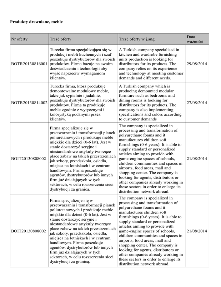 Produkty drewniane, meble Nr oferty Treść oferty Treść oferty w j.ang. Data ważności Turecka firma specjalizująca się w produkcji mebli kuchennych i szaf poszukuje dystrybutorów dla swoich BOTR20130816001 produktów. Firma bazuje na swoim doświadczeniu i technologii aby wyjść naprzeciw wymaganiom klientów. A Turkish company specialised in kitchen and wardrobe furnishing units production is looking for distributors for its products. The 29/08/2014 company relies on its experience and technology at meeting customer demands and different needs. Turecka firma, która produkuje demontowalne modułowe meble, takie jak sypialnie i jadalnie, poszukuje dystrybutorów dla swoich BOTR20130814002 produktów. Firma ta produkuje meble zgodnie z wytycznymi i kolorystyką podanymi przez klientów. A Turkish company which is producing demounted modular furniture such as bedrooms and dining rooms is looking for distributors for its products. The company is also implementing specifications and colors according to customer demands Firma specjalizuje się w przetwarzaniu i transformacji pianek poliuretanowych i produkuje meble miękkie dla dzieci (0-6 lat). Jest w stanie dostarczyć seryjne i niestandardowe artykuły tworzące place zabaw na takich przestrzeniach BOIT20130808002 jak szkoły, przedszkola, osiedla, miejsca na lotniskach i w centrum handlowym. Firma poszukuje agentów, dystrybutorów lub innych firm już działających w tych sektorach, w celu rozszerzenia sieci dystrybucji za granicą. The company is specialized in processing and transformation of polyurethane foams and it manufactures children soft furnishings (0-6 years). It is able to supply standard or personalized articles aiming to provide with game-engine spaces of schools, 21/08/2014 children communities and spaces in airports, food areas, mall and shopping center. The company is looking for agents, distributors or other companies already working in these sectors in order to enlarge its distribution network abroad. Firma specjalizuje się w przetwarzaniu i transformacji pianek poliuretanowych i produkuje meble miękkie dla dzieci (0-6 lat). Jest w stanie dostarczyć seryjne i niestandardowe artykuły tworzące place zabaw na takich przestrzeniach BOIT20130808002 jak szkoły, przedszkola, osiedla, miejsca na lotniskach i w centrum handlowym. Firma poszukuje agentów, dystrybutorów lub innych firm już działających w tych sektorach, w celu rozszerzenia sieci dystrybucji za granicą. The company is specialized in processing and transformation of polyurethane foams and it manufactures children soft furnishings (0-6 years). It is able to supply standard or personalized articles aiming to provide with game-engine spaces of schools, 21/08/2014 children communities and spaces in airports, food areas, mall and shopping center. The company is looking for agents, distributors or other companies already working in these sectors in order to enlarge its distribution network abroad. 27/08/2014 Litewska firma, specjalizująca się w produkcji mebli (kuchennych, do łazienek, szaf, systemów drzwi przesuwnych i innych), poszukuje pośredników handlowych (agentów, przedstawicieli, dystrybutorów). BOLT20130806003 Firma jest dobrze wyposażona, oferuje produkty wysokiej jakości w dużych ilościach. Firma poszukuje partnerów zagranicznych celem sprzedaży mebli (mogą to być sklepy meblowe, stolarnie oraz inni producenci mebli). A Lithuanian company, specialised in furniture manufacturing (kitchens, bathrooms, wardrobes & sliding doors systems and other) is looking for trade intermediaries (agents, representatives, distributors). The company has good equipments, can 19/08/2014 offer good quality products in big quantities. The company is looking for the partners in foreign countries to sell furniture (can be furniture shops, builders, other furniture manufacturers). Litewska firma, produkująca meble w systemach panelowych i meble tapicerowane, poszukuje partnerów celem przedstawicielstwa i sprzedaży jej produktów na wybranych rynkach BOLT20130801001 UE. Firma jest również zainteresowana otrzymaniem ofert wzajemnej produkcji i podwykonawstwa elementów meblowych oraz usługi malowania paneli. Lithuanian company producing panel and upholstered furniture is looking for partners to represent and sell its products in requested EU markets. The company is also 19/08/2014 interested in getting offers for reciprocal production and subcontracting of furniture elements and panel painting service.