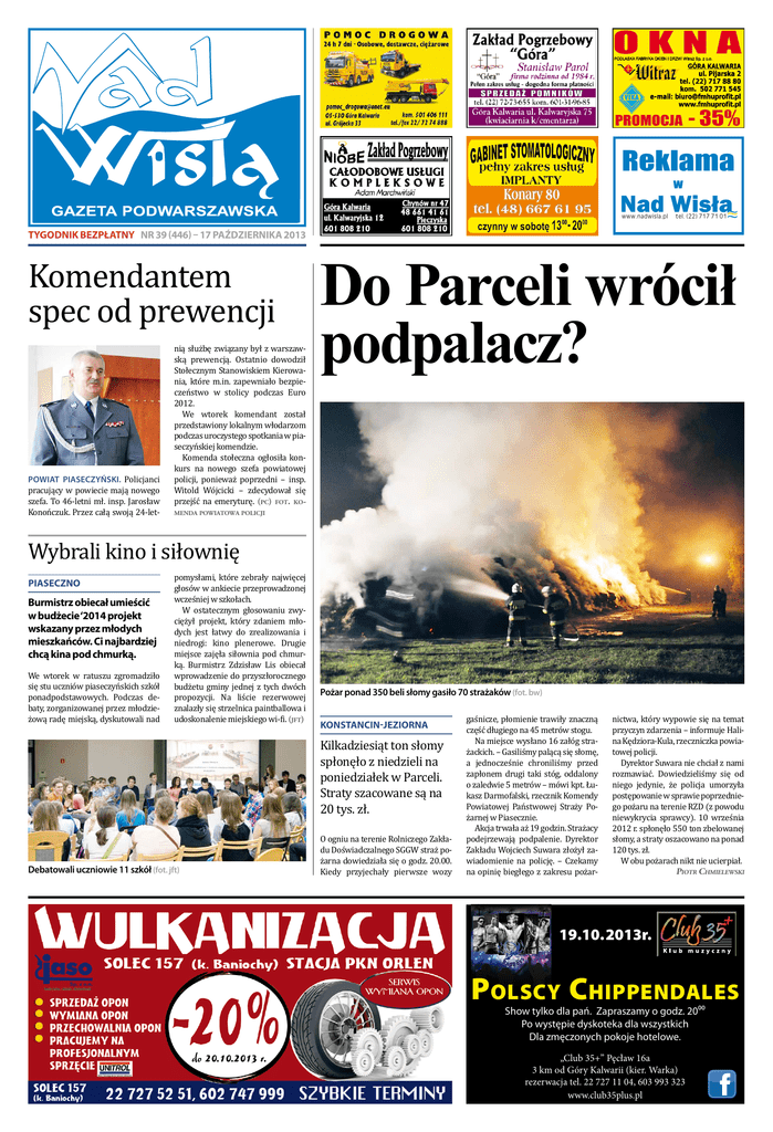 Reklama w www.nadwisla.pl tel. (22) 717 71 01 tygodnik BEZPŁATNy NR 39 (446) – 17 października 2013 Komendantem spec od prewencji Powiat piaseczyński. Policjanci pracujący w powiecie mają nowego szefa. To 46-letni mł. insp. Jarosław Konończuk. Przez całą swoją 24-let- nią służbę związany był z warszawską prewencją. Ostatnio dowodził Stołecznym Stanowiskiem Kierowania, które m.in. zapewniało bezpieczeństwo w stolicy podczas Euro 2012. We wtorek komendant został przedstawiony lokalnym włodarzom podczas uroczystego spotkania w piaseczyńskiej komendzie. Komenda stołeczna ogłosiła konkurs na nowego szefa powiatowej policji, ponieważ poprzedni – insp. Witold Wójcicki – zdecydował się przejść na emeryturę. (pc) fot. ko- Do Parceli wrócił podpalacz? menda powiatowa policji Wybrali kino i siłownię piaseczno Burmistrz obiecał umieścić w budżecie ‘2014 projekt wskazany przez młodych mieszkańców. Ci najbardziej chcą kina pod chmurką. We wtorek w ratuszu zgromadziło się stu uczniów piaseczyńskich szkół ponadpodstawowych. Podczas debaty, zorganizowanej przez młodzieżową radę miejską, dyskutowali nad pomysłami, które zebrały najwięcej głosów w ankiecie przeprowadzonej wcześniej w szkołach. W ostatecznym głosowaniu zwyciężył projekt, który zdaniem młodych jest łatwy do zrealizowania i niedrogi: kino plenerowe. Drugie miejsce zajęła siłownia pod chmurką. Burmistrz Zdzisław Lis obiecał wprowadzenie do przyszłorocznego budżetu gminy jednej z tych dwóch propozycji. Na liście rezerwowej znalazły się strzelnica paintballowa i udoskonalenie miejskiego wi-fi. (jft) Debatowali uczniowie 11 szkół (fot. jft) Pożar ponad 350 beli słomy gasiło 70 strażaków (fot. bw) konstancin-jeziorna Kilkadziesiąt ton słomy spłonęło z niedzieli na poniedziałek w Parceli. Straty szacowane są na 20 tys. zł. O ogniu na terenie Rolniczego Zakładu Doświadczalnego SGGW straż pożarna dowiedziała się o godz. 20.00. Kiedy przyjechały pierwsze wozy gaśnicze, płomienie trawiły znaczną część długiego na 45 metrów stogu. Na miejsce wysłano 16 załóg strażackich. – Gasiliśmy palącą się słomę, a jednocześnie chroniliśmy przed zapłonem drugi taki stóg, oddalony o zaledwie 5 metrów – mówi kpt. Łukasz Darmofalski, rzecznik Komendy Powiatowej Państwowej Straży Pożarnej w Piasecznie. Akcja trwała aż 19 godzin. Strażacy podejrzewają podpalenie. Dyrektor Zakładu Wojciech Suwara złożył zawiadomienie na policję. – Czekamy na opinię biegłego z zakresu pożar- nictwa, który wypowie się na temat przyczyn zdarzenia – informuje Halina Kędziora-Kula, rzeczniczka powiatowej policji. Dyrektor Suwara nie chciał z nami rozmawiać. Dowiedzieliśmy się od niego jedynie, że policja umorzyła postępowanie w sprawie poprzedniego pożaru na terenie RZD (z powodu niewykrycia sprawcy). 10 września 2012 r. spłonęło 550 ton zbelowanej słomy, a straty oszacowano na ponad 120 tys. zł. W obu pożarach nikt nie ucierpiał. Piotr Chmielewski 19.10.2013r. POLSCY CHIPPENDALES Show tylko dla pań. Zapraszamy o godz. 2000 Po występie dyskoteka dla wszystkich Dla zmęczonych pokoje hotelowe. „Club 35+” Pęcław 16a 3 km od Góry Kalwarii (kier. Warka) rezerwacja tel. 22 727 11 04, 603 993 323 www.club35plus.pl 2 ~ NadWisłą ~ wydarzenia Rondo „Inki”? Wnuk słynnego poety, przyjaciel króla góra kalwaria W kościele parafialnym w Górze Kalwarii odsłonięto w sobotę tablicę z okazji 330. rocznicy urodzin Franciszka Bielińskiego (1683 – 1766). Danuta Siedzikówna „Inka”. W wieku 17 lat rozstrzelana wyrokiem sądu Polski Ludowej konstancin-jeziorna Niech rondo na Królewskiej Górze nosi imię niezłomnej sanitariuszki AK – proponuje mieszkaniec. – Ta dziewczyna prezentowała wartości nieprzeciętne. Należy je propagować – podkreśla 57-letni Andrzej Zambrowicz, pomysłodawca uczczenia „Inki”. Danuta Siedzikówna od 1943 roku służyła w zbrojnym podziemiu niepodległościowym: w Armii Krajowej na Białostocczyźnie. Wstąpiła do niej jako 15-latka. Po wojnie należała do legendarnej 5. Wileńskiej Brygady AK majora Zygmunta Szendzielarza „Łupaszki”. W lipcu 1946 r. dowódca szwadronu „Inki” wysłał ją do Gdańska po leki i opatrunki. Tam wpadła w ręce funkcjonariuszy komunistycznej bezpieki i trafiła do więzienia. Podczas „śledztwa” sanitariuszkę bito i poniżano, ale nie wyjawiła Skatepark na lato Konstancin-Jeziorna. Urząd gminy przystąpił do wyłaniania firmy, która zbuduje w Konstancinie-Jeziornie kompleks sportowo-rekreacyjny pod gołym niebem. Przy ul. Bielaw- Na konstancińskim skrzyżowaniu droga na Piaseczno łączy się z drogą na Baniochę (fot. rk) żadnej tajemnicy. Została skazana na śmierć. Nie podpisała prośby do prezydenta Polski Ludowej Bolesława Bieruta o ułaskawienie (zrobił to jej obrońca z urzędu, ale Bierut nie skorzystał z prawa łaski). „Jest mi smutno, że muszę umierać. Powiedzcie mojej babci, że zachowałam się jak trzeba” – napisała dziewczyna w pożegnalnym grypsie do przyjaciółek. Tuż przed tym, jak żołnierze Korpusu Bezpieczeństwa Wewnętrznego wykonali egzekucję, „Inka” zawołała: „Niech żyje Polska!”. Nie wiadomo, gdzie spoczywa. Symboliczny grób znajduje się w Gdańsku. Danutę Siedzikównę upamiętniają też pomniki: w podlaskiej Narewce (tu mieszkała), w Krakowie i w Sopocie; w tym ostatnim mieście jest także park jej imienia. Została patronką m.in. dwóch szkół. Opowiada o niej spektakl Teatru Telewizji, powstały również piosenki. Prezydent Lech Kaczyński odznaczył partyzantkę Krzyżem Komandorskim Orderu Odrodzenia Polski. Dlaczego imię „Inki” miałoby nosić akurat rondo na Królewskiej Górze? Bo ta dzielnica była w stalinizmie zamkniętym, strzeżonym przez KBW osiedlem willi, w których mieszkali czołowi komunistyczni dygnitarze – na czele z 
