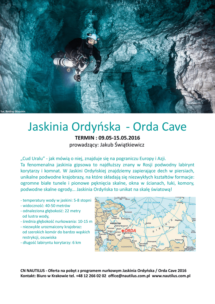 Jaskinia Ordyńska - Orda Cave TERMIN : 09.05-15.05.2016 prowadzący: Jakub Świątkiewicz „Cud Uralu” - jak mówią o niej, znajduje się na pograniczu Europy i Azji. Ta fenomenalna jaskinia gipsowa to najdłuższy znany w Rosji podwodny labirynt korytarzy i komnat. W Jaskini Ordyńskiej znajdziemy zapierające dech w piersiach, unikalne podwodne krajobrazy, na które składają się niezwykłych kształtów formacje: ogromne białe tunele i pionowe pęknięcia skalne, okna w ścianach, łuki, komory, podwodne skalne ogrody... Jaskinia Ordyńska to unikat na skalę światową! - temperatury wody w jaskini: 5-8 stopni - widoczność: 40-50 metrów - odnaleziona głębokość: 22 metry od lustra wody, - średnia głębokość nurkowania: 10-15 m - niezwykle urozmaicony krajobraz: od szerokich komór do bardzo wąskich restrykcji, osuwiska - długość labiryntu korytarzy: 6 km CN NAUTILUS - Oferta na pobyt z programem nurkowym Jaskinia Ordyńska / Orda Cave 2016 Kontakt: Biuro w Krakowie tel. +48 12 266 02 02 [email protected] www.nautilus.com.pl Jaskinia Ordyńska – to najdłuższy znany w Rosji Logistyka nurkowań - obecnie dzięki dobrej podwodny labirynt korytarzy i komnat. O jego fenomenie świadczy fakt, że jest to jaskinia gipsowa. Co się z tym wiąże – wnętrze nie przypomina znanych nam typowych jaskiń ze zjawiskami krasowymi w postaci stalaktytów, stalagmitów. Temperatura wody to 5 stopni Celsjusza w okresie letnim oraz 7-8 stopni Celsjusza zimą. Pierwsi nurkowie pojawili się w Jaskini Ordyńskiej w roku 2000. Zakwaterowanie - Drewniane domki: przedsionek, 2 pokoje dwuosobowe, ogrzewane, z pościelą (zabrać ze sobą swoje cienkie śpiwory) z widokiem na brzezinę. infrastrukturze jest to popularne miejsce odwiedzane przez nurków z całego świata. Jaskinia Ordyńska stała się dla nurków jaskiniowych obowiązkowym punktem na światowej mapie podwodnych systemów jaskiniowych. Baza nurkowa usytuowana jest nad jaskinią, do której prowadzą schody i drabinki z poręczami. Różnica poziomów wynosi około 50 merów. Droga jest wygodna a jaskinia oświetlona. W okresie opadów droga jest codziennie czyszczona . Na dole znajduje się oświetlona platforma dla 10 nurków. W bazie na górze nurkowie przebierają się w ocieplacze i kombinezony, zabierają w workach jaskiniowych drobny sprzęt na dół na platformę. Ciężki sprzęt (twiny, balast, stage) znoszony jest przez tragarzy i oczekuje na grupę na dole. Małe oczko wodne jest głównym wejściem do podwodnego labiryntu. Poziom wody przy wejściu równa się poziomowi wody w pobliskiej rzece Kungur. Obecnie, nawet do najdalszych zakątków jaskini, pociągnięte zostały poręczówki. Sufit jaskini w części zalanej wodą znajduje się na głębokości 6 metrów. Średnia głębokość dna to 15-18 metrów, osiągająca swoje maksimum na 22 metrach. Widoczność dochodzi do 50-70 metrów! W kilku miejscach Jaskini Ordyńskiej znajdują się suche komnaty,w których można swobodnie się wynurzyć. CN NAUTILUS - Oferta na pobyt z programem nurkowym Jaskinia Ordyńska / Orda Cave 2016 Kontakt: Biuro w Krakowie tel. +48 12 266 02 02 [email protected] www.nautilus.com.pl CENY: 2 osoby 4 osoby 6 osób 8 osób 10 osób Nurek 1150€ /osoba 850€ /osoba 720€ /osoba 665€ /osoba 595€ /osoba Osoba towarzysząca 555€ /osoba 495€ /osoba 455€ /osoba 445€ /osoba 445€ /osoba Cena obejmuje : - 5 noclegów w domkach w pokojach 2-osobowych - 5 dni pełne wyżywienie - transfer lotnisko- baza- lotnisko - opieka polskiego instruktora - ubezpieczenie podróżne - wypożyczenie butli SM lub twinsetów - napełnienie butli powietrzem 2x dziennie - 10 nurkowań w jaskini - usługi tragarzy - 1x sauna- rosyjska bania Cena nie obejmuje : - przelotu ( około 2000 – 3000 PLN w zależności od daty zakupu biletów lotniczych) - ubezpieczenia nurkowego około 100 PLN - wizy rosyjskiej- około 330 PLN - ewentualnego nadbagażu- około 220 PLN w jedną stronę - wyżywienia innego, niż w ofercie - ewentualnych napiwków dla załogi - opcjonalnie: wycieczka do lodowej Jaskini Kungurskiej, biletu wstępu- 20 euro/osoba ROGRAM: DZIEŃ 1 - Spotkanie na lotnisku Okęcie, wylot do Rosji. DZIEŃ 2 - Przylot w godzinach rannych, transfer do bazy (około 150 km), śniadanie, zakwaterowanie, odpoczynek po podróży, odprawa, sprawdzenie sprzętu. 1 lub 2 nurkowania. DZIEŃ 3 - 2 nurkowania DZIEŃ 4 - 2 – 3 nurkowania DZIEŃ 5 - 2 nurkowania, opcjonalnie: wycieczka do lodowej Jaskini Kungurskiej DZIEŃ 6 - 2 nurkowania DZIEŃ 7 - Transfer na lotnisko. Wylot do Polski. Wymagania: - odpowiednie uprawnienia do nurkowania jaskiniowego - kompletny sprzęt do nurkowań jaskiniowych w zimnej wodzie - ubezpieczenie nurkowe - paszport z datą ważności minimum 6 miesięcy od planowanej daty powrotu. CN NAUTILUS - Oferta na pobyt z programem nurkowym Jaskinia Ordyńska / Orda Cave 2016 Kontakt: Biuro w Krakowie tel. +48 12 266 02 02 [email protected] www.nautilus.com.pl CN NAUTILUS - Oferta na pobyt z programem nurkowym Jaskinia Ordyńska / Orda Cave 2016 Kontakt: Biuro w Krakowie tel. +48 12 266 02 02 [email protected] www.nautilus.com.pl