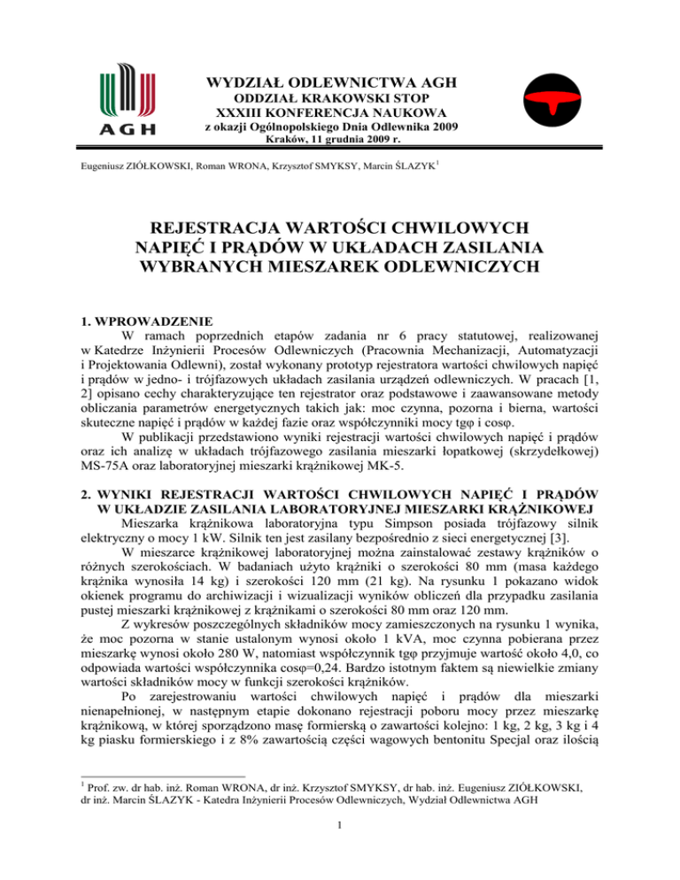 WYDZIAŁ ODLEWNICTWA AGH ODDZIAŁ KRAKOWSKI STOP XXXIII KONFERENCJA NAUKOWA z okazji Ogólnopolskiego Dnia Odlewnika 2009 Kraków, 11 grudnia 2009 r. Eugeniusz ZIÓŁKOWSKI, Roman WRONA, Krzysztof SMYKSY, Marcin ŚLAZYK1 REJESTRACJA WARTOŚCI CHWILOWYCH NAPIĘĆ I PRĄDÓW W UKŁADACH ZASILANIA WYBRANYCH MIESZAREK ODLEWNICZYCH 1. WPROWADZENIE W ramach poprzednich etapów zadania nr 6 pracy statutowej, realizowanej w Katedrze Inżynierii Procesów Odlewniczych (Pracownia Mechanizacji, Automatyzacji i Projektowania Odlewni), został wykonany prototyp rejestratora wartości chwilowych napięć i prądów w jedno- i trójfazowych układach zasilania urządzeń odlewniczych. W pracach [1, 2] opisano cechy charakteryzujące ten rejestrator oraz podstawowe i zaawansowane metody obliczania parametrów energetycznych takich jak: moc czynna, pozorna i bierna, wartości skuteczne napięć i prądów w każdej fazie oraz współczynniki mocy tgφ i cosφ. W publikacji przedstawiono wyniki rejestracji wartości chwilowych napięć i prądów oraz ich analizę w układach trójfazowego zasilania mieszarki łopatkowej (skrzydełkowej) MS-75A oraz laboratoryjnej mieszarki krążnikowej MK-5. 2. WYNIKI REJESTRACJI WARTOŚCI CHWILOWYCH NAPIĘĆ I PRĄDÓW W UKŁADZIE ZASILANIA LABORATORYJNEJ MIESZARKI KRĄŻNIKOWEJ Mieszarka krążnikowa laboratoryjna typu Simpson posiada trójfazowy silnik elektryczny o mocy 1 kW. Silnik ten jest zasilany bezpośrednio z sieci energetycznej [3]. W mieszarce krążnikowej laboratoryjnej można zainstalować zestawy krążników o różnych szerokościach. W badaniach użyto krążniki o szerokości 80 mm (masa każdego krążnika wynosiła 14 kg) i szerokości 120 mm (21 kg). Na rysunku 1 pokazano widok okienek programu do archiwizacji i wizualizacji wyników obliczeń dla przypadku zasilania pustej mieszarki krążnikowej z krążnikami o szerokości 80 mm oraz 120 mm. Z wykresów poszczególnych składników mocy zamieszczonych na rysunku 1 wynika, że moc pozorna w stanie ustalonym wynosi około 1 kVA, moc czynna pobierana przez mieszarkę wynosi około 280 W, natomiast współczynnik tgφ przyjmuje wartość około 4,0, co odpowiada wartości współczynnika cosφ=0,24. Bardzo istotnym faktem są niewielkie zmiany wartości składników mocy w funkcji szerokości krążników. Po zarejestrowaniu wartości chwilowych napięć i prądów dla mieszarki nienapełnionej, w następnym etapie dokonano rejestracji poboru mocy przez mieszarkę krążnikową, w której sporządzono masę formierską o zawartości kolejno: 1 kg, 2 kg, 3 kg i 4 kg piasku formierskiego i z 8% zawartością części wagowych bentonitu Specjal oraz ilością 1 Prof. zw. dr hab. inż. Roman WRONA, dr inż. Krzysztof SMYKSY, dr hab. inż. Eugeniusz ZIÓŁKOWSKI, dr inż. Marcin ŚLAZYK - Katedra Inżynierii Procesów Odlewniczych, Wydział Odlewnictwa AGH 1 wody równą 3% części wagowych. Na rysunku 2 pokazano okienka programu rejestrującego dla tych przypadków. a) b) Rys. 1. Widok okienek programu z wynikami obliczeń składników mocy i współczynnika tgφ w przypadku biegu jałowego mieszarki krążnikowej: a – krążniki o szerokości 80 mm, b – krążniki o szerokości 120 mm. Dla wszystkich rozważanych przypadków zapełnienia mieszarki krążnikowej, można zauważyć niewielką zmianę wartości pobranej mocy czynnej, a przez to także wartości współczynnika mocy tgφ. Na rysunku 3 przedstawiono wykres zależności współczynnika tgφ w funkcji ilości sporządzanej masy formierskiej dla badanej mieszarki krążnikowej. Wartość współczynnika tgφ zmienia się w zakresie od 3,3 do 3,9, co oznacza zmianę wartości cosφ od 0,25 do 0,29. 3. WYBRANE PRZYKŁADY REJESTRACJI WARTOŚCI CHWILOWYCH NAPIĘĆ I PRĄDÓW W UKŁADZIE ZASILANIA MIESZARKI ŁOPATKOWEJ Funkcjonalność rejestratora wartości chwilowych napięć i prądów sprawdzono także wykonując serię pomiarów i analiz w układzie zasilania mieszarki łopatkowej MS-075A. Mieszarkę tą zasilano wprost z trójfazowej sieci energetycznej oraz za pośrednictwem falownika, w którym zmieniano wartość częstotliwości napięcia zasilającego. Wybrane wyniki pomiarów wartości chwilowych napięć i prądów dla biegu jałowego mieszarki zasilanej z sieci energetycznej przedstawiono na rysunku 4. 2 a) b) c) d) Rys. 2. Widok okienek programu z wynikami obliczeń składników mocy i współczynnika tgφ dla mieszarki krążnikowej z krążnikami o szerokości 80 mm i wykorbieniem 20 mm: a – 1 kg masy formierskiej, b – 2 kg masy formierskiej, c – 3 kg masy formierskiej, d – 4 kg masy formierskiej 4.0 3.8 3.6 współczynnik tgφ 3.4 3.2 3.0 2.8 2.6 2.4 2.2 2.0 0.0 1.0 2.0 3.0 4.0 Masa załadunku, kg Rys. 3. Wykres zależności współczynnika mocy tgφ w funkcji ilości sporządzanej masy formierskiej w badanej mieszarce krążnikowej Z analizy informacji zawartych na rysunku 4 wynika, że falownik istotnie zmienia kształt napięć zasilających, jednocześnie zachowując w przybliżeniu sinusoidalny kształt prądów. Zmiana częstotliwości napięcia zasilającego miała wpływ na prędkość obrotową mieszadła, co zilustrowano na rysunku 5. Można tutaj zauważyć liniową charakterystykę zmiany wartości prędkości obrotowej mieszadła w funkcji zmiany częstotliwości napięcia zasilającego. 3 a) b) c) d) e) Rys. 4. Przykładowe widoki okienek z przebiegami wartości chwilowych napięć, prądów i mocy chwilowej w układzie zasilania nienapełnionej mieszarki łopatkowej i zasilanie z falownika: a – 30 Hz, b – 40 Hz, c – 50 Hz, d – zasilanie z sieci energetycznej 50 Hz, e zasilanie z falownika – 60 Hz 4 Prędkość obrotowa mieszadła, obr/min 60 50 40 30 20 10 0 30 40 50 60 Rys. 5. Wykres zmian prędkości obrotowej mieszadła w funkcji zmiany częstotliwości napięcia zasilającego dla mieszarki łopatkowej MS-075A Częstotliwość napięcia zasilającego, Hz Na rysunku 6 pokazano wykresy zmia