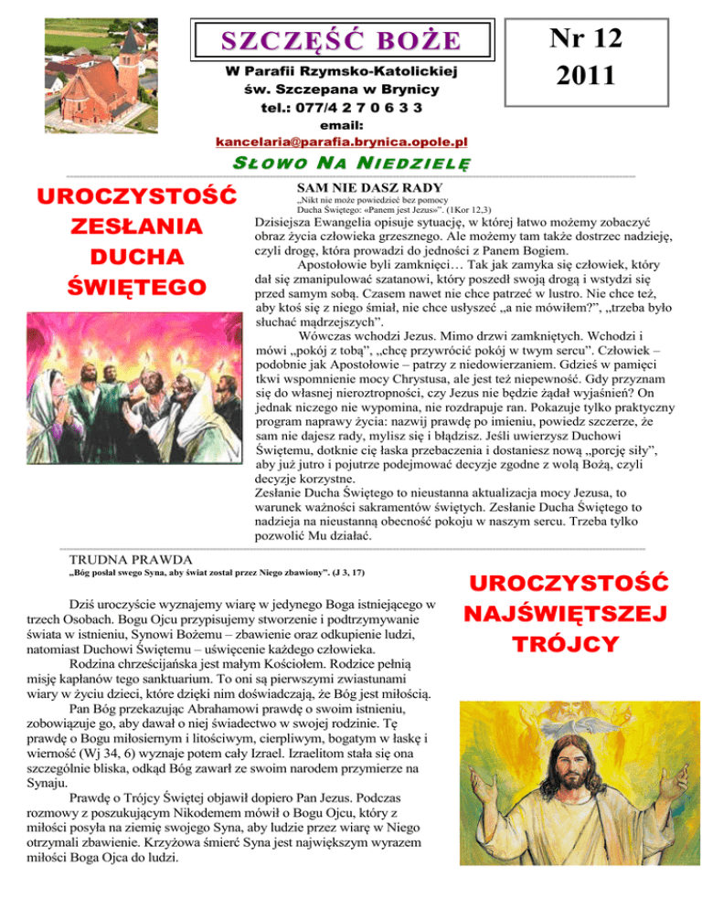 Nr 12 2011 SZCZĘŚĆ BOŻE W Parafii Rzymsko-Katolickiej św. Szczepana w Brynicy tel.: 077/4 2 7 0 6 3 3 email: [email protected] SŁOWO NA NIEDZIELĘ =========================================================================================================================================================================== UROCZYSTOŚĆ ZESŁANIA DUCHA ŚWIĘTEGO SAM NIE DASZ RADY „Nikt nie może powiedzieć bez pomocy Ducha Świętego: «Panem jest Jezus»”. (1Kor 12,3) Dzisiejsza Ewangelia opisuje sytuację, w której łatwo możemy zobaczyć obraz życia człowieka grzesznego. Ale możemy tam także dostrzec nadzieję, czyli drogę, która prowadzi do jedności z Panem Bogiem. Apostołowie byli zamknięci… Tak jak zamyka się człowiek, który dał się zmanipulować szatanowi, który poszedł swoją drogą i wstydzi się przed samym sobą. Czasem nawet nie chce patrzeć w lustro. Nie chce też, aby ktoś się z niego śmiał, nie chce usłyszeć „a nie mówiłem?”, „trzeba było słuchać mądrzejszych”. Wówczas wchodzi Jezus. Mimo drzwi zamkniętych. Wchodzi i mówi „pokój z tobą”, „chcę przywrócić pokój w twym sercu”. Człowiek – podobnie jak Apostołowie – patrzy z niedowierzaniem. Gdzieś w pamięci tkwi wspomnienie mocy Chrystusa, ale jest też niepewność. Gdy przyznam się do własnej nieroztropności, czy Jezus nie będzie żądał wyjaśnień? On jednak niczego nie wypomina, nie rozdrapuje ran. Pokazuje tylko praktyczny program naprawy życia: nazwij prawdę po imieniu, powiedz szczerze, że sam nie dajesz rady, mylisz się i błądzisz. Jeśli uwierzysz Duchowi Świętemu, dotknie cię łaska przebaczenia i dostaniesz nową „porcję siły”, aby już jutro i pojutrze podejmować decyzje zgodne z wolą Bożą, czyli decyzje korzystne. Zesłanie Ducha Świętego to nieustanna aktualizacja mocy Jezusa, to warunek ważności sakramentów świętych. Zesłanie Ducha Świętego to nadzieja na nieustanną obecność pokoju w naszym sercu. Trzeba tylko pozwolić Mu działać. ================================================================================================================================================================================ TRUDNA PRAWDA „Bóg posłał swego Syna, aby świat został przez Niego zbawiony”. (J 3, 17) Dziś uroczyście wyznajemy wiarę w jedynego Boga istniejącego w trzech Osobach. Bogu Ojcu przypisujemy stworzenie i podtrzymywanie świata w istnieniu, Synowi Bożemu – zbawienie oraz odkupienie ludzi, natomiast Duchowi Świętemu – uświęcenie każdego człowieka. Rodzina chrześcijańska jest małym Kościołem. Rodzice pełnią misję kapłanów tego sanktuarium. To oni są pierwszymi zwiastunami wiary w życiu dzieci, które dzięki nim doświadczają, że Bóg jest miłością. Pan Bóg przekazując Abrahamowi prawdę o swoim istnieniu, zobowiązuje go, aby dawał o niej świadectwo w swojej rodzinie. Tę prawdę o Bogu miłosiernym i litościwym, cierpliwym, bogatym w łaskę i wierność (Wj 34, 6) wyznaje potem cały Izrael. Izraelitom stała się ona szczególnie bliska, odkąd Bóg zawarł ze swoim narodem przymierze na Synaju. Prawdę o Trójcy Świętej objawił dopiero Pan Jezus. Podczas rozmowy z poszukującym Nikodemem mówił o Bogu Ojcu, który z miłości posyła na ziemię swojego Syna, aby ludzie przez wiarę w Niego otrzymali zbawienie. Krzyżowa śmierć Syna jest największym wyrazem miłości Boga Ojca do ludzi. UROCZYSTOŚĆ NAJŚWIĘTSZEJ TRÓJCY Historia Bożego Ciała W Kościele katolickim dziesięć dni po Zesłaniu Ducha Świętego obchodzona jest liturgiczna uroczystość ku czci Najświętszego Sakramentu, w Polsce nazywana świętem Bożego Ciała. Inspiracją do jej ustanowienia były między innymi objawienia, jakie miała siostra z konwentu augustianek w miejscowości Mont Cornillon, niedaleko miasta Liege - bł. Julianna (1193-1258).Święto to po raz pierwszy wprowadził w 1246 r. dla diecezji Liege biskup Robert, a w kilka lat później zatwierdził je kardynał Hugo z Saint-Cher. Wkrótce w 1263 r. miał miejsce niezwykły cud .W Bolsenie niedaleko Rzymu podczas przełamania Hostii zaczęła z niej kapać krew. Był to znak, który otrzymał kapłan odprawiający Mszę świętą, gdy zwątpił, że pod postacią opłatka kryje się Ciało Chrystusa. Poruszony tym zdarzeniem papież Urban IV wprowadził w 1264 r. święto Bożego Ciała w Rzymie, a o opracowanie tekstów liturgicznych zwrócił się do św. Tomasza z Akwinu. Jak czytamy w papieskiej bulli, uroczystość miała być przebłaganiem i zadośćuczynieniem za znieważanie Najświętszego Sakramentu i odstępstwa od wiary świętej oraz miała upamiętniać ustanowienie Eucharystii. Poważny nastrój Wielkiego Tygodnia nie pozwalał na uroczyste obchody tego radosnego wydarzenia, wyznaczono więc inny termin uroczystości. Ogłoszeniu bulli przeszkodziła śmierć jej autora; święto Bożego Ciała wprowadził ostatecznie papież Jan XXII w 1. połowie XIV wieku. W Polsce obchody Bożego Ciała zainicjował w 1320 r. w diecezji krakowskiej biskup Nanker. Tradycja organizowania w tym dniu procesji jest późniejsza niż samo święto. Zapoczątkowano ją w latach 1265-1275 w Niemczech, w Kolonii, a już w XV w. procesje urządzano w całej ówczesnej Europie, w tym także w Polsce. Na ich trasie przygotowywano cztery ołtarze, przy których odczytywano fragmenty czterech Ewangelii i udzielano wiernym błogosławieństwa Najświętszym Sakramentem.Od samego początku uroczystościom tym towarzyszyły widowiska religijne, najczęściej sceny związane z historią zbawienia, jak np. upadek pierwszych rodziców, Ostatnia Wieczerza, Męka Pańska itp. Z upływem czasu zaczęto je wzbogacać o treści świeckie, nie zawsze licujące z powagą uroczystości. Z tego powodu już pod koniec XIV w. wiele synodów biskupich wydało zakaz ich wystawiania. Renesans widowisk, mających teraz formę dialogów i d