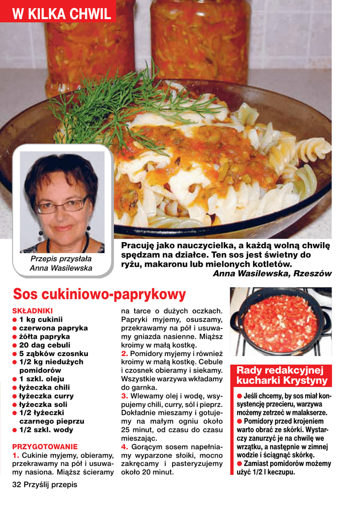 W KILKA CHWIL Przepis przysłała Anna Wasilewska Pracuję jako nauczycielka, a każdą wolną chwilę spędzam na działce. Ten sos jest świetny do ryżu, makaronu lub mielonych kotletów. Anna Wasilewska, Rzeszów Sos cukiniowo-paprykowy SKŁADNIKI ● 1 kg cukinii ● czerwona papryka ● żółta papryka ● 20 dag cebuli ● 5 ząbków czosnku ● 1/2 kg niedużych pomidorów ● 1 szkl. oleju ● łyżeczka chili ● łyżeczka curry ● łyżeczka soli ● 1/2 łyżeczki czarnego pieprzu ● 1/2 szkl. wody PRZYGOTOWANIE 1. Cukinie myjemy, obieramy, przekrawamy na pół i usuwamy nasiona. Miąższ ścieramy 32 Przyślij przepis na tarce o dużych oczkach. Papryki myjemy, osuszamy, przekrawamy na pół i usuwamy gniazda nasienne. Miąższ kroimy w małą kostkę. 2. Pomidory myjemy i również kroimy w małą kostkę. Cebule i czosnek obieramy i siekamy. Wszystkie warzywa wkładamy do garnka. 3. Wlewamy olej i wodę, wsypujemy chili, curry, sól i pieprz. Dokładnie mieszamy i gotujemy na małym ogniu około 25 minut, od czasu do czasu mieszając. 4. Gorącym sosem napełniamy wyparzone słoiki, mocno zakręcamy i pasteryzujemy około 20 minut. Rady redakcyjnej kucharki Krystyny ● Jeśli chcemy, by sos miał konsystencję przecieru, warzywa możemy zetrzeć w malakserze. ● Pomidory przed krojeniem warto obrać ze skórki. Wystarczy zanurzyć je na chwilę we wrzątku, a następnie w zimnej wodzie i ściągnąć skórkę. ● Zamiast pomidorów możemy użyć 1/2 l keczupu.