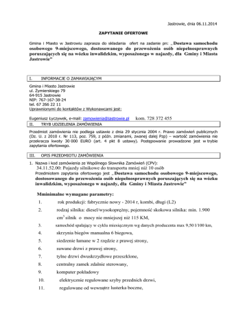 Jastrowie, dnia 06.11.2014 ZAPYTANIE OFERTOWE Gmina i Miasto w Jastrowiu zaprasza do składania ofert na zadanie pn: „Dostawa samochodu osobowego 9-miejscowego, dostosowanego do przewożenia osób niepełnosprawnych poruszających się na wózku inwalidzkim, wyposażonego w najazdy, dla Gminy i Miasta Jastrowie” I. INFORMACJE O ZAMAWIAJĄCYM Gmina i Miasto Jastrowie ul. Żymierskiego 79 64-915 Jastrowie NIP: 767-167-38-24 tel. 67 266 22 11 Uprawnionymi do kontaktów z Wykonawcami jest: Eugeniusz Łyczywek, e-mail: [email protected] II. kom. 728 372 455 TRYB UDZIELENIA ZAMÓWIENIA Przedmiot zamówienia nie podlega ustawie z dnia 29 stycznia 2004 r. Prawo zamówień publicznych (Dz. U. z 2010 r. Nr 113, poz. 759, z późn. zmianami, zwanej dalej Pzp) – wartość zamówienia nie przekracza kwoty 30 000 EURO (art. 4 pkt 8 ustawy). Postępowanie prowadzone jest w trybie zapytania ofertowego. III. OPIS PRZEDMIOTU ZAMÓWIENIA 1. Nazwa i kod zamówienia ze Wspólnego Słownika Zamówień (CPV): 34.11.52.00: Pojazdy silnikowe do transportu mniej niż 10 osób „Dostawa samochodu osobowego 9-miejscowego, dostosowanego do przewożenia osób niepełnosprawnych poruszających się na wózku inwalidzkim, wyposażonego w najazdy, dla Gminy i Miasta Jastrowie” Przedmiotem zapytania ofertowego jest Mminimalne wymagane parametry: 1. rok produkcji: fabrycznie nowy - 2014 r, kombi, długi (L2) 2. rodzaj silnika: diesel/wysokoprężny, pojemność skokowa silnika: min. 1.900 cm3 silnik o mocy nie mniejszej niż 115 KM, 3. samochód spalający w cyklu miesięcznym wg danych producenta max 9,50 l/100 km, 4. skrzynia biegów manualna 6 biegowa, 5. siedzenie łamane w 2 rzędzie z prawej strony, 6. suwane drzwi z prawej strony, 7. tylne drzwi dwuskrzydłowe przeszklone, 8. centralny zamek zdalnie sterowany, 9. komputer pokładowy 10. elektrycznie regulowane szyby przednich drzwi, 11. regulowane od wewnątrz lusterka boczne, 12. zderzaki przedni w kolorze nadwozia lub czarne, 13. pasy bezpieczeństwa na wszystkie fotele pasażerów i kierowcy, 14. układ kierowniczy ze wspomaganiem,kolumna kierownicza – z regulacją kąta pochylenia i wysunięcia 15. układ ABS + hamulce tarczowe wszystkich kół, 16. układ stabilizacji toru jazdy ESP, 17. fotel kierowcy z regulacją przesuwu, pochylenie oparcia siedziska, wysokości z podłokietnikiem, oraz poduszka powietrzna kierowcy, 18. przednie światła przeciwmgielne, 19. immobiliser, 20. 2. rząd siedzeń wielofunkcyjnych (1+2), siedzenie łamane w 2 rzędzie z prawej strony 3 rząd siedzeń wielofunkcyjnych (1+2), pełne kołpaki kół , radio odtwarzacz CD / MP3 + głośniki, lub radio fabryczne bez CD z gniazdem 21. 22. 23. USB oraz bluetooth +głośniki 24. klimatyzacja dwu strefowa (przód/tył), 25. przyciemniane szyby boczne i tylne w przedziale pasażerskim, 26. gwarancja na zespoły i podzespoły mechaniczne, elektryczne i elektroniczne min. 24 miesiąc bez limitu kilometrów, 27. gwarancja na perforację nadwozia min. 120 miesięcy, 28. gwarancja na powłokę lakierniczą min. 36 miesiące, 29. samochód do odbioru z zatankowanym bakiem 10 litrów, 30. dodatkowy komplet opon zimowych, 31. klucze do kół, 32. podnośnik, 33. apteczka, 34. trójkąt ostrzegawczy, 35. gaśnica, 36. dywaniki gumowe przód i tył, Wyposażenie dodatkowe umożliwiające przewóz osób niepełnosprawnych 37. 38. wymagana liczba miejsc 9 (kierowca + 8 pasażerów ) przystosowanie do wjazdu oraz zamocowania jednego wózka zamiennie za ostatnim rządem siedzeń, wytrzymała podłoga pokryta wykładziną antypoślizgową, 39 40. 41. 42. atestowane - mocowania do wózka inwalidzkiego, atestowane listwy cargo w podłodze, atestowane pasy mocujące wózek, atestowane biodrowe pasy bezpieczeństwa dla osoby na wózku, wymagany jest aktualny atest, atestowane najazdy aluminiowe, pokryte powłoką antypoślizgową do wprowadzenia wózka inwalidzkiego montowane z tyłu pojazdu – składane do wewnątrz, wymagany jest aktualny atestest, ściany boczne – plastikowe lub tapicerowane preferowana tapicerka samochodu w odcieniach ciemny , Dokumentacja: 43. 44. 45. 46. karta pojazdu, świadectwo homologacji na samochód bazowy, świadectwo badania stacji diagnostycznej potwierdzające, że po adaptacji jest to samochód dopuszczony do ruchu jako samochod przystosowany do przewozu osób niepełnosprawnych i wpisać na fakturze pojazd przeznaczony do przewozu osób niepełnosprawnych, instrukcja obsługi w języku polskim. Rozdz. IV. Termin związania ofertą oraz wykonania zamówienia : 1. Termin związania ofertą: okres w dniach: 30 (od ostatecznego terminu składania ofert). 2. Wykonanie zamówienia: 1 miesiąc od dnia podpisania umowy. IV. SPOSOB OCENY I KRYTERIUM WYBORU OFERTY 1) Wykonawca poda w formularzu ofertowym cenę w PLN, w cenie należy uwzględnić należne podatki (kwoty należy podawać w zaokrągleniu do dwóch miejsc po przecinku) – zgodnie z Formularzem ofertowym. 2) Cena musi obejmować wykonanie całego zamówienia. 3) Ceny powinna zawierać w sobie ewentualne upusty proponowane przez Wykonawcę (nie dopuszczalne są żadne negocjacje cenowe). 4) W cenie oferty Wykonawca uwzględni wszystkie koszty związane z wykonaniem całego przedmiotu zamówienia. 5) Zamawiający informuje, że w wyniku realizacji umowy nie będą prowadzone rozliczenia w innych walutach niż PLN. 6) Jedynym kryterium wyboru najkorzystniejszej oferty będzie cena brutto – 100%. Najkorzystniejsza ofertą będzie oferta z najniższą ceną. 7) Zamawiający udzieli zamówienia Wykonawcy, który zaoferował najniższą cenę. V. TERMIN ZŁOŻENIA OOFERT 1. Oferta może być przygotowana zgodnie z treścią wzoru Formularza ofertowego. 2. Oferta musi być podpisana przez osobę lub osoby uprawnione w imieniu Wykonawcy w zakresie jego praw majątkowych, lub przez osobę umocowaną przez osoby uprawnione. 3. Oferta powinna być napisana czytelnie i trwała techniką w języku polskim. 4. Wszelkie 
