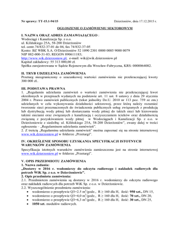 Nr sprawy: TT-15.1-94/15 Dzierżoniów, dnia 17.12.2015 r. OGŁOSZENIE O ZAMÓWIENIU SEKTOROWYM I. NAZWA ORAZ ADRES ZAMAWIAJĄCEGO : Wodociągi i Kanalizacja Sp. z o.o. ul. Kilińskiego 25A, 58-200 Dzierżoniów tel. centr.74/832-37-01 do 04, fax 74/832-37-05 Konto: BZ WBK S.A. O/Dzierżoniów 52 1090 2301 0000 0005 9000 0079 NIP 882-000-31-83; REGON 890611183; http://www.wik.dzierzoniow.pl, e-mail: [email protected] Kapitał zakładowy: 55 313 000,00 zł. Spółka zarejestrowana w Sądzie Rejonowym dla Wrocław-Fabryczna, KRS: 0000064082. II. TRYB UDZIELENIA ZAMÓWIENIA Przetarg nieograniczony o szacunkowej wartości zamówienia nie przekraczającej kwoty 300 000 zł.. III. PODSTAWA PRAWNA 1. „Regulamin udzielania zamówień o wartości zamówienia nie przekraczającej kwot określonych w przepisach wydanych na podstawie art. 11 ust. 8 ustawy z dnia 29 stycznia 2004 r. Prawo zamówień publicznych (tekst jednolity Dz.U. 2010 nr 113 poz. 759 ze zm.) udzielanych w celu wykonywania działalności sektorowej, przez którą należy rozumieć tworzenie sieci przeznaczonych do świadczenia publicznych usług związanych z produkcją lub dystrybucją wody pitnej lub dostarczania wody pitnej do takich sieci lub kierowania takimi sieciami oraz związanych z kanalizacją i oczyszczaniem ścieków oraz działalnością związaną z pozyskiwaniem wody pitnej w Wodociągach i Kanalizacji Sp. z o.o. w Dzierżoniowie z siedzibą: ul. Kilińskiego 25A, 58-200 Dzierżoniów”, zwany dalej w treści ogłoszenia – „Regulaminem udzielania zamówień”. 2. Z treścią „Regulaminu udzielania zamówień” można zapoznać się na stronie internetowej www.wik.dzierzoniow.pl w folderze „Przetargi”. IV. OKREŚLENIE SPOSOBU UZYSKANIA SPECYFIKACJI ISTOTNYCH WARUNKÓW ZAMÓWIENIA Specyfikacja istotnych warunków zamówienia zamieszczona jest na stronie internetowej www.wik.dzierzoniow.pl w folderze „Przetargi”. V. OPIS PRZEDMIOTU ZAMÓWIENIA 1. Nazwa zadania: „Dostawy w 2016 r. wodomierzy do odczytu radiowego i nakładek radiowych dla potrzeb WiK Sp. z o.o. w Dzierżoniowie”. 2. Opis przedmiotu zamówienia: 2.1. Przedmiotem zamówienia są dostawy w 2016 r. wodomierzy do odczytu radiowego oraz nakładek radiowych dla potrzeb WiK Sp. z o.o. w Dzierżoniowie. 2.2. Wyszczególnienie przedmiotu zamówienia: wodomierze o przepływie Q3=2.5 m3/godz., R ≥ 160 dla H, ilość: 950 szt., DN 15, wodomierze o przepływie Q3=4,0 m3/godz., R ≥ 160 dla H, ilość: 70 szt., DN 20, wodomierze o przepływie Q3=6,3 m3/godz., R ≥ 160 dla H, ilość: 30 szt., DN 25, 1050 szt. modułów radiowych. 2.3. Dostawy wodomierzy do odczytu radiowego i nakładek radiowych następować będą sukcesywnie partiami (jeden raz na kwartał) w ciągu roku 2016 na telefoniczne zgłoszenie Zamawiającego. Szczegółowy harmonogram dostaw uzgodniony będzie z Wykonawcą wyłonionym w drodze przetargu. 3. Wymagania stawiane wodomierzom: 3.1. Wodomierze muszą być zgodne z: a. Rozporządzeniem Ministra Gospodarki z dnia 23 października 2007 r. w sprawie wymagań, którym powinny odpowiadać wodomierze oraz szczegółowego zakresu sprawdzeń wykonywanych podczas prawnej kontroli metrologicznej tych przyrządów pomiarowych (Dz. U. Nr 209/2007 poz. 1513); b. Rozporządzeniem Ministra Gospodarki z dnia 7 stycznia 2008 r. w sprawie prawnej kontroli metrologicznej przyrządów pomiarowych (Dz. U. Nr 5/2008 poz. 29) oraz powinny odpowiadać wymaganiom normy PN-ISO4064 lub PNEN 14154. 3.2. Wodomierze muszą posiadać aktualne zatwierdzenie typu EWG lub certyfikat badania typu WE według MID obowiązujące na terenie całej UE, dopuszcza się zatwierdzenie krajowe ważne wyłącznie w Polsce. Wymagane jest załączenie jednego wymaganych wyżej dokumentów wraz z tłumaczeniem na język polski wykonanym przez tłumacza przysięgłego, jeżeli dokument jest w języku obcym. 3.3. Wodomierze muszą posiadać aktualny atest higieniczny 3.4. Konstrukcja wodomierza ma być suchobieżna (całkowicie sucha przekładnia oraz liczydło). 3.5. Liczydło wodomierza mechaniczne 8 cyfrowe, hermetyczne, odporne na zaparowanie, zabezpieczone klapką. 3.6. Materiały mające kontakt z wodą muszą być odporne na korozję wewnętrzną i zewnętrzną lub zabezpieczone przed korozją poprzez odpowiednią obróbkę powierzchniową. 3.7. Korpus wodomierza nie może być wykonany z tworzywa sztucznego. 3.8. Wodomierze muszą być przystosowane do zamontowania (w miejscu instalacji bez użycia przewodów zasilających i naruszenia ich cech legalizacyjnych) zamiennie dla każdego z następujących modułów komunikacyjnych (nakładek) pracujących w standardzie Cyble : nadajnika impulsów, modułu transmisji M-BUS (PN-EN143-3) oraz modułu radiowego w systemie dwukierunkowym pracującego w wolnym paśmie 433 MHz. Nie dopuszcza się rozwiązań opartych na magnesy stałe podatne na zakłócenia silnym polem magnetycznym oraz urządzeń czułych na światło. 3.9. Każdy dostarczony wodomierz musi być fabrycznie nowy i posiadać aktualną cechę legalizacyjną, którą nadano nie wcześniej niż w roku dostawy wodomierzy tj. 2016. 3.10. Wodomierze muszą mieć gwarancję na 5 lat. 4. Wymagania stawiane modułom radiowym: 4.1. System radiowy zgodny z systemem stosowanym przez WiK Sp. z o.o. w Dzierżoniowie (kompatybilny z systemem zdalnego odczytu „Itron”). 4.2. Transmisja radiowa pomiędzy terminalem, modułami radiowymi dwukierunkowa umożliwiająca zdalne programowanie parametrów modułu (nakładki). 4.3. System radiowy pracujący w paśmie nie wymagającym specjalnego pozwolenia, o częstotliwości 433 MHz. 4.4. Stopień ochrony modułu radiowego (nakładki) IP 68 (możliwość całkowitego zalania wodą). 4.5. Nakładki zasilane bateryjnie montowane bezpośrednio na wodomierzach, posiadające następujące alarmy i funkcje: wyciek, przepływ wsteczny, sygnalizację demontażu lub próby demontażu, użycia magnesu, niskiego poziomu baterii, przekroc