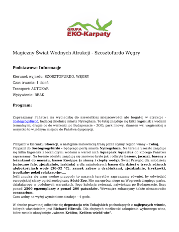 Magiczny Świat Wodnych Atrakcji - Szosztofurdo Węgry Podstawowe Informacje Kierunek wyjazdu: SZOSZTOFURDO, WĘGRY Czas trwania: 1 dzień Transport: AUTOKAR Wyżywienie: BRAK Program: Zapraszamy Państwa na wycieczkę do niewielkiej miejscowości ale bogatej w atrakcje Sóstógyógyfürdő, będącej dzielnicą miasta Nyireghaza. To tutaj znajduje się kilka kąpielisk z wodami termalnymi, drugie co do wielkości po Budapeszcie – ZOO, park linowy, skansen wsi węgierskiej a wszystko to w jednym miejscu do Państwa dyspozycji. Przejazd w kierunku Słowacji, a następnie malowniczą trasą przez słynny region winny – Tokaj; Przyjazd do Sóstógyógyfürdő - będącego perłą miasta Nyíregyháza. Na terenie Szoszto znajduje się kilka kąpielisk z leczniczymi wodami a wsród nich Aquapark Aquarius do którego Państwa zapraszamy. Na terenie obiektu znajdują się zarówno kryte jak i odkryte baseny, jacuzzi, baseny z leżankami do masażu, basen Kneippa (z zimną i ciepłą wodą); Świat Przygód dla młodzieży (sztuczne fale, zjeżdżalnie, jaskinia) a dla najmłodszych basen dla dzieci o trzech różnych głębokościach wody (30-32 °C), zamek zabaw z drabinkami, zjeżdżalnie, tryskawki, tropikalny pokój relaksacyjny.... Jeśli znudzą się wam wodne przygody to naszych turystów zapraszamy również by odwiedzić europejskiej sławy ogród zoologiczny Sóstó Zoo. Nie ma oprócz niego na Węgrzech drugiego parku, działającego w podobnych warunkach. Jego kolekcja zwierząt, największa po Budapeszcie, liczy ponad 2500 egzemplarzy z ponad 200 gatunków. Wewnątrz zobaczymy także niesamowite oceanarium. Czas wolny na wyżej wymienione atrakcje – 4 godz. W drodze powrotnej odbędzie się degustacja win Tokajskich pochodzących z najlepszych winnic, których właścicielem jest Richard Hörcsik. Dla chętnych możliwość zakupienia wybornego wina, które zostało okrzyknięte „winem Królów, Królem wśród win”. Cena zawiera: degustacja win Tokajskich, usługę pilota/ przewodnika, transport, opłaty drogowe i graniczne, ubezpieczenie KL i NNW, VAT. Cena nie zawiera: biletów wstępu na baseny (30 zł), zoo (ok. 30 zł), możliwość wykupienia obiadu serwowanego na terenie basenów (20 zł) Waluta: węgierski forint (1 PLN = 70 Ft) Granica: w Radoszycach Hotel: brak Dokumenty: dowód osobisty lub paszport Czas trwania: około 18 godzin Pogoda: Część basenów znajduje się również na zewnątrz, dlatego zachęcamy zabrac ze sobą kremy do opalania z wysokim filtrem, kapelusz ochraniający przed słońcem oraz wodę do picia. Przykładowe ceny: W sklepach spożywczych: chleb pszenny 1kg – 130 Ft, mleko 1l – 120 Ft, piwo – 300 Ft, sok 2l – 250 Ft, ziemniaki 1kg – 180 Ft, pomidory 1kg – 270 Ft, w restauracjach i barach: lody 300 Ft, kawa – 300 Ft, zupy – 500 Ft, dania mięsne – 1500 Ft, piwo – 300 Ft. Uwagi: Węgry należą do strefy Schengen a więc nie ma kontroli granicznej, jednakże należy pamiętać, że możemy zostać poproszeni o dokument tożsamości w każdym miejscu na terytorium kraju. W przypadku braku dokumentu grozi mandat. Na basenach nie ma obowiązku posiadania czepków, warto wziąć ze sobą klapki, ręcznik. Na terytorium basenów jest kilka barów, gdzie można zjeść obiad. Trasa z Ustrzyk Dolnych do Szosztofurdo ma ok. 270 km w jedną stronę, dlatego zawsze jeździmy klimatyzowanymi autokarami a drogę umila nam przewodnik opowiadający ciekawe informacje o kraju. Podobne Wycieczki: 1. 2. 3. 4. 5. Miszkolc - węgierskie baseny termalne Rafting na rzece Czeremosz Morskie Oko Wyhorlatu - Sniński Kamień Wycieczka w Bieszczady Wysokie Spływ po Dniestrze na Katamaranach Ustjanowa Górna Grupa Eko-Karpaty Sp. z o.o. Ustjanowa Górna 242H 38-700 Ustrzyki Dolne tel/fax +48 13 461 36 45 kom. +48 512 226 481 www.eko-karpaty.com [email protected] [email protected] Ustrzyki Dolne Grupa Eko-Karpaty ul. Rynek 19 38-700 Ustrzyki Dolne tel. +48 13 461 10 09 tel./fax +48 13 461 36 46 kom. +48 512 226 481 www.eko-karpaty.com [email protected] Lwów Trident - Eko-Karpaty ul. Kopernika 18 79000 Lviv tel. +38 032 298 9114 www.eko-karpaty.com [email protected] [email protected] NIP 6891190518 [email protected] NIP 6891190518