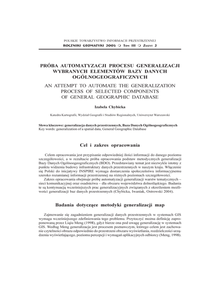 TOWARZYSTWO INFORMACJI PróbaPOLSKIE automatyzacji procesu generalizacji wybranychPRZESTRZENNEJ elementów BDO ROCZNIKI GEOMATYKI 2005 m TOM III m ZESZYT 2 27 PRÓBA AUTOMATYZACJI PROCESU GENERALIZACJI WYBRANYCH ELEMENTÓW BAZY DANYCH OGÓLNOGEOGRAFICZNYCH AN ATTEMPT TO AUTOMATE THE GENERALIZATION PROCESS OF SELECTED COMPONENTS OF GENERAL GEOGRAPHIC DATABASE Izabela Chybicka Katedra Kartografii, Wydzia³ Geografii i Studiów Regionalnych, Uniwersytet Warszawski S³owa kluczowe: generalizacja danych przestrzennych, Baza Danych Ogólnogeograficznych Key words: generalization of a spatial data, General Geographic Database Cel i zakres opracowania Celem opracowania jest przypisanie odpowiedniej iloci informacji do danego poziomu szczegó³owoci, a w rezultacie próba opracowania podstaw metodycznych generalizacji Bazy Danych Ogólnoogeograficznych (BDO). Przedstawiany temat jest niezwykle istotny z punktu widzenia budowy infrastruktury danych przestrzennych w naszym kraju. W³¹czenie siê Polski do inicjatywy INSPIRE wymaga dostarczenia spo³eczeñstwu informacyjnemu szeroko rozumianej informacji przestrzennej na ró¿nych poziomach szczegó³owoci. Zakres opracowania obejmuje próbê automatyzacji generalizacji warstw tematycznych  sieci komunikacyjnej oraz osadnictwa  dla obszaru województwa dolnol¹skiego. Badania te s¹ kontynuacj¹ wczeniejszych prac generalizacyjnych zwi¹zanych z okreleniem mo¿liwoci generalizacji baz danych przestrzennych (Chybicka, Iwaniak, Ostrowski 2004). Badania dotycz¹ce metodyki generalizacji map Zajmowanie siê zagadnieniem generalizacji danych przestrzennych w systemach GIS wymaga wczeniejszego zdefiniowania tego problemu. Przytoczyæ mo¿na definicjê zaproponowan¹ przez Liqiu Meng (1998), gdy¿ bierze ona pod uwagê generalizacjê w systemach GIS. Wed³ug Meng generalizacja jest procesem poznawczym, którego celem jest zachowanie czytelnoci obrazu odpowiednio do przestrzeni obszaru wywietlania, rozdzielczoci urz¹dzenia wywietlaj¹cego, poziomu percepcji i wymagañ aplikacyjnych odbiorcy (Meng, 1998). 28 Izabela Chybicka Jednym z g³ównych za³o¿eñ automatycznej generalizacji jest poznanie procesu generalizacji z punktu widzenia jego formalizacji, a wiêc zaproponowania sekwencji elementarnych kroków, które wykonane w rodowisku komputerowym (GIS) pozwol¹ na uzyskanie danych przestrzennych uogólnionych, o zak³adanym stopniu szczegó³owoci. Nale¿y jednak za³o¿yæ, ¿e podjête czynnoci (kroki generalizacyjne) bêd¹ na tyle obiektywne, i¿ wykonane przez dwóch kartografów niezale¿nie, doprowadz¹ do tego samego rezultatu. Od blisko dwóch dekad pozyskiwanie i implementacja wiedzy kartograficznej w systemach komputerowych jest najczêciej pojawiaj¹cym siê zagadnieniem w literaturze kartograficznej. Tradycyjne metody statystyczne w zagadnieniach zwi¹zanych z generalizacj¹ zosta³y wyparte przez systemy oparte o regu³y (systemy ekspertowe), dominuj¹ce jako technika gromadzenia wiedzy, któr¹ pozyskiwano z istniej¹cej dokumentacji oraz na podstawie wywiadów z ekspertami, czy na bazie istniej¹cych przyk³adów. Wiedzê tê opisywano w postaci regu³: jeli...to.... S³abym punktem tak skonstruowanych systemów by³ jednak brak precyzji regu³, a w rezultacie brak jednoznacznoci. Wiedza pozyskiwana od ró¿nych ekspertów ró¿ni³a siê. Powsta³a, wiêc koncepcja by nauczyæ maszynê pozyskiwania wiedzy eksperckiej tzw. wy¿szego poziomu lub strategii rozwi¹zywania problemów poprzez przyk³ady i wiedzê podstawow¹, analogicznie jak w procesie uczenia siê cz³owieka. Powsta³y specjalne algorytmy ucz¹ce, a systemy wzbogacone o nie nazywamy systemami eksploracji danych (Meng, 2005). Wspomnieæ mo¿na tutaj chocia¿by o systemach sieci neuronowych, uczonych na wzorcach danych za pomoc¹ wspomnianych algorytmów, by nastêpnie wykonywaæ wyuczone czynnoci na innym materiale. Dodatkow¹ zalet¹ systemów eksploracji danych w stosunku do metod statystycznych, przemawiaj¹cych za stosowaniem ich w procesie generalizacji jest fakt, i¿ w procesie statystycznym w celu uzyskania zmiennych zale¿nych nale¿y posiadaæ wszystkie zmienne wejciowe niezale¿ne jako dane, natomiast w systemach eksploracyjnych dopuszczalna jest równie¿ sytuacja, w której bez znajomoci wszystkich zmiennych niezale¿nych znajduje siê optymaln¹ przestrzeñ rozwi¹zania. W literaturze znanych jest szereg technik eksploracji danych, takich jak: drzewo decyzyjne, logika rozmyta czy sztuczne sieci neuronowe. Ich zastosowanie w procesie automatyzacji generalizacji map ma³oskalowych, gdzie nie ma kompletnych instrukcji i poszukuje siê pewnego optymalnego przedzia³u rozwi¹zañ, mog³oby daæ interesuj¹ce rezultaty. Baza Danych Ogólnogeograficznych Przedmiotem rozwa¿anego procesu generalizacji jest Baza Danych Ogólnogeograficznych. Baza ta jest podstawowym komponentem Krajowego Systemu Informacji Geograficznej, zawieraj¹cym dane przestrzenne stanowi¹ce odniesienie dla innych danych i obiektów. Umo¿liwia to identyfikacjê obiektów referencyjnych dotycz¹cych pokrycia terenu i u¿ytkowania ziemi. W sk³ad BDO wchodz¹ nastêpuj¹ce warstwy tematyczne: m podzia³ administracyjny, m osadnictwo i obiekty antropogeniczne, m hydrografia, m rzeba terenu, m transport, m pokrycie terenu i u¿ytkowanie ziemi, m obszary chronione i zamkniête, m nazwy geograficzne. Próba automatyzacji procesu generalizacji wybranych elementów BDO 29 Opracowanie dotyczy warstwy sieci komunikacyjnej, w sk³ad której wchodz¹ koleje i drogi oraz warstwy osadnictwa, a wiêc miejscowoci  prezentowane za pomoc¹ sygnatur i kontury zabudowy, dla wiêkszych miejscowoci. Narzêdzia generalizacji Do przygotowania eksperymentu zastosowano komercyjne oprogramowanie firmy Intergraph: GeoMedia s³u¿¹ce do wykonywania zaawansowanych analiz przestrzennych oraz DynaGEN  specjalistyczny system do wspomagania procesu generalizacji map. W realizacji eksperymentu wykorzystano model McMastera i Shea. 