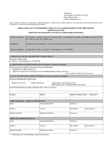 Załącznik do Uchwały Nr XXIX.274.2013 Rady Miasta Ełku z dnia 26 lutego 2013 r. POLA JASNE WYPEŁNIA WŁAŚCICIEL NIERUCHOMOŚCI. WYPEŁNIAĆ KOMPUTEROWO LUB RĘCZNIE, DUŻYMI DRUKOWANYMI LITERAMI CZARNYM LUB NIEBIESKIM KOLOREM DEKLARACJA O WYSOKOŚCI OPŁATY ZA GOSPODAROWANIE ODPADAMI KOMUNALNYMI właścicieli nieruchomości, na których zamieszkują mieszkańcy Podstawa prawna Art. 6n ust. 1 ustawy z dnia 13 września 1996 r. o utrzymaniu czystości i porządku w gminach (Dz. U. z 2012 r., poz. 391 z późn. zm.) Składający Właściciele nieruchomości, na których zamieszkują mieszkańcy, położonych na terenie Miasta Ełku Miejsce składania Urząd Miasta Ełku; ul. Marsz. J. Piłsudskiego 4, 19-300 Ełk A. ORGAN WŁAŚCIWY DO PRZYJĘCIA DEKLARACJI Prezydent Miasta Ełku ul. Marsz. J. Piłsudskiego 4, 19-300 Ełk B. OBOWIĄZEK ZŁOŻENIA DEKLARACJI (zaznaczyć właściwy kwadrat) Okoliczności powodujące obowiązek złożenia deklaracji □ PIERWSZA DEKLARACJA □ ZMIANA DANYCH ZAWARTYCH W POPRZEDNIEJ DEKLARACJI -.......................................... ( data wystąpienia zmiany-dzień-miesiąc-rok) C. DANE WŁAŚCICIELA NIERUCHOMOŚCI (zaznaczyć właściwy kwadrat) Rodzaj składającego deklarację: □ OSOBA FIZYCZNA □ OSOBA PRAWNA □ JEDNOSTKA ORGANIZACYJNA NIEPOSIADAJĄCA OSOBOWOŚCI PRAWNEJ NAZWISKO PIERWSZE IMIĘ, DRUGIE IMIĘ / PEŁNA NAZWA ........................................................................................................................................................................... PESEL ...................................................... KRS* ) IDENTYFIKATOR REGON* ) ....................................................... ....................................................... ADRES SIEDZIBY / ADRES ZAMIESZKANIA KRAJ WOJEWÓDZTWO POWIAT GMINA ULICA NR DOMU MIEJSCOWOŚĆ KOD POCZTOWY POCZTA KRAJ WOJEWÓDZTWO POWIAT GMINA ULICA NR DOMU MIEJSCOWOŚĆ KOD POCZTOWY POCZTA NR LOKALU ADRES DO KORESPONDENCJI *) jeśli numer nie został nadany wpisać nie dotyczy NR LOKALU D. DANE NIERUCHOMOŚCI, NA KTÓREJ POWSTAJĄ ODPADY KOMUNALNE D.1. ADRES NIERUCHOMOŚCI KRAJ WOJEWÓDZTWO POWIAT GMINA ULICA NR DOMU MIEJSCOWOŚĆ KOD POCZTOWY POCZTA NR LOKALU D.2. NUMER EWIDENCYJNY NIERUCHOMOŚCI W REJESTRZE GRUNTÓW Obręb.............................................. Nr działki..................................................... .................... D.3. FORMA WŁADANIA NIERUCHOMOŚCIĄ (zaznaczyć właściwy kwadrat) □ WŁAŚCICIEL / WSPÓŁWŁAŚCICIEL □ INNY:................................................................................................................ (należy podać jaki) E. WYLICZENIE OPŁATY ZA GOSPODAROWANIE ODPADAMI KOMUNALNYMI (zaznaczyć właściwy kwadrat) □ NIE SEGREGUJĘ ODPADÓW NA SUCHE I MOKRE1) □ SEGREGUJĘ ODPADY NA SUCHE I MOKRE1) Oświadczam, że na terenie nieruchomości wskazanej w części D niniejszej deklaracji w budynku/budynkach znajduje się:....................................................... sztuk gospodarstw w tym: . (należy podać liczbę gospodarstw) □ □ □ □ bardzo małe gospodarstwo (1 osoba) -................................ sztuk małe gospodarstwo (2 osoby) -............................................ sztuk średnie gospodarstwo (3 osoby) -........................................ sztuk duże gospodarstwo (4 osoby) -............................................. sztuk □ bardzo duże gospodarstwo (5 i więcej osób) -...................... sztuk Wysokość miesięcznej opłaty za gospodarowanie odpadami komunalnymi stanowić będzie suma iloczynów zadeklarowanej liczby gospodarstw oraz stawki opłaty zatwierdzonej aktualną uchwałą Rady Miasta Ełku w sprawie wysokości opłaty za gospodarowanie odpadami komunalnymi, która zamieszczona będzie na stronie internetowej Biuletynu Informacji Publicznej Urzędu Miasta Ełku: http://bip.um.elk.pl 2 Wyliczenie miesięcznej opłaty za gospodarowanie odpadami komunalnymi: ................................................. (ilość gospodarstw bardzo małych) x.................................................... =........................................................ (stawka opłaty) (wysokość miesięcznej opłaty) ................................................. (ilość gospodarstw małych) x.................................................... (stawka opłaty) ..................................................….x.................................................... (ilość gospodarstw średnich) (stawka opłaty) ................................................. (ilość gospodarstw dużych) =........................................................ (wysokość miesięcznej opłaty) =............................................................ (wysokość miesięcznej opłaty) x.................................................... (stawka opłaty) =............................................................ (wysokość miesięcznej opłaty) ................................................. x.................................................... (ilość gospodarstw bardzo dużych) (stawka opłaty) =........................................................... (wysokość miesięcznej opłaty) Łączna wysokość miesięcznej opłaty =................................................................ (suma opłat podanych wyżej) F. OŚWIADCZENIE I PODPIS SKŁADAJĄCEGO DEKLARACJĘ Oświadczam, że dane zawarte w deklaracji są zgodne z prawdą. …….................................................................... .............................................. (miejscowość i data) ............................................................................ (czytelny podpis składającego deklarację) G. ADNOTACJE ORGANU Pouczenie: Niniejsza deklaracja stanowi podstawę do wystawienia tytułu wykonawczego, zgodnie z przepisami ustawy z dnia 17 czerwca 1966 r. o postępowaniu egzekucyjnym w administracji (Dz. U. z 2005 r. Nr 