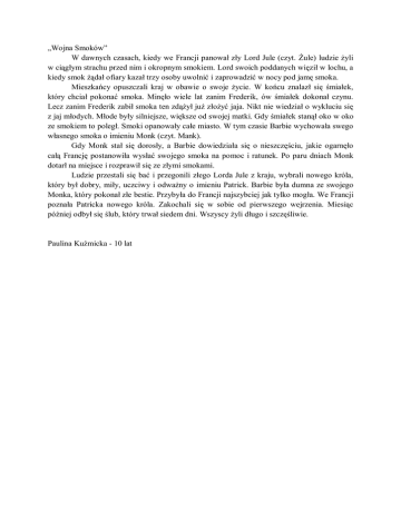 „Wojna Smoków” W dawnych czasach, kiedy we Francji panował zły Lord Jule (czyt. Żule) ludzie żyli w ciągłym strachu przed nim i okropnym smokiem. Lord swoich poddanych więził w lochu, a kiedy smok żądał ofiary kazał trzy osoby uwolnić i zaprowadzić w nocy pod jamę smoka. Mieszkańcy opuszczali kraj w obawie o swoje życie. W końcu znalazł się śmiałek, który chciał pokonać smoka. Minęło wiele lat zanim Frederik, ów śmiałek dokonał czynu. Lecz zanim Frederik zabił smoka ten zdążył już złożyć jaja. Nikt nie wiedział o wykluciu się z jaj młodych. Młode były silniejsze, większe od swojej matki. Gdy śmiałek stanął oko w oko ze smokiem to poległ. Smoki opanowały całe miasto. W tym czasie Barbie wychowała swego własnego smoka o imieniu Monk (czyt. Mank). Gdy Monk stał się dorosły, a Barbie dowiedziała się o nieszczęściu, jakie ogarnęło całą Francję postanowiła wysłać swojego smoka na pomoc i ratunek. Po paru dniach Monk dotarł na miejsce i rozprawił się ze złymi smokami. Ludzie przestali się bać i przegonili złego Lorda Jule z kraju, wybrali nowego króla, który był dobry, miły, uczciwy i odważny o imieniu Patrick. Barbie była dumna ze swojego Monka, który pokonał złe bestie. Przybyła do Francji najszybciej jak tylko mogła. We Francji poznała Patricka nowego króla. Zakochali się w sobie od pierwszego wejrzenia. Miesiąc później odbył się ślub, który trwał siedem dni. Wszyscy żyli długo i szczęśliwie. Paulina Kuźmicka - 10 lat
