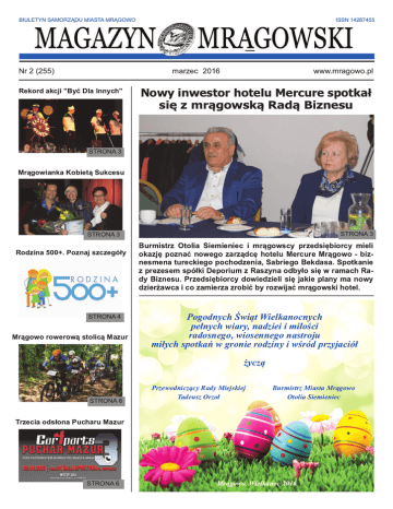 www.mragowo.pl marzec 201 6 Nr 2 (255) Rekord akcji "Być Dla Innych" Nowy inwestor hotelu Mercure spotkał się z mrągowską Radą Biznesu STRONA 3 Mrągowianka Kobietą Sukcesu STRONA 3 Rodzina 500+. Poznaj szczegóły STRONA 4 Mrągowo rowerową stolicą Mazur STRONA 3 Burmistrz Otolia Siemieniec i mrągowscy przedsiębiorcy mieli okazję poznać nowego zarządcę hotelu Mercure Mrągowo - biznesmena tureckiego pochodzenia, Sabriego Bekdasa. Spotkanie z prezesem spółki Deporium z Raszyna odbyło się w ramach Rady Biznesu. Przedsiębiorcy dowiedzieli się jakie plany ma nowy dzierżawca i co zamierza zrobić by rozwijać mrągowski hotel. Pogodnych Świąt Wielkanocnych pełnych wiary, nadziei i miłości radosnego, wiosennego nastroju miłych spotkań w gronie rodziny i wśród przyjaciół życzą STRONA 6 Przewodniczący Rady Miejskiej Tadeusz Orzoł Burmistrz Miasta Mrągowo Otolia Siemieniec Trzecia odsłona Pucharu Mazur STRONA 6 Mrągowo, Wielkanoc 2016 www.mragowo.pl 2 AKTUALNOŚCI Podsumowanie sezonu na lodowisku miejskim w Mrągowie Przekaż swój 1% organizacjom pozarządowym z Mrągowa Do 30 kwietnia musimy rozliczyć się z Urzędem Skarbowym za 201 5 rok. Zachęcamy wszystkich mieszkańców Mrągowa do przekazania 1 % podatku na rzecz Organizacji Pożytku Publicznego działających w naszym regionie i mieście. W tym sezonie zimowym mrągowianie mogli cieszyć się miejskim lodowiskiem. Oficjalne otwarcie nastąpiło 29 grudnia 201 5. Towarzyszyły mu pokazy profesjonalnych łyżwiarzy figurowych, liczne atrakcje i animacje na lodzie. Lodowisko mieściło się przy Zespole Szkół nr 1 ul. Bohaterów Warszawy 4 i było czynne 7 dni w tygodniu. - Lodowisko było dla mieszkańców ciekawą propozycją aktywnego spędzenia wolnego czasu – mówi Burmistrz Otolia Siemieniec. - Pomimo, że aura nie była sprzyjająca, bo zimy w tym roku było jak na lekarstwo, lodowisko cieszyło się sporym zainteresowaniem. W całym sezonie odwiedziło nas ponad 7,5 tys osób, a mamy nadzieję, że w przyszłym sezonie liczba ta jeszcze wzrośnie. Chcemy serdecznie podziękować firmie Farmtrac, która udostępniła swój ciągnik, do którego podczepiana była maszyna zbierająca śnieg i wyrównująca taflę lodu - mówi Lech Gołębicki Dyrektor Centrum Kultury. - Pozwoliło to znacznie obniżyć koszty utrzymania lodowiska, a firma zyskała nietypową promocję. Akcja "Wspieram region" ma na celu zachęcenie mieszkańców naszego regionu do przekazania 1 % podatku dochodowego dla organizacji pożytku publicznego. W województwie warmińsko-mazurskim prawo do otrzymywania 1 procenta podatku dochodowego od osób fizycznych ma obecnie ponad 300 stowarzyszeń i fundacji. W samym Mrągowie jest ich kilkanaście. Dodatkowe informacje na temat akcji mogą Państwo uzyskać poprzez kontakt z Departamentem Koordynacji Promocji Urzędu Marszałkowskiego tel.: 89 51 2 51 70 lub 89/ 51 2 51 75, e-mail: [email protected] PCK z dopiskiem na Mrągowski PCK KRS: 0000225587 Polski Związek Niewidomych Okręg Warmińsko-Mazurski Koło w Mrągowie KRS: 0000091 325 Stowarzyszenie Wielokierunkowej Pomocy "Remedium" KRS: 0000269337 Stowarzyszenie Wspierania Edukacji Artystycznej Dzieci i Młodzieży "Sukces" KRS: 000001 2703 TPD z dopiskiem Koło Rodziców Dzieci Specjalnej Troski w Mrągowie Lista mrągowskich organizacji upraw- KRS: 0000232728 nionych do otrzymania 1 % podatku : ZHP z dopiskiem na Mrągowski Hufiec KRS 0000094699 Domy dla Dzieci Towarzystwa Nasz Dom w Mrągowie, KRS: 0000050053 Hospicjum Domowe im. Św. Wojciecha KRS: 0000061 654 Klub Sportowy "Baza Mrągowo" Ochotnicza Straż Pożarna w Mrągowie KRS 0000 11 6 21 2 (konieczny jest dopisek Ochotnicza Straż Pożarna w Mrągowie ul. Oficerska 2A, 11 -700 Mrągowo) LOT Ziemia Mrągowska KRS: 0000048772 KRS 0000206964 Miejski Klub Sportowy "Mrągowia" Stowarzyszenie na rzecz pomocy rodzinie SYNAPSA, KRS 0000005380 KRS: 00002471 74 Mrągowskie Stowarzyszenie Rowerowe Stowarzyszenie Tradycji Wojska Polskiego, KRS 0000458920 Mrągowskie Towarzystwo Wędkarskie Parasol Grupa Wsparcia KRS: 0000050551 KRS: 0000079328 KRS 0000338389 z dopiskiem 1 0771 Farmtrac wspiera lodowisko w Mrągowie Magazyn Mragowski Biuletyn Samorządu Lokalnego Bezpłatny ISSN 1 4287455, Nakład : 2 000 egzemplarzy Wydawca: Rada Miejska i Burmistrz Miasta Mrągowo, Redaktor: Donata Kobylińska - Durka Skład komputerowy: Paweł Krasowski, [email protected] Adres redakcji : Urząd Miejski, Referat Strategii, Rozwoju, Promocji i Integracji Europejskiej ul. Królewiecka 60A, tel. 741 90 41 , [email protected] Projekt winiety: Piotr Dondajewski telefon: 89 741 90 41 Nowy zarządca hotelu Mercure spotkał się z burmistrzem i przedsiębiorcami Burmistrz Otolia Siemieniec i mrągowscy przedsiębiorcy mieli okazję poznać nowego zarządcę hotelu Mercure Mrągowo - biznesmena tureckiego pochodzenia, Sabriego Bekdasa. Spotkanie z prezesem spółki Deporium z Raszyna odbyło się w ramach Rady Biznesu. Przedsiębiorcy dowiedzieli się jakie plany ma nowy dzierżawca i co zamierza zrobić by rozwijać mrągowski hotel. Sabri Bekdas to biznesmen tureckiego pochodzenia, który inwestował w polskie nieruchomości i kluby piłkarskie od lat 90. XX w. W Polsce znany jest głównie z warszawskich projektów Millennium Plaza i Blue City, a także podwarszawskiego Centrum Handlu Hurtowego Maximus. W piątek, 11 marca, Sabri Bekdas spotkał się z przedstawicielami mrągowskiego biznesu oraz burmistrz Mrągowa Otolią Siemieniec. Bekdas chciał poznać potencjał miejsca oraz nawiązać kontakty gospodarcze, a także poinformować gości o swoich planach dotyczących dalszej działalności hotelu. – Bardzo dziękuję za zaproszenie na to spotkanie – mówił Sabri Bekdas. – Cieszę się, że mogłem poznać mrągowskich przedsiębiorców. Dobre relacje to podstawa, dlatego liczę na współpracę i wspólne przedsięwzięcia w przyszłości. Chcę rozwijać mrągowski hotel, planuj