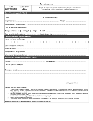 Formularz zwrotu CAMO ul. Kożuchowska 32 65-364 Zielona Góra Tel: 602 529 341 (9-17) denley.pl Uwaga! Nie przyjmujemy paczek za pobraniem wysłanych w ramach zwrotu. Zwrot pieniędzy możliwy jest wyłącznie poprzez przelew bankowy. Dane klienta (wypełnia Klient) Login: …........................................................................ Nr zamówienia/aukcji: …............................................................. Imię i nazwisko: …................................................................................................ Telefon: …............................................ Kod pocztowy i miejscowość: …......................................................................................................................................... Ulica, numer domu/mieszkania: …..................................................................................................................................... Zakupu dokonano na: [ ] denley.pl [ ] allegro E-mail: ….......................................................................................... Data wypełnienia formularza: ….....................…..... Kwota do zwrotu:................................... Dane do przelewu (wypełnia Klient) Numer rachunku bankowego: Dane właściciela rachunku: Imię i nazwisko: …................................................................................................................................................................ Kod pocztowy i miejscowość: …......................................................................................................................................... Ulica, numer domu/mieszkania: …..................................................................................................................................... Informacje o przedmiocie (wypełnia Klient) Produkt: …........................................................................... Data zakupu: ….................................................................. Data otrzymania przesyłki: ….............................................. Przyczyna zwrotu: ............................................................................................................................................................. ….............…....................................................................................................................................................................... …....................................................................................................................................................................................... …...........................…................................... czytelny podpis Klienta Ogólne warunki zwrotu towaru: 1. 2. 3. 4. 5. Towar do zwrotu należy przesłać z dołączonym dowodem zakupu oraz poprawnie wypełnionym formularzem wymiany na adres siedziby firmy. Przesyłka powinna być odpowiednio zabezpieczona przed uszkodzeniem w trakcie transportu (produkt uszkodzony podczas przesyłki nie będzie podlegał zwrotowi). Zwrotowi podlegają wyłącznie towary nieużywane, niezabrudzone, pozbawionego zapachu (np. dezodorant, krem), posiadające wszystkie oryginalnie przymocowane metki. Zwrotu można dokonać w ciągu 10 dni roboczych od otrzymania przesyłki. Koszty odesłania towaru ponosi Klient. Zwrot kwoty zakupu realizowany jest na podane konto bankowe do 14 dni roboczych od daty otrzymania przesyłki od Klienta. Niespełnienie powyższych warunków będzie skutkować odrzuceniem zwrotu.