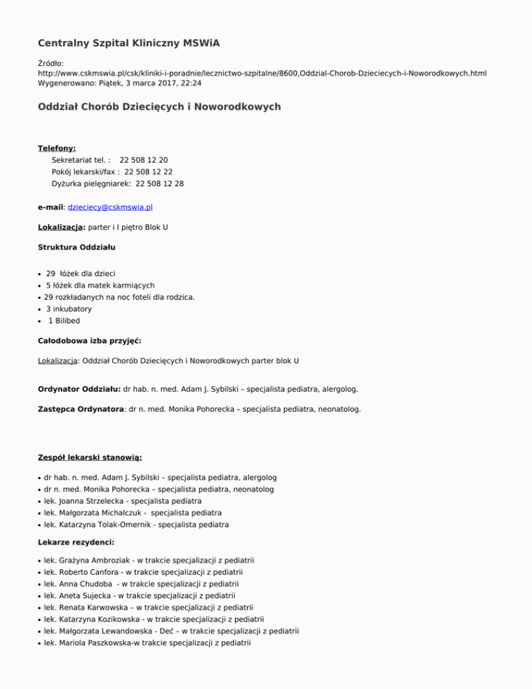 Centralny Szpital Kliniczny MSWiA Źródło: http://www.cskmswia.pl/csk/kliniki-i-poradnie/lecznictwo-szpitalne/8600,Oddzial-Chorob-Dzieciecych-i-Noworodkowych.html Wygenerowano: Piątek, 3 marca 2017, 22:24 Oddział Chorób Dziecięcych i Noworodkowych Telefony: Sekretariat tel. : 22 508 12 20 Pokój lekarski/fax : 22 508 12 22 Dyżurka pielęgniarek: 22 508 12 28 e-mail: [email protected] Lokalizacja: parter i I piętro Blok U Struktura Oddziału ● 29 łóżek dla dzieci ● 5 łóżek dla matek karmiących ● ● ● 29 rozkładanych na noc foteli dla rodzica. 3 inkubatory 1 Bilibed Całodobowa izba przyjęć: Lokalizacja: Oddział Chorób Dziecięcych i Noworodkowych parter blok U Ordynator Oddziału: dr hab. n. med. Adam J. Sybilski – specjalista pediatra, alergolog. Zastępca Ordynatora: dr n. med. Monika Pohorecka – specjalista pediatra, neonatolog. Zespół lekarski stanowią: ● dr hab. n. med. Adam J. Sybilski – specjalista pediatra, alergolog ● dr n. med. Monika Pohorecka – specjalista pediatra, neonatolog ● lek. Joanna Strzelecka - specjalista pediatra ● lek. Małgorzata Michalczuk - specjalista pediatra ● lek. Katarzyna Tolak-Omernik - specjalista pediatra Lekarze rezydenci: ● lek. Grażyna Ambroziak - w trakcie specjalizacji z pediatrii ● lek. Roberto Canfora - w trakcie specjalizacji z pediatrii ● lek. Anna Chudoba - w trakcie specjalizacji z pediatrii ● lek. Aneta Sujecka - w trakcie specjalizacji z pediatrii ● lek. Renata Karwowska – w trakcie specjalizacji z pediatrii ● lek. Katarzyna Kozikowska - w trakcie specjalizacji z pediatrii ● lek. Małgorzata Lewandowska - Deć – w trakcie specjalizacji z pediatrii ● lek. Mariola Paszkowska-w trakcie specjalizacji z pediatrii ● lek. Bartłomiej Powrózek - w trakcie specjalizacji z pediatrii ● lek. Aniela Rokicka – w trakcie specjalizacji z pediatrii ● lek. Magdalena Rutkowska - w trakcie specjalizacji z pediatrii ● lek. Magdalena Szerszeń - w trakcie specjalizacji z pediatrii ● lek. Katarzyna Szklarska – w trakcie specjalizacji z pediatrii Lekarze specjaliści konsultujący dzieci przebywające w oddziale: Alergolog ● dr n. med. Adam Sybilski-specjalista pediatra, specjalista alergolog Dermatolog ● lek. Małgorzata Łukomska-specjalista dermatolog-wenerolog, pediatra, specjalista chorób zakaźnych Kardiolog ● lek. Piotr Perdeus - specjalista pediatra, specjalista kardiolog ● dr n. med. Elzbieta Szymaniak- specjalista pediatra, specjalista kardiolog Neurolog ● dr n.med. Tomasz Kmieć - specjalista neurolog, specjalista neurolog dziecięcy ● dr n. med. Dorota Domańska-Pakieła-pediatra, specjalista neurolog dziecięcy Pulmonolog ● lek. Zofia Kędziorek- pediatra, specjalista pulmonolog Okulista ● dr n. med. Małgorzata Seroczyńska - specjalista okulista Laryngolog ● lek. Ewa Szyszko - specjalista laryngolog Lekarze współpracujący z oddziałem: ● lek. Adam Cieplucha - specjalista neonatolog, specjalista pediatra ● lek. Zofia Czarnowska - pediatra ● lek. Hanna Monkiewicz-Kołodziejczyk - pediatra ● lek. Augustin Sebiguli-Marishekome - specjalista pediatra ● lek. Beata Sikora-Miłowska - pediatra Pielęgniarka Oddziałowa: mgr Alina Kajak oraz zespół pielęgniarski Wykaz dokumentów niezbędnych do przyjęcia ● Skierowanie do Szpitala, ● Książeczka Zdrowia Dziecka, Karta Praw i Obowiązków Małego Pacjenta Zapewniamy prawo do: 1. Intymności i poszanowania godności osobistej Twojego dziecka. 2. Troskliwej i pełnej szacunku opieki. 3. Pełnej informacji o stanie zdrowia dziecka, planowanej diagnostyce i leczeniu. 4. Wypisania dziecka ze szpitala na własne życzenie i otrzymania informacji o możliwych następstwach zaprzestania leczenia w Szpitalu. 5. Informacji, kto z personelu Szpitala jest odpowiedzialny za leczenie Twojego dziecka i opiekę nad nim, oraz jak można się z tymi osobami skontaktować. 6. Pisemnej zgody na przeprowadzenie operacji, lub metody leczenia i diagnostyki o podwyższonym ryzyku. 7. Twojej obecności, lub osoby przez Ciebie wskazanej, przy świadczeniu usług zdrowotnych. Personel medyczny może odmówić obecności ze względu na bezpieczeństwo zdrowotne Twojego dziecka lub zagrożenie epidemiologiczne innych pacjentów. 8. Poufności i dostępu do dokumentacji medycznej Twojego dziecka oraz zachowania w tajemnicy informacji dotyczących Twojego dziecka uzyskanych w trakcie procesu leczenia. Twoje obowiązki to : 1. Udzielanie personelowi medycznemu jak najpełniejszej informacji na temat zdrowia Twojego dziecka, alergii i chorób przebytych w przeszłości. 2. Stosowanie się do uzgodnionego planu diagnostyki i leczenia oraz zaleceń medycznych. 3. Okazywanie szacunku wobec innych pacjentów i odwiedzających oraz poszanowanie godności osobistej personelu Szpitala *Zgodnie z „Ustawą o prawach pacjenta i Rzeczniku Praw Pacjenta z dnia 6 listopada 2008” oraz Deklaracją Praw Pacjenta WHO i Europejską Karta Praw Pacjenta, dotyczy rodziców i opiekunów prawnych pacjentów poniżej 16. roku życia. W naszym oddziale, który istnieje od 1951 r., mamy możliwość całodobowej, szybkiej i wszechstronnej diagnostyki oraz leczenia większości chorób wieku rozwojowego według uznanych standardów, w przyjaznej dziecku atmosferze. Zapewniamy całodobowy pobyt dziecka z rodzicem, co ma bardzo korzystny wpływ na przebieg procesu leczenia. Dysponujemy salami 1,2 i 4 osobowymi. Istnieje także możliwość skorzystania z kuchni oddziałowej. Świadczymy usługi medyczne finansowane przez NFZ. Do oddziału przyjmowane są dzieci od pierwszych dni życia do 18 roku życia ze skierowaniem ze wskazań nagłych jak i w trybie planowym w celu diagnostyki i leczenia m.in. przedłużającej się żółtaczki u noworodka, wad układu moczowego, nawracających infekcji dróg oddechowych, podejrzenia wady serca, niedoboru masy ciała, bólów brzucha, nadciśnienia tętniczego i innych problemów zdrowotnych, które mo