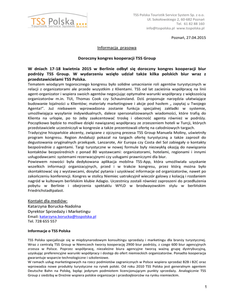 TSS Polska Touristik Service System Sp. z o.o. Ul. Sokołowskiego 2, 60-682 Poznań Tel. 61 82 88 160 [email protected] www.tsspolska.pl Poznań, 27.04.2015 Informacja prasowa Doroczny kongres kooperacji TSS Group W dniach 17-18 kwietnia 2015 w Berlinie odbył się doroczny kongres kooperacji biur podróży TSS Group. W wydarzeniu wzięło udział także kilka polskich biur wraz z przedstawicielami TSS Polska. Tematem wiodącym tegorocznego kongresu było solidne umacnianie roli agentów turystycznych w relacji z organizatorami ale przede wszystkim z Klientami. TSS od lat zacieśnia współpracę na linii agent-organizator i wspiera swoich agentów negocjując optymalne warunki współpracy z większością organizatorów m.in. TUI, Thomas Cook czy Schauinsland. Dziś proponuje narzędzia ułatwiające budowanie lojalności u Klientów; materiały marketingowe i akcje pod hasłem „ zapytaj u Twojego Agenta!”. Już niebawem wprowadzona zostanie funkcja specjalnej zakładki w systemie, umożliwiająca wysyłanie indywidualnych, dalece spersonalizowanych wiadomości, które trafią do Klienta na urlopie, po to żeby zaakcentować troskę i obecność agenta również w podróży. Początkowo będzie to możliwe dzięki nawiązanej współpracy ze zrzeszeniem hoteli w Turcji, których przedstawiciele uczestniczyli w kongresie a także prezentowali ofertę na całodniowych targach. Tradycyjne hiszpańskie akcenty, związane z ojczyzną prezesa TSS Group Manuela Moliny, uświetniły program kongresu. Region Andaluzji pokazał na targach ofertę turystyczną a także zaprosił do degustowania oryginalnych przekąsek. Lanzarote, Air Europa czy Costa del Sol zabiegały o kontakty bezpośrednie z agentami. Targi turystyczne w nowej formule były niezwykłą okazją do nawiązania kontaktów bezpośrednich z ponad 80 wystawcami: organizatorami, hotelami, regionami i innymi usługodawcami: systemami rezerwacyjnymi czy usługami prawniczymi dla biur. Powiewem nowości była dedykowana aplikacja mobilna TSS-App, która umożliwiała uzyskanie wszelkich informacji organizacyjnych, przed i w trakcie kongresu, przez którą można było skontaktować się z wystawcami, dosyłać pytania i uzyskiwać informacje od organizatorów, nawet po zakończeniu konferencji. Kongres w stolicy Niemiec uatrakcyjnił wieczór galowy z kolacją i rozdaniem nagród w kultowym berlińskim klubie Adagio. Uczestnicy zostali również zaproszeni do przedłużenia pobytu w Berlinie i obejrzenia spektaklu WYLD w brodwayowskim stylu w berlińskim Friedrichstadtpalast. Kontakt dla mediów: Katarzyna Borucka-Nadolna Dyrektor Sprzedaży i Marketingu Email: [email protected] Tel. 728 655 557 Informacje o TSS Polska TSS Polska specjalizuje się w międzynarodowym konsultingu sprzedaży i marketingu dla branży turystycznej. Wraz z centralą TSS Group w Niemczech tworzy kooperację 2900 biur podróży, z czego 600 biur agencyjnych zrzesza w Polsce. Poprzez współpracę, niezależne biura agencyjne tworzą ważną grupę dystrybucyjną, uzyskując preferencyjne warunki współpracy i dostęp do ofert niemieckich organizatorów. Ponadto kooperacja gwarantuje wsparcie technologiczne i szkoleniowe. W ramach usług marketingowych na rzecz podmiotów zagranicznych w Polsce wspiera sprzedaż B2B i B2C oraz wprowadza nowe produkty turystyczne na rynek polski. Od roku 2010 TSS Polska jest generalnym agentem Deutsche Bahn na Polskę, będąc jedynym podmiotem licencjonującym punkty sprzedaży. Analogicznie TSS Group z siedzibą w Dreźnie wspiera polskie organizacje i przedsiębiorców na rynku niemieckim. 1