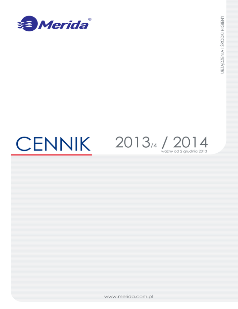URZĄDZENIA I ŚRODKI HIGIENY CENNIK 2013 / 2014 /4 ważny od 2 grudnia 2013 www.merida.com.pl MERIDA sp. z o.o. WŁASNA SIEĆ SPRZEDAŻY Centrala: 53-015 Wrocław, Karkonoska 59, tel. 71 33 97 888, fax 71 361 61 61, e-mail: [email protected] Oddziały: 15-620 Białystok, ul. Elewatorska 13, tel./fax 85 653 91 90, e-mail: [email protected] 43-300 Bielsko-Biała, ul. Konwaliowa 21, tel./fax 33 496 69 89, e-mail: [email protected] 85-147 Bydgoszcz, ul. Dąbrowa 52, tel./fax 52 361 50 31, 52 363 21 82, e-mail: [email protected] 42-204 Częstochowa, ul. Krakowska 45, tel./fax 34 361 29 82, e-mail: [email protected] 82-300 Elbląg, ul. Grunwaldzka 2 bud. E, tel./fax 55 237 91 61, e-mail: [email protected] 81-061 Gdynia , ul. Hutnicza 40, tel./fax 58 660 32 77, 58 660 32 78, e-mail: [email protected] 66-400 Gorzów Wlkp., ul. Fabryczna 71, tel./fax 95 728 80 90, e-mail: [email protected] 58-506 Jelenia Góra, ul. Jana Pawła II 33, tel./fax 75 64 38 507, e-mail: [email protected] 40-203 Katowice, Al. Roździeńskiego 170, tel./fax 32 206 54 11 (12), e-mail: [email protected] 25-670 Kielce, ul. Zakładowa 16 E, tel./fax 41 362 93 75, 41 361 58 46, e-mail: [email protected] 75-848 Koszalin, ul. Lubuszan 3, tel./fax 94 342 30 54, e-mail: [email protected] 30-740 Kraków, ul. Półłanki 29G, tel. 12 632 41 38, tel. kom. 693 230 118, e-mail: [email protected] 59-220 Legnica, ul. Poznańska 29G, tel./fax 76 854 32 99, e-mail: [email protected] 64-100 Leszno, ul. Wolińska 19, tel./fax 65 520 96 70, e-mail: [email protected] 20-704 Lublin, ul. Wojciechowska 27, tel./fax 81 533 16 50, e-mail: [email protected] 92-333 Łódź, ul. Wydawnicza 1/3, tel./fax 42 678 54 58, e-mail: [email protected] 33-300 Nowy Sącz, ul. Mickiewicza 1, tel./fax 18 444 13 24, e-mail: [email protected] 10-416 Olsztyn, ul. Towarowa 17K, tel./fax 89 535 84 91, e-mail: [email protected] 45-123 Opole, ul. Budowlanych 46b, tel./fax 77 454 99 55, e-mail: [email protected] 63-400 Ostrów Wlkp., ul. Odolanowska 52, tel./fax 62 73 54 533, e-mail: [email protected] 64-920 Piła, ul. Podchorążych 10, tel./fax 67 213 74 26, e-mail: [email protected] 09-402 Płock, ul. Graniczna 46, tel./fax 24 268 71 55, 24 269 65 92, e-mail: [email protected] 60-476 Poznań, ul. Druskienicka 8/10, tel./fax 61 823 34 71, e-mail: [email protected] 26-613 Radom, Al. Wojska Polskiego 48, tel./fax 48 384 77 35, e-mail: [email protected] 35-234 Rzeszów, ul. Trembeckiego 11, tel./fax 17 852 61 86, e-mail: [email protected] 70-784 Szczecin, ul. Struga 44, tel./fax 91 46 44 875, e-mail: [email protected] 87-100 Toruń, Szosa Chełmińska 90, tel./fax 56 622 18 46, e-mail: [email protected] 58-300 Wałbrzych, ul. Chrobrego 16, tel./fax 74 84 23 260, e-mail: [email protected] 02-281 Warszawa, ul. Municypalna 47, tel. 22 868 31 09, fax 22 846 10 87, e-mail: [email protected] 53-015 Wrocław, Karkonoska 59, tel./fax 71 787 60 20, 71 787 60 22, e-mail: [email protected] 65-775 Zielona Góra, ul. Zacisze 22, tel./fax 68 320 34 82, e-mail: [email protected] www.merida.com.pl NASZE PROMOCJE jednostka sprzedaży opis symbol cena netto stawka VAT cena brutto LINIA MERIDA TOP Dozownik mydła w pianie MERIDA TOP - do stosowania z mydłem w pianie MERIDA BALI PLUS, BALI LUX, BALI LUX BEZWONNE i BALI DEZYNFEKUJĄCE - mydło dozowane w postaci niebywale delikatnej piany z niebieskim okienkiem DF3TN 79,00 97,17 z szarym okienkiem DF3TS 79,00 97,17 M12P 15,70 19,31 M13P 19,90 M13XP 19,90 24,48 M14P 19,90 24,48 DN1TN 107,50 Mydło w pianie MERIDA BALI PLUS jednorazowy wkład z pompką spieniającą - bardzo wydajne - ok. 2000 porcji piany z jednego wkładu Mydło w pianie MERIDA BALI LUX 1.1 jednorazowy wkład z pompką spieniającą - bardzo wydajne - ok. 2000 porcji piany z jednego wkładu 1 szt. Mydło w pianie MERIDA BALI LUX BEZWONNE jednorazowy wkład z pompką spieniającą - bardzo wydajne - ok. 2000 porcji piany z jednego wkładu 23 % 24,48 Mydło w pianie MERIDA BALI DEZYNFEKUJĄCE Mydło w pianie o silnym działaniu bakteriobójczym potwierdzonym przez szereg bdań klinicznych. jednorazowy wkład z pompką spieniającą - bardzo wydajne - ok. 2000 porcji piany z jednego wkładu Dozownik mydła w płynie MERIDA TOP 1.2 - pojemność zbiornika 800 ml - mydło uzupełniane z kanistra Dozownik mydła w płynie MERIDA TOP MINI 1.3 - pojemność zbiornika 400 ml - mydło uzupełniane z kanistra Dozownik płynu dezynfekcyjnego w sprayu MERIDA TOP 1.4 1.5 - dozuje płyn dezynfekcyjny w postaci aerozolu, równomiernie pokrywającego dłonie - pojemność wymiennych wkładów 1000 ml Pojemnik na pojedyncze ręczniki papierowe MERIDA TOP MAXI z niebieskim okienkiem 1 szt. z szarym okienkiem z niebieskim okienkiem z czerwonym okienkiem 1 szt. z niebieskim okienkiem z szarym okienkiem 1.6 z niebieskim okienkiem z szarym okienkiem 1.7 1.8 1.9 1.10 1.11 - wyposażony w mechanizm pozwalający wysunąć kolejne porcje ręcznika o długości listka 27,5 cm Mechaniczny podajnik ręczników papierowych w rolach MERIDA TOP MINI - wyposażony w mechanizm pozwalający wysunąć kolejne porcje ręcznika o długości listka 27,5 cm - możliwość użycia ręcznika papierowego w rolce o maksymalnej średnicy 20.5 cm i maksymalnej wysokości 23 cm Pojemnik na ręczniki papierowe w rolach MERIDA TOP MINI - możliwość użycia ręcznika papierowego w rolce o maksymalnej średnicy 14.4 cm i maksymalnej wysokości 23 cm 1.13 - pojemność 40 litrów - mocowany do ściany - dostosowany do jednorazowych worków o poj. 60 l Elektryczna suszarka do rąk MERIDA TOP - moc wyjściowa 1100 W Pojemnik na papier toaletowy MERIDA TOP MEGA 1.14 - dostosowany do papieru o maksymalnej średnicy roli 28 cm 4 więcej na www.merida.com.pl 75,00 z szarym okienkiem z niebieskim okienkiem DN2TS 75,00 DS1TC 107,80 PZ1TN 103,40 1 szt. z niebieskim okienkiem PZ1TS 103,40 PZ2TN 98,50 z niebieskim okienkiem PZ2TS 98,50 CTN301 295,00 z niebieskimi elementami CTS301 295,00 CTN401 275,00 w komplecie niebieskie i szare ok