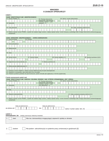 ZUS Z-15 ZAKŁAD UBEZPIECZEŃ SPOŁECZNYCH WNIOSEK O ZASIŁEK OPIEKUŃCZY CZĘŚĆ I: DANE IDENTYFIKACYJNE UBEZPIECZONEGO 01. Numer PESEL (1) 04. Nazwisko 02. Rodzaj dokumentu tożsamości: jeśli dowód osobisty, wpisać 1, jeśli paszport – 2 03. Seria i numer dokumentu 05. Imię pierwsze 06. Data urodzenia (dd/mm/rrrr) (1) Należy wpisać numer PESEL, a jeżeli nie nadano tego numeru, należy wpisać serię i numer dowodu osobistego albo innego dokumentu potwierdzającego tożsamość. DANE ADRESOWE UBEZPIECZONEGO – ADRES ZAMIESZKANIA 01. Kod pocztowy 02. Poczta – 03. Gmina/Dzielnica 04. Miejscowość 05. Ulica 06. Numer domu 07. Numer lokalu 10. Zagraniczny kod pocztowy (2) 08. Numer telefonu (1) 09. Symbol państwa (2)(3) 11. Nazwa państwa (2) 12. Adres poczty elektronicznej (1) (1) Podanie numeru telefonu i adresu poczty elektronicznej nie jest obowiązkowe. (2) Wypełnić w przypadku, gdy adres jest inny niż polski. (3) Podanie symbolu państwa nie jest konieczne, jeżeli wniosek jest zgłaszany w formie papierowej. Z tytułu sprawowania opieki nad: DANE IDENTYFIKACYJNE DZIECKA / CZŁONKA RODZINY, NAD KTÓRYM SPRAWOWANA JEST OPIEKA 01. Numer PESEL (1) 03. Seria i numer dokumentu 02. Rodzaj dokumentu tożsamości: jeśli dowód osobisty, wpisać 1, jeśli 04. Nazwisko inny dokument – 2 05. Imię 06. Stopień pokrewieństwa 07. Data urodzenia dziecka (dd/mm/rrrr) (1) Należy wpisać numer PESEL, a jeżeli nie nadano tego numeru, należy wpisać serię i numer dowodu osobistego albo innego dokumentu potwierdzającego tożsamość. Data od (dd/mm/rrrr) za okres od: Data do (dd/mm/rrrr) do: seria i numer zaśw. lek. [1] . . . . . . . . . . . . . . . . . CZĘŚĆ II: Oświadczam, że: (należy zaznaczyć właściwy kwadrat) 1. Jest Nie ma domownik(a) mogący(ego) zapewnić opiekę w okresie ..................................................................................................... 2. Jestem Nie jestem zatrudniony(a) w systemie pracy zmianowej w godzinach [2] ..................................................................................................... strona: 1/4 ZUS Z-15 ZAKŁAD UBEZPIECZEŃ SPOŁECZNYCH 3. Matka/ojciec dziecka 1) małżonek/małżonka: pracuje nie pracuje 2) jeśli pracuje to, czy wykonuje pracę w systemie pracy zmianowej: TAK NIE Jeżeli TAK, podać w jakich godzinach: . . . . . . . . . . . . . . . . . . . . . . . . . . . . . . . . . . . . . . . . . . . . . . . . . . . . . . . . . . . . . . . . . . . . 4. W danym roku kalendarzowym wypłacono mi zasiłek opiekuńczy z tytułu poprzedniego ubezpieczenia: (należy zaznaczyć właściwy kwadrat) TAK NIE z tytułu opieki nad dziećmi w wieku do 14 lat za . . . . . . . . dni z tytułu opieki nad chorymi dziećmi w wieku powyżej 14 lat lub chorym członkiem rodziny za . . . . . . . dni NAZWA I ADRES POPRZEDNIEGO PŁATNIKA SKŁADEK: Nazwa płatnika składek: ......................................................................................................... Kod pocztowy: – Poczta: ...................................................................................... Gmina/Dzielnica: ......................................................................................................... Miejscowość: ......................................................................................................... Ulica: ......................................................................................................... Numer domu: ................. Numer lokalu: Symbol państwa: (1) (2) ...................... Zagraniczny kod pocztowy: (1) Nazwa państwa: (1) .................................... (1) Wypełnić w przypadku, gdy adres jest inny niż polski. (2) Podanie symbolu państwa nie jest konieczne, jeżeli wniosek jest zgłaszany w formie papierowej. 5. W danym roku kalendarzowym: (należy zaznaczyć właściwy kwadrat) matka dziecka ojciec dziecka małżonek/małżonka DANE WYMIENIONEJ OSOBY: Numer PESEL: (1) Rodzaj dokumentu tożsamości: jeśli dowód osobisty, wpisać 1, jeśli inny dokument – 2 Seria i numer dokumentu: Nazwisko: ........................................................................................................ Imię: ........................................................................................................ (1) Należy wpisać numer PESEL, a jeżeli nie nadano tego numeru, należy wpisać serię i numer dowodu osobistego albo innego dokumentu potwierdzającego tożsamość. pobrał(a) zasiłek opiekuńczy: TAK NIE (należy zaznaczyć właściwy kwadrat) z tytułu opieki nad dziećmi w wieku do 14 lat za . . . . . . . . dni z tytułu opieki nad chorymi dziećmi w wieku powyżej 14 lat lub chorym członkiem rodziny za . . . . . . . dni strona: 2/4 ZUS Z-15 ZAKŁAD UBEZPIECZEŃ SPOŁECZNYCH NAZWA I ADRES PŁATNIKA SKŁADEK WYMIENIONEJ OSOBY: Nazwa płatnika składek: ......................................................................................................... Kod pocztowy: – Poczta: ...................................................................................... Gmina/Dzielnica: ......................................................................................................... Miejscowość: ......................................................................................................... Ulica: ......................................................................................................... Numer domu: Numer lokalu: ................. Symbol państwa: (1) (2) ...................... Zagraniczny kod pocztowy: (1) Nazwa państwa: (1) ..................................... (1) Wypełnić w przypadku, gdy adres jest inny niż polski. (2) Podanie symbolu państwa nie jest konieczne, jeżeli wniosek jest zgłaszany w formie papierowej. 6. W danym roku kalendarzowym inny członek rodziny: DANE CZŁONKA RODZINY: 01. Numer PESEL: (1) 03. Seria i numer dokumentu: 02. Rodzaj dokumentu tożsamości: jeśli dowód osobisty,