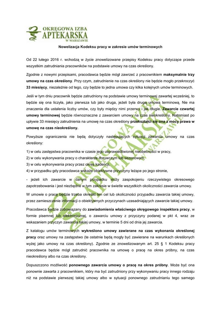 Nowelizacja Kodeksu pracy w zakresie umów terminowych Od 22